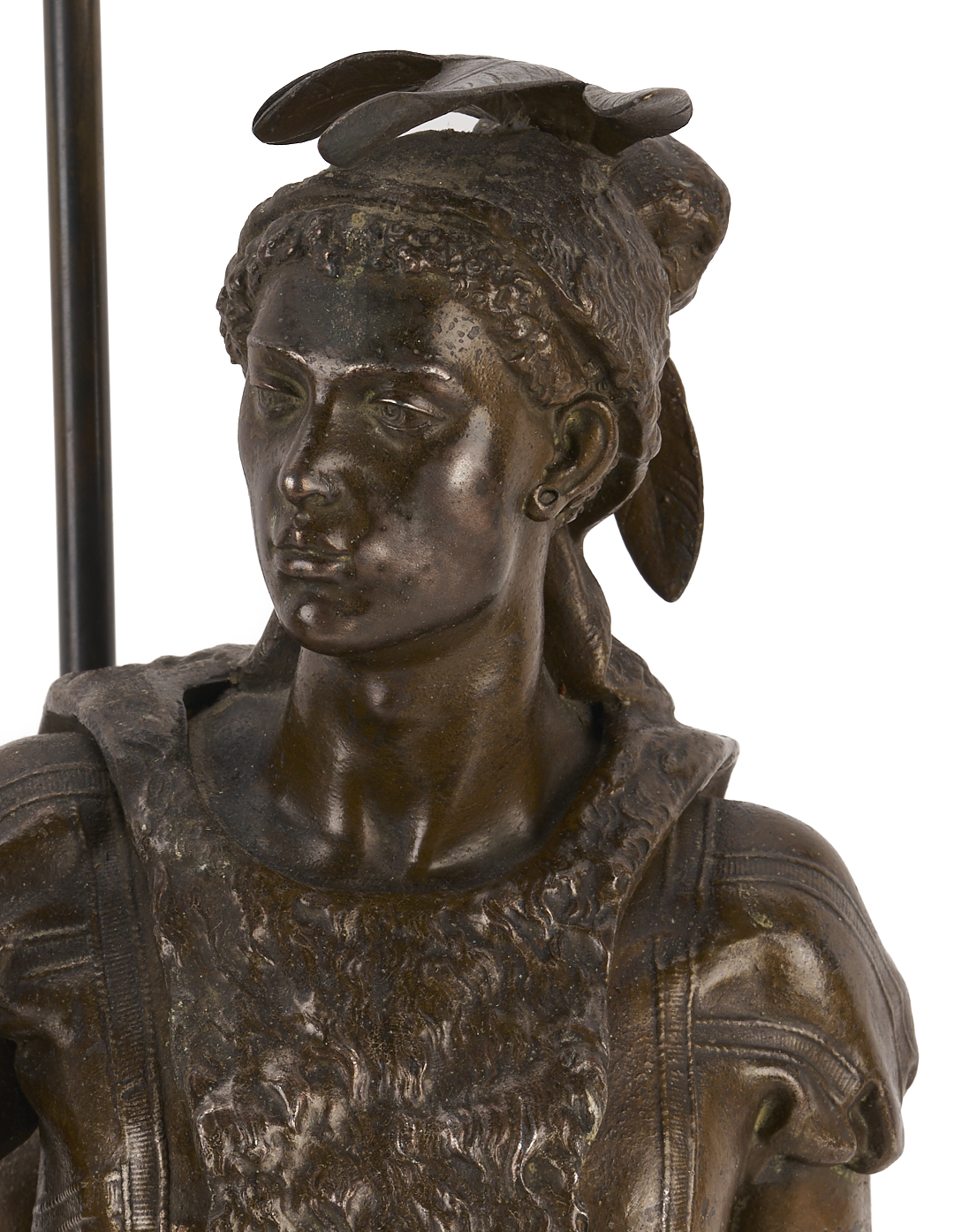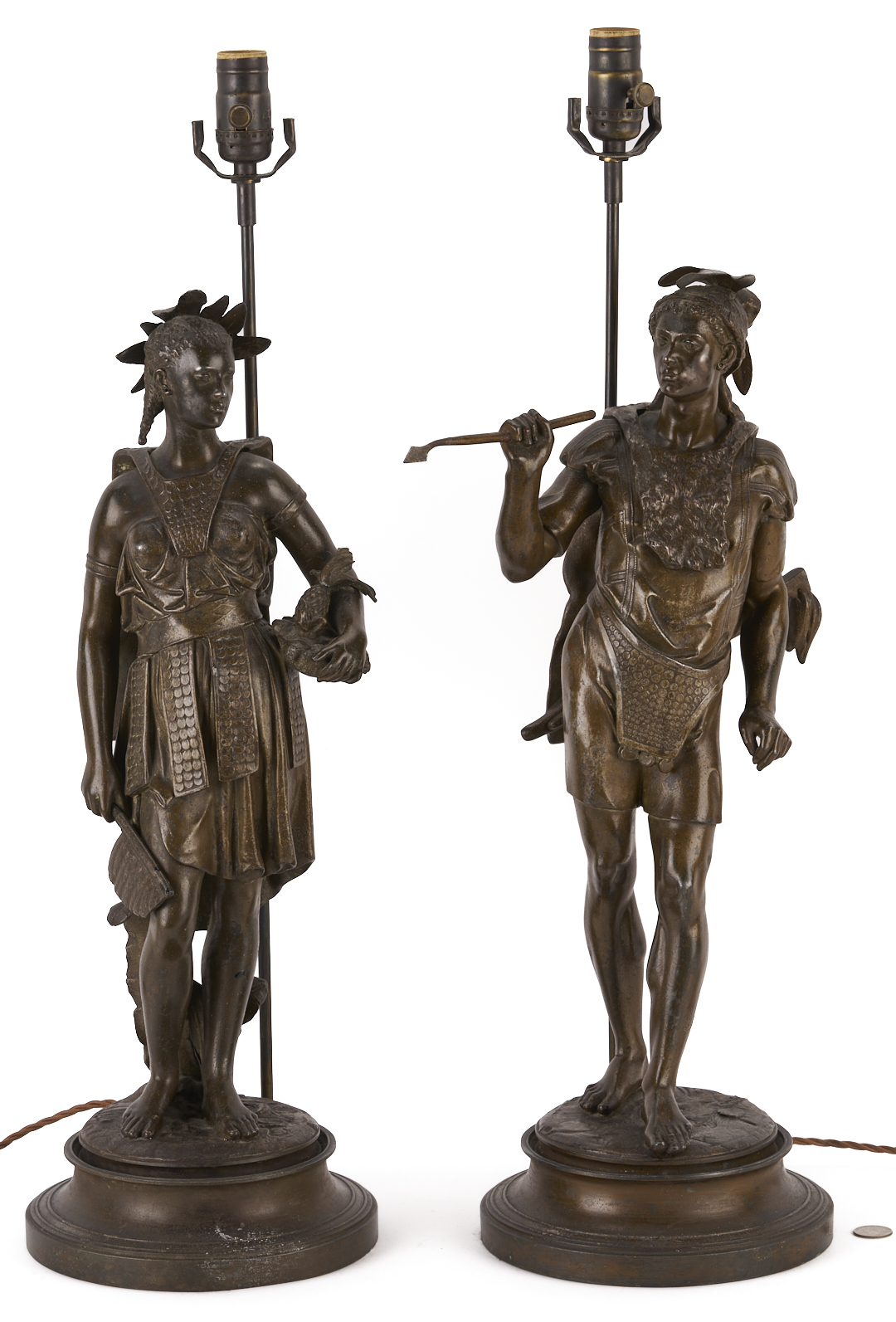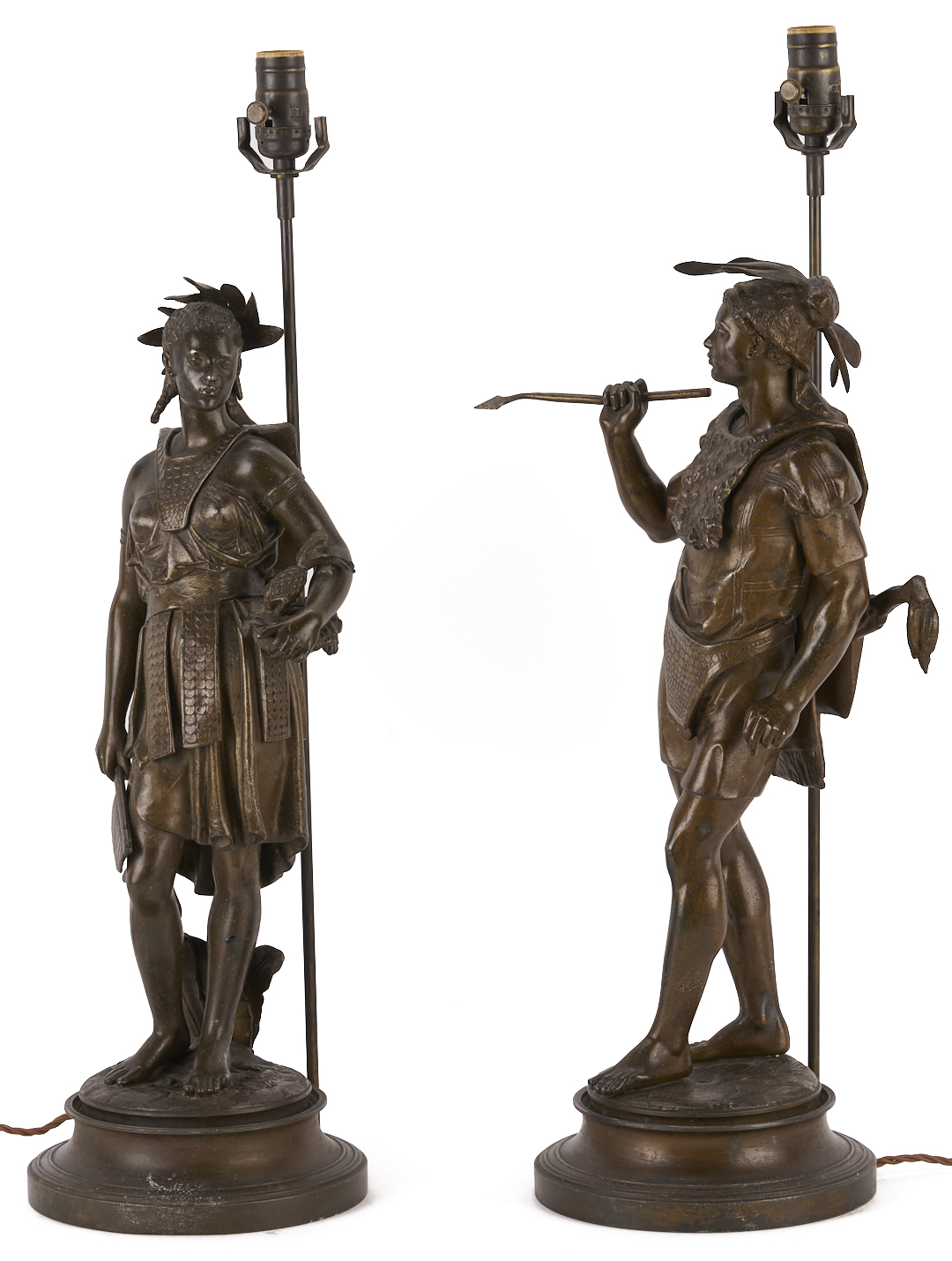 Two (2) figural lamps, spelter with bronze patina, depicting a Native American man and woman, after “Warriors of the Americas” by Jean Jules Bernard Salmson (French, 1823-1902). Each inscribed “Salmson” to the base. Both lamps: Approx. 28 3/4 in. H with base and lighting fixtures. Both bases: 8 1/2 in. Dia. Male figure without base and fixture: 22 in. H x 13 in. W. Female figure without base and fixture: 21 in. H x 7 in. W. 20th century.