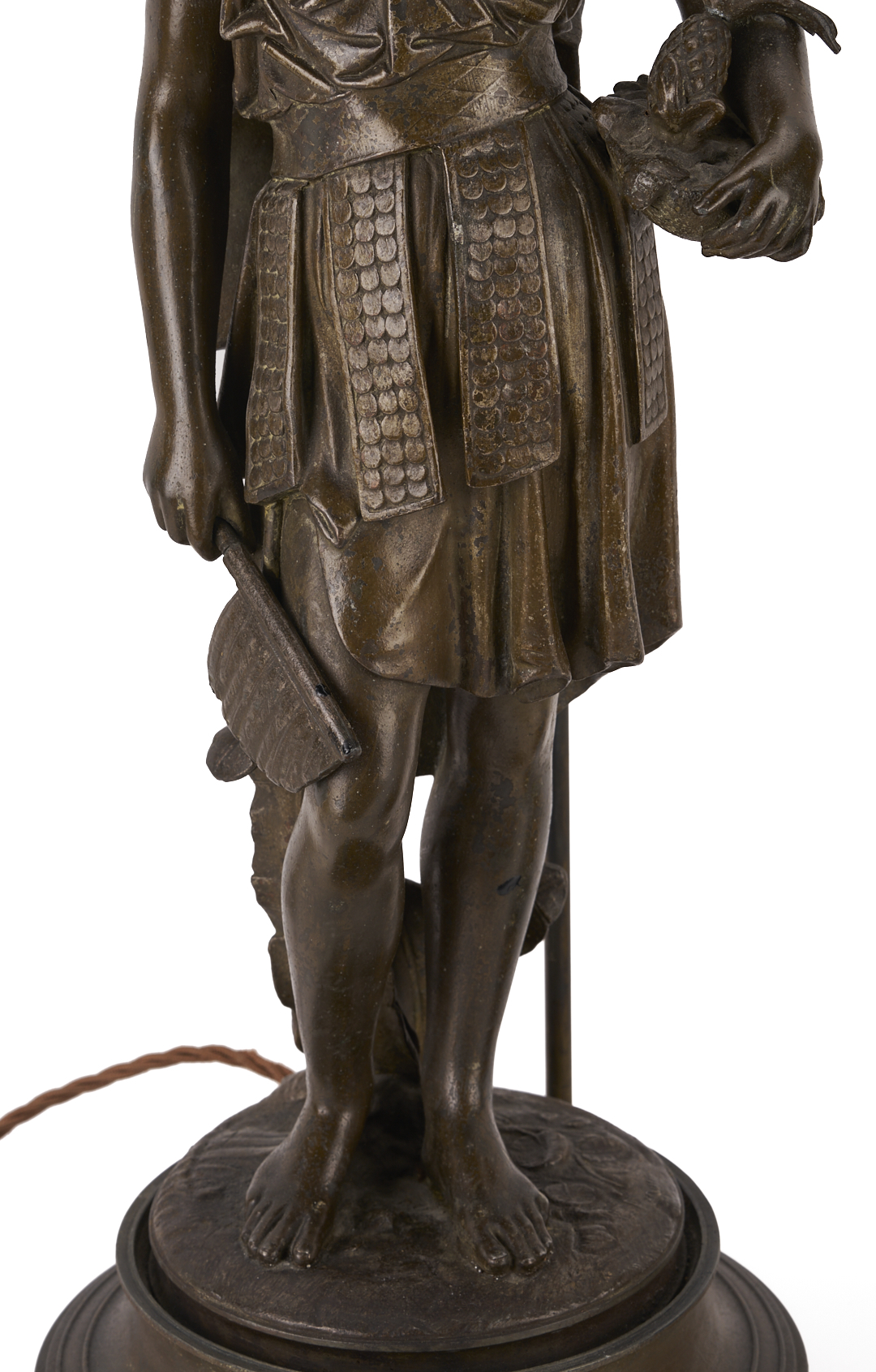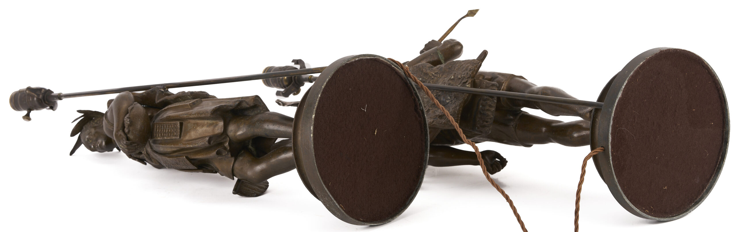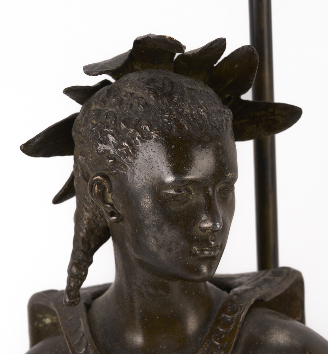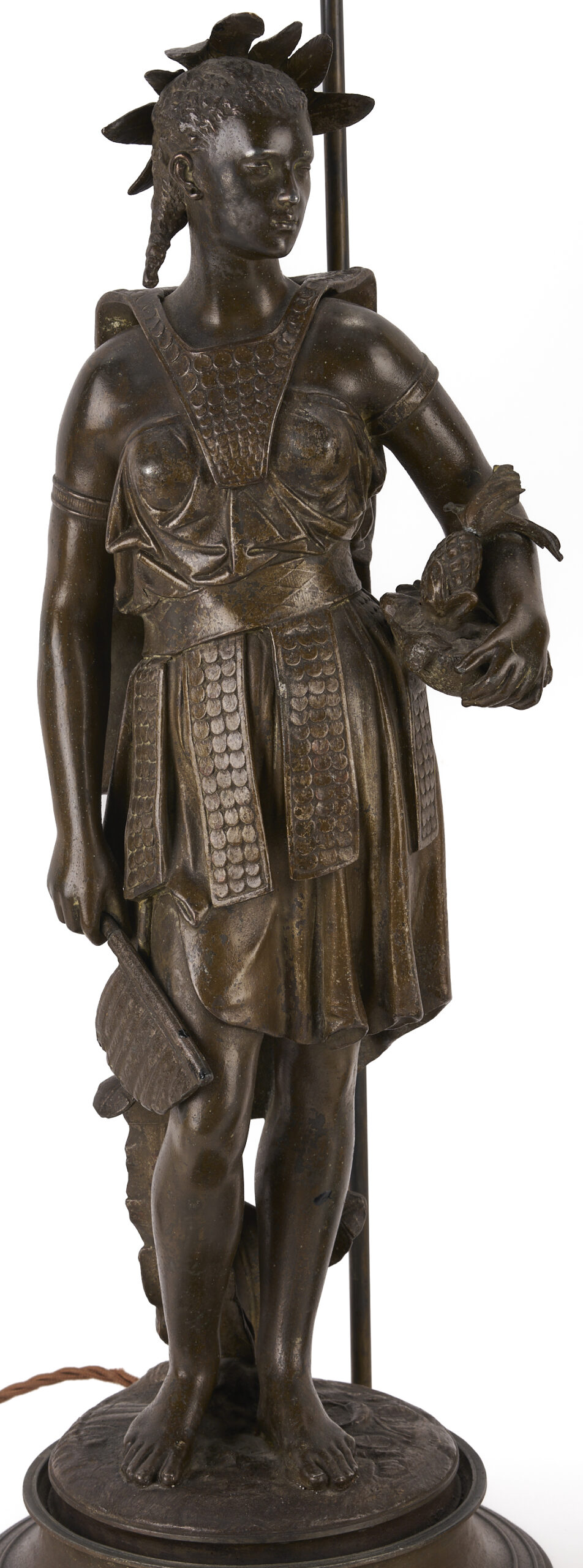 Two (2) figural lamps, spelter with bronze patina, depicting a Native American man and woman, after “Warriors of the Americas” by Jean Jules Bernard Salmson (French, 1823-1902). Each inscribed “Salmson” to the base. Both lamps: Approx. 28 3/4 in. H with base and lighting fixtures. Both bases: 8 1/2 in. Dia. Male figure without base and fixture: 22 in. H x 13 in. W. Female figure without base and fixture: 21 in. H x 7 in. W. 20th century.
