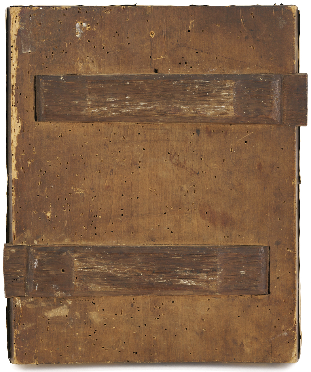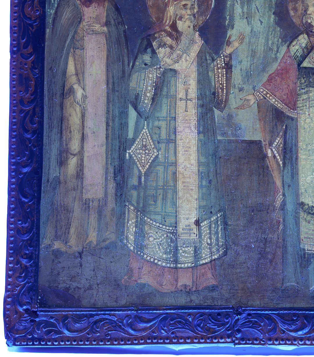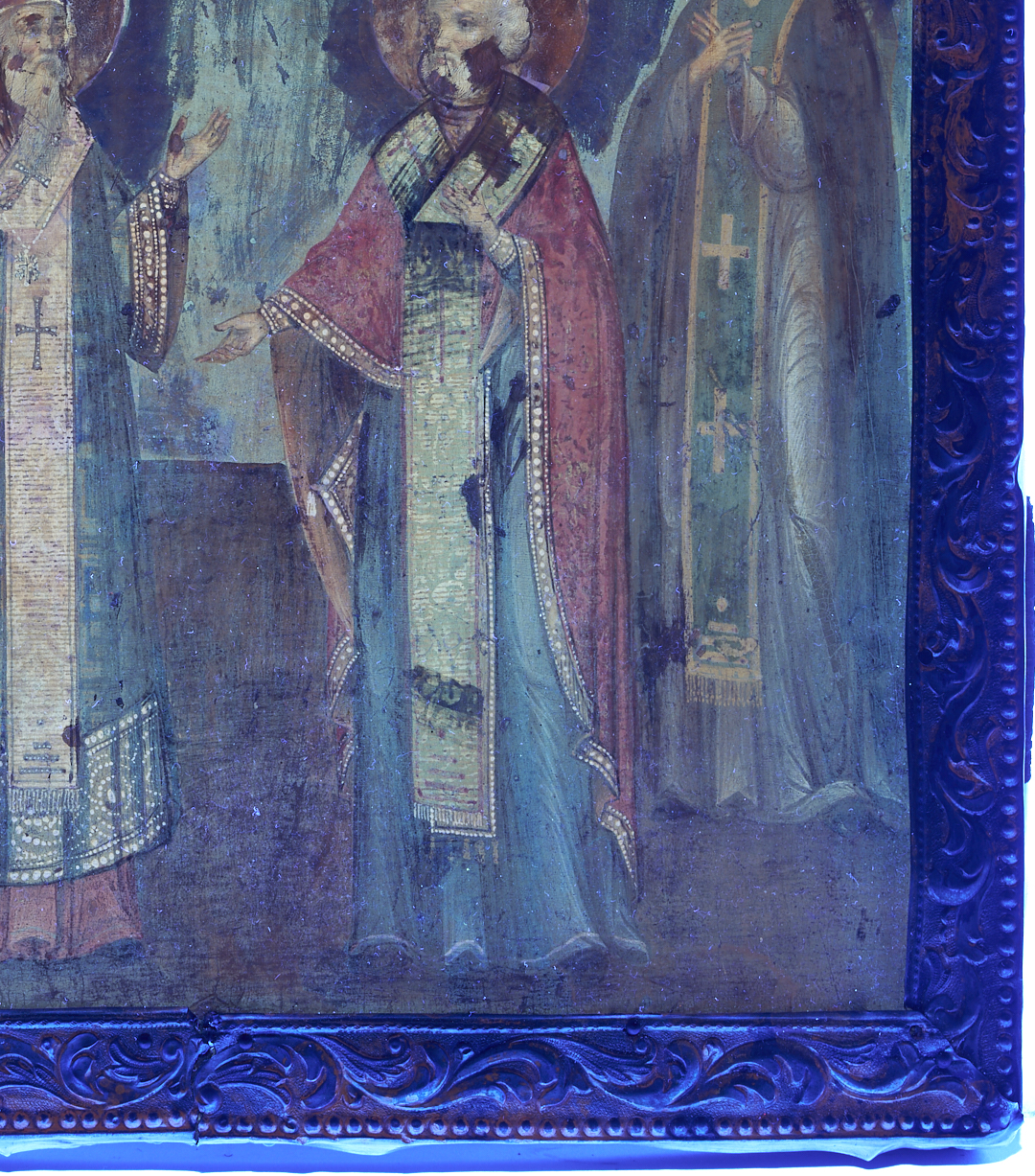 Overall excellent condition with small separations on the border and wear on the back of the panel. UV light reveals inpainting from more than one occasion located around the haloes of each saint, along the border, and in scattered sections of the saints’ clothing.