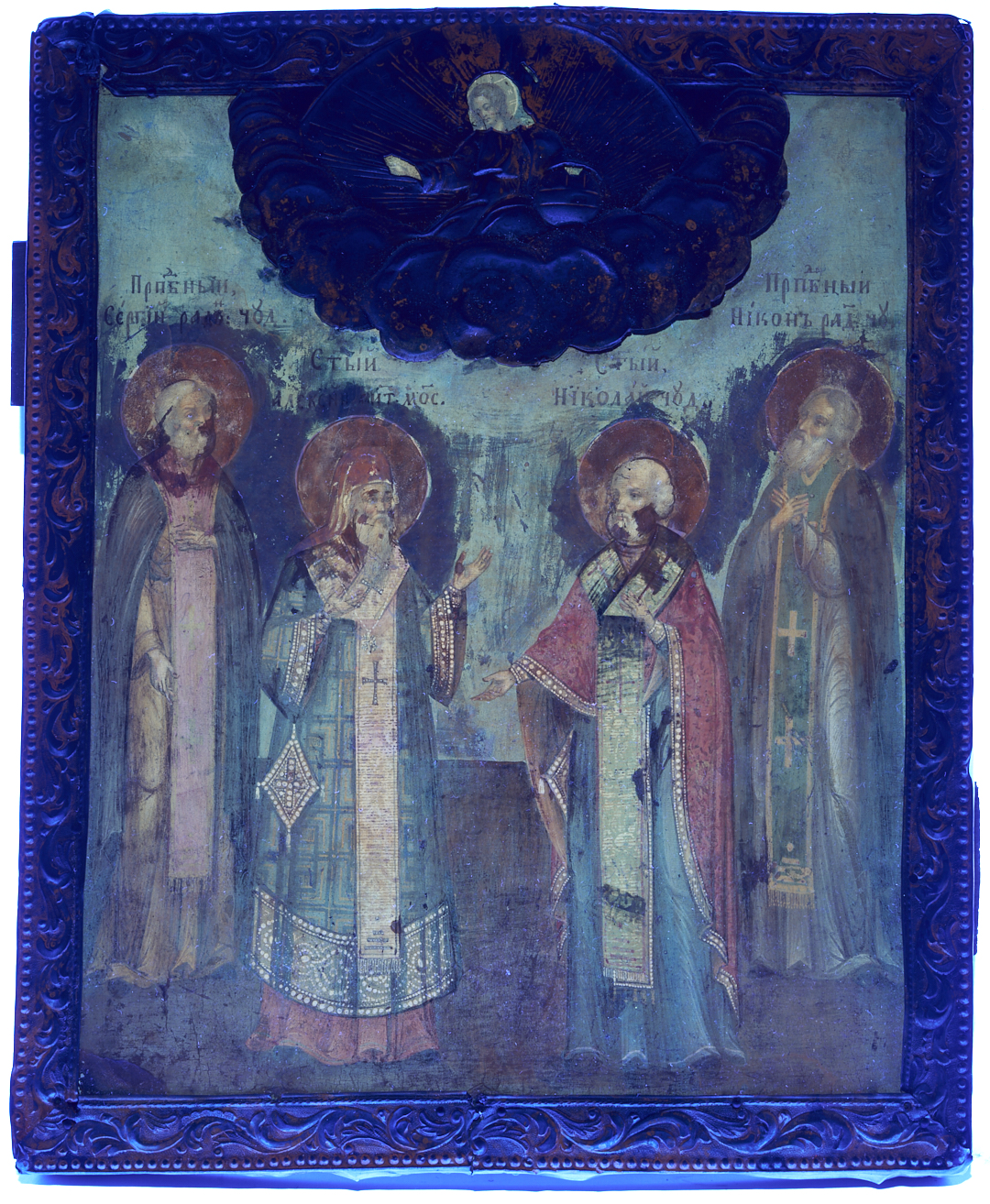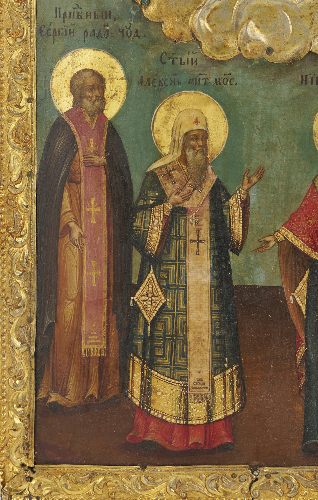 Russian Orthodox oil on board panel depicting Saints of Moscow and Saint Nicholas, watched over by a depiction of Christ surrounded by a gilt metal representation of heaven, integrated with the foliate oklad border. The Saints represented in the scene are Sergius of Radonezh (b. 1314), Alexei of Moscow (b. 1292), Nikon-Abbot of Radonezh (b. 1355), and Saint Nicholas (b. 270). 12 in. H x 10 in. W. 19th century.