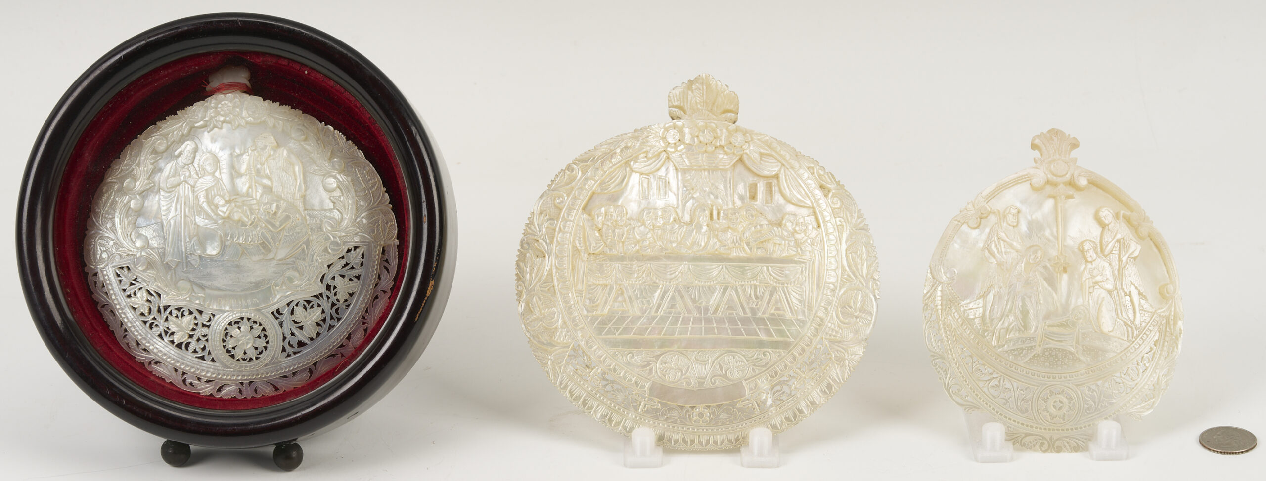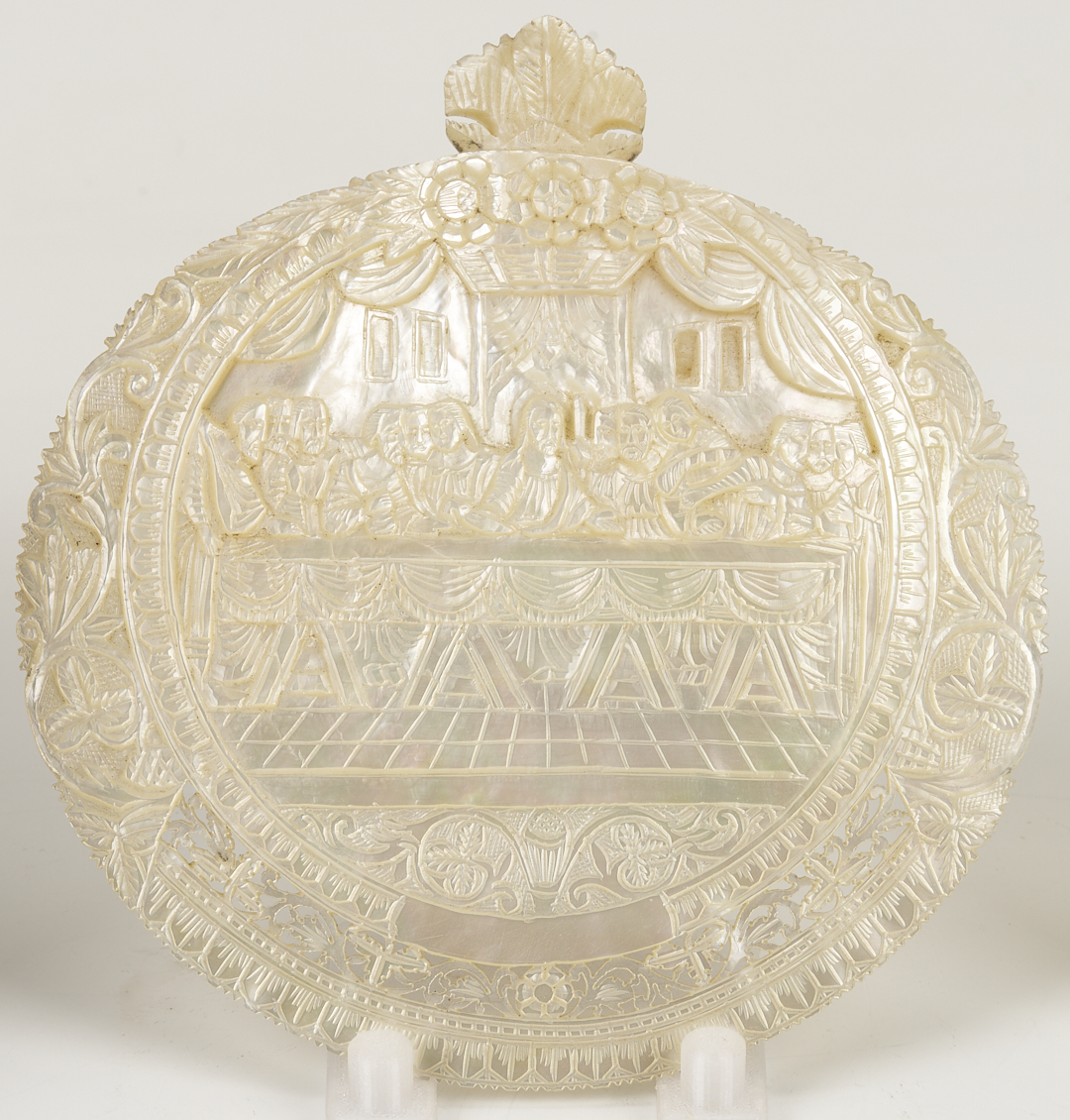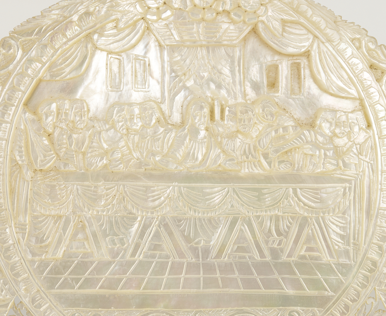 Three (3) Mother of Pearl carved shell plaques. Two (2) depict Bethlehem Nativity scenes, including one housed under glass in an ebonized round shadowbox tabletop frame. One (1) depicts the Last Supper with Christ and his disciples seated at a long table. All with ornate pierced borders. Ranging in size from 4 1/2 in. x 5 1/2 in. to 6 in. x 6 in. Frame 7 in .x 7 in. Late 19th to early 20th century.