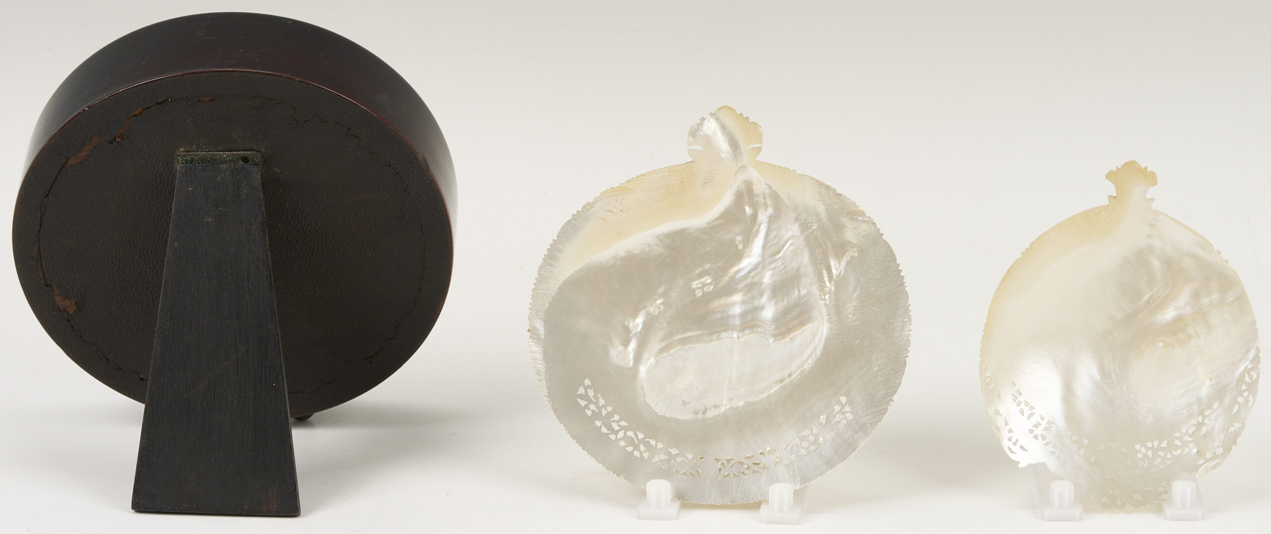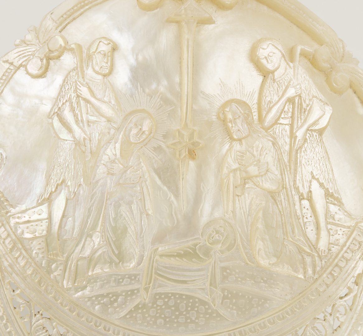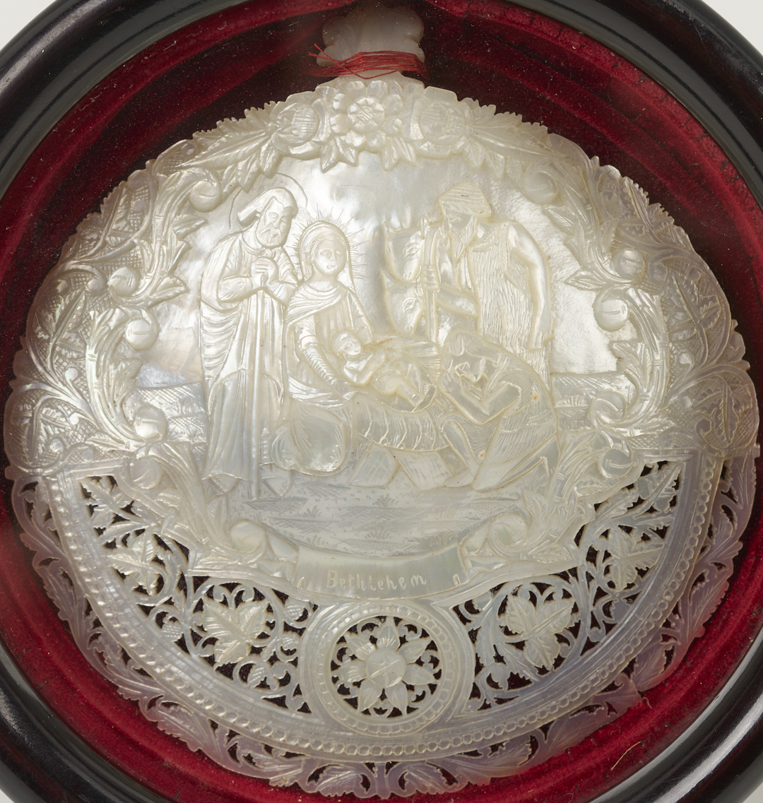 Three (3) Mother of Pearl carved shell plaques. Two (2) depict Bethlehem Nativity scenes, including one housed under glass in an ebonized round shadowbox tabletop frame. One (1) depicts the Last Supper with Christ and his disciples seated at a long table. All with ornate pierced borders. Ranging in size from 4 1/2 in. x 5 1/2 in. to 6 in. x 6 in. Frame 7 in .x 7 in. Late 19th to early 20th century.