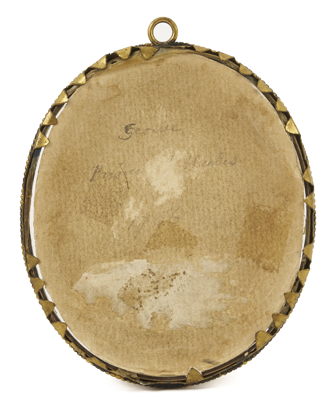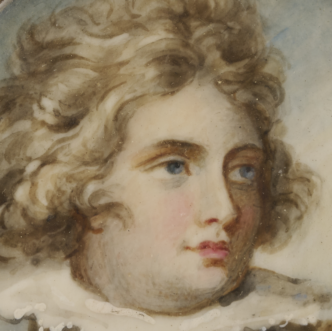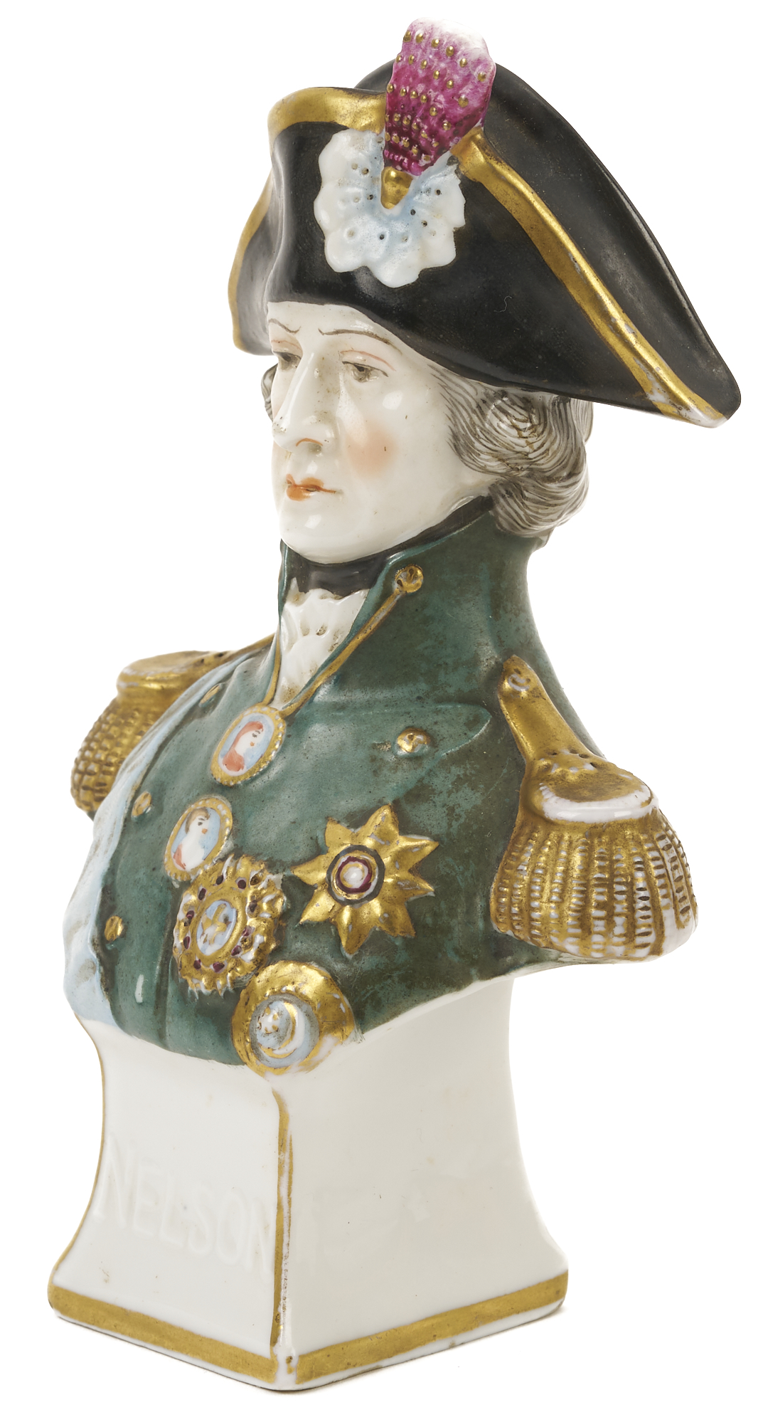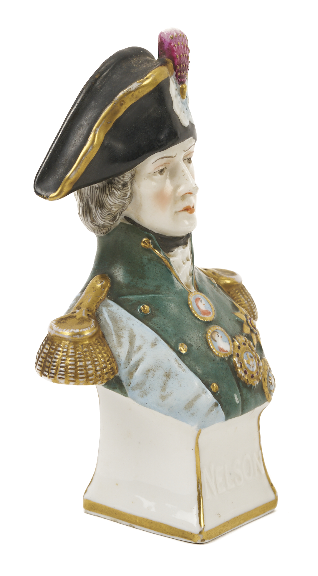 1st item: Miniature Capodimonte porcelain portrait bust of Admiral Lord Nelson, housed in a wood and glass curio or showcase having a lift top and four bun feet. Bust 5 1/4 in. H. Case: 11 in H x 9 in W x 5 in. D. 2nd item: Miniature oval watercolor on wafer portrait of young King George IV, in a thin gold metal frame, 2 7/8 in. H x 2 1/4 in. W overall. 3rd item: Miniature oval watercolor on porcelain portrait of Queen Louise of Denmark, housed in a gold metal Rococo style easel frame, 4 1/2 in. H 3 1/2 in. W overall. Also included are two small gold metallic tassels, possibly from epaulets. All items are 19th century.