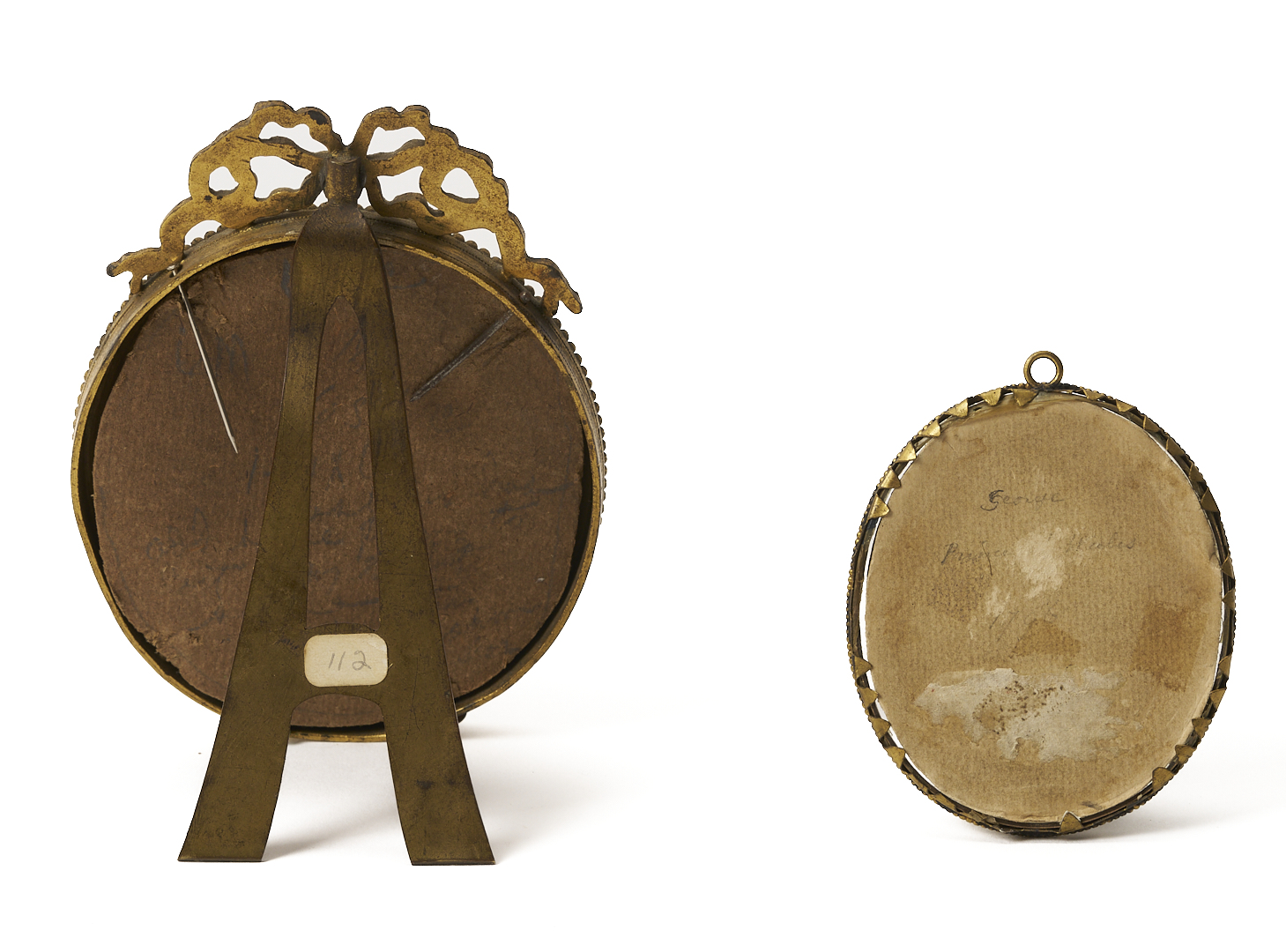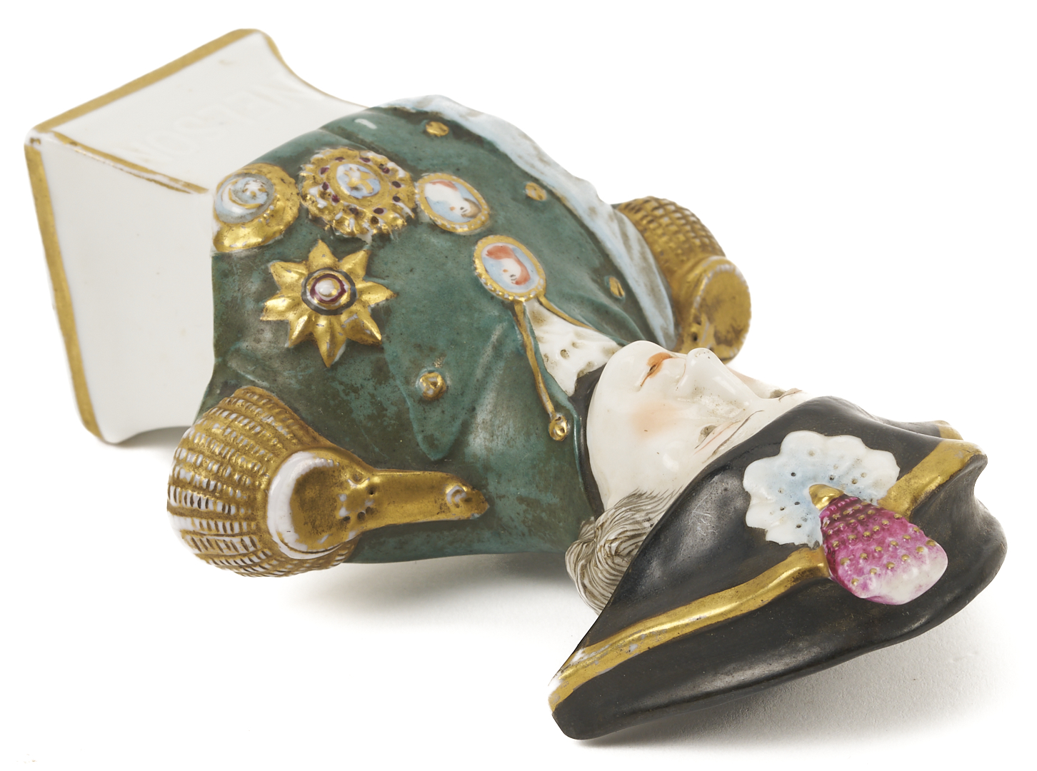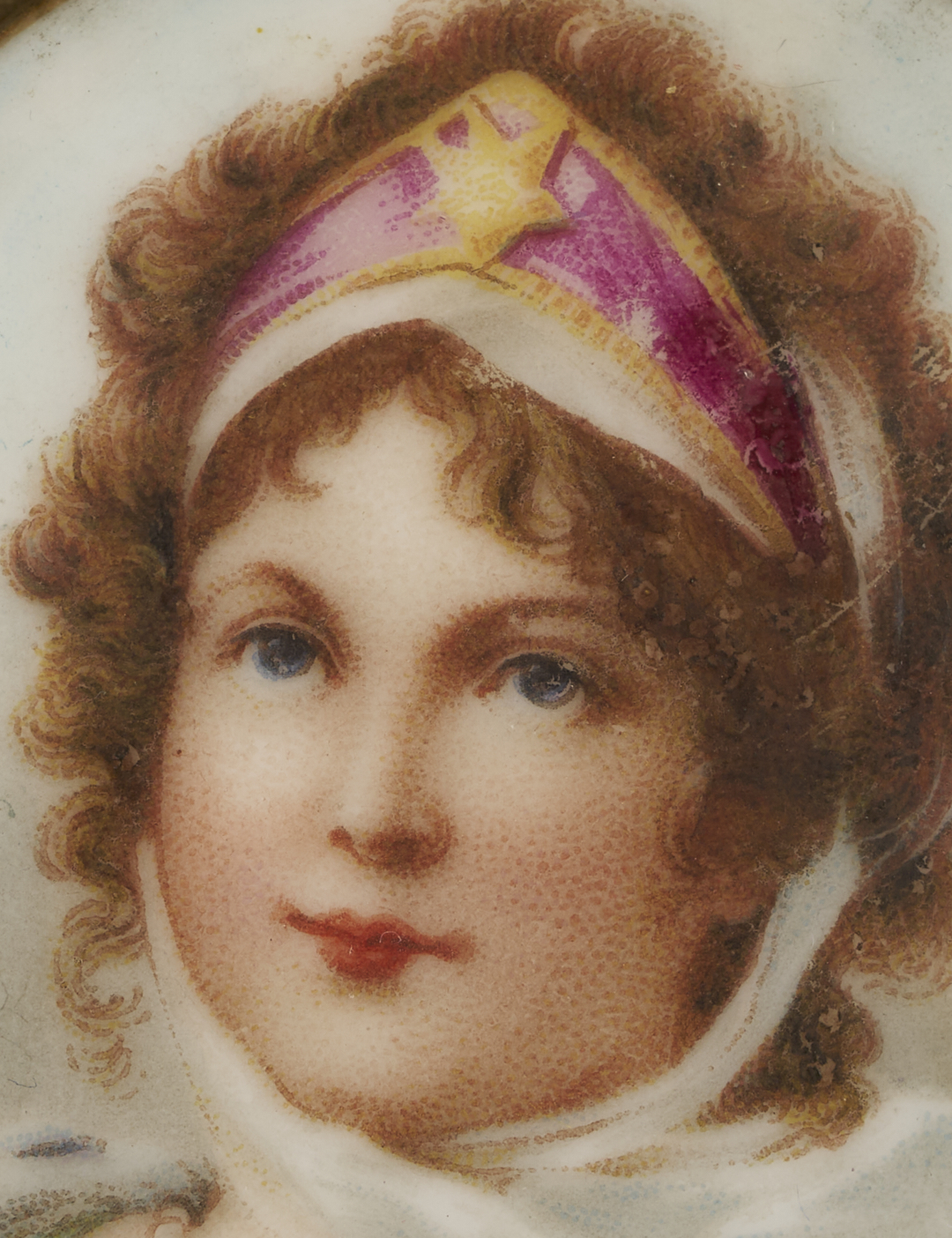 1st item: Miniature Capodimonte porcelain portrait bust of Admiral Lord Nelson, housed in a wood and glass curio or showcase having a lift top and four bun feet. Bust 5 1/4 in. H. Case: 11 in H x 9 in W x 5 in. D. 2nd item: Miniature oval watercolor on wafer portrait of young King George IV, in a thin gold metal frame, 2 7/8 in. H x 2 1/4 in. W overall. 3rd item: Miniature oval watercolor on porcelain portrait of Queen Louise of Denmark, housed in a gold metal Rococo style easel frame, 4 1/2 in. H 3 1/2 in. W overall. Also included are two small gold metallic tassels, possibly from epaulets. All items are 19th century.