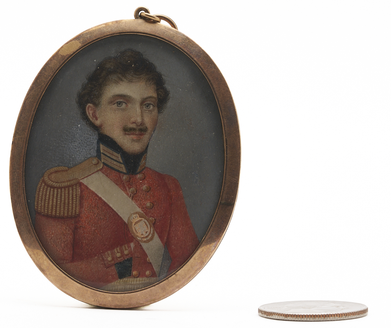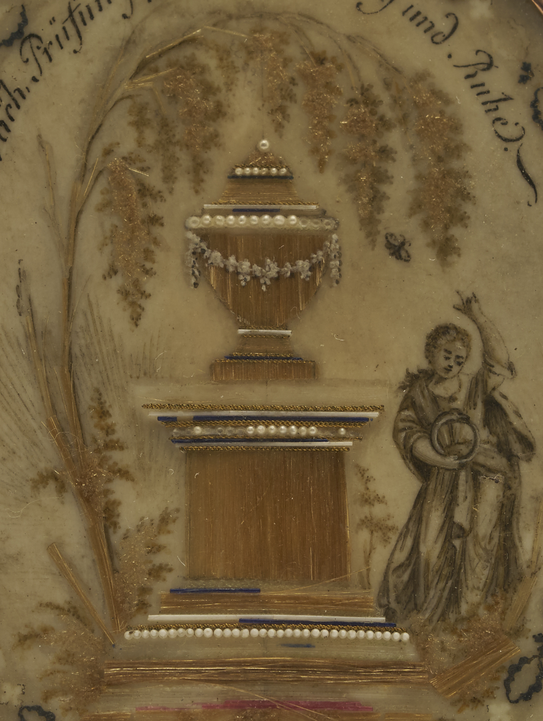 Mourning Portrait Miniature of a Soldier, with Hairwork Memorial to reverse. The soldier, who appears to be in his 20s or 30s, is depicted bust length in three quarter view, wearing a moustache and red uniform with his right hand in his coat, against an indistinct gray background. To the reverse is a memorial picture featuring a woman holding a ring and standing beside a pedestal and Neoclassical urn, under the shade of a weeping willow branch. The urn, pedestal and branch appear to be made of chopped hair and/or gold thread, embellished with seed pearls, while the woman is rendered in watercolor, as is the repeating medallion border and inscription, “Nach Prufung folgt Dollendung und Ruhe” (After testing comes rest and release”). Housed under glass in a gold metal frame. Sight: 2 3/8 in. H. x 1 7/8 in. W. (61 x 45 mm). Frame: 2 1/2 in. H. x 2 1/8 in. W. (65 x 52 mm). German, circa 1800.