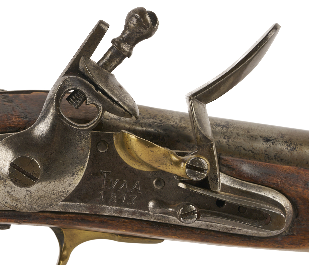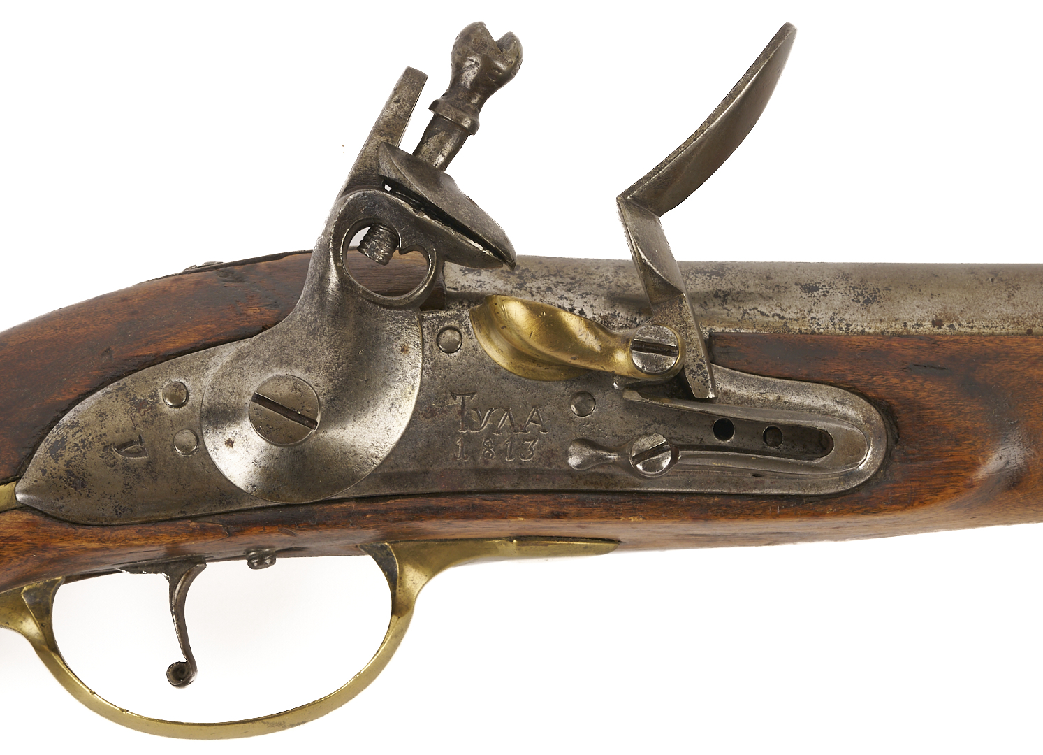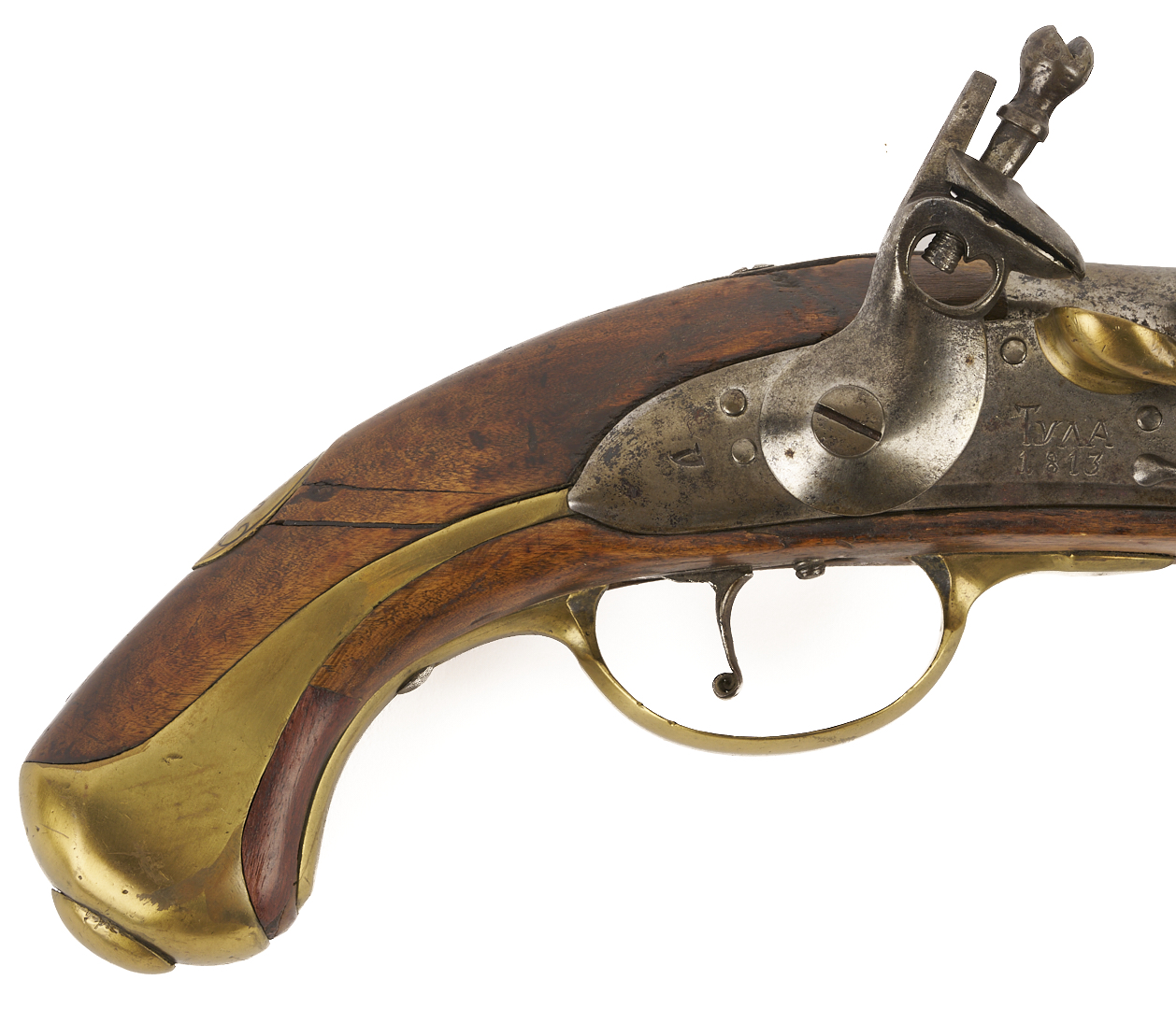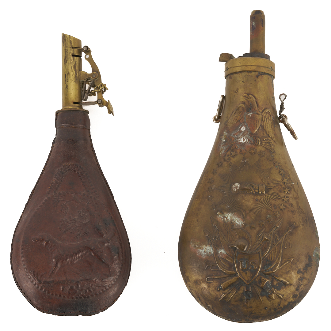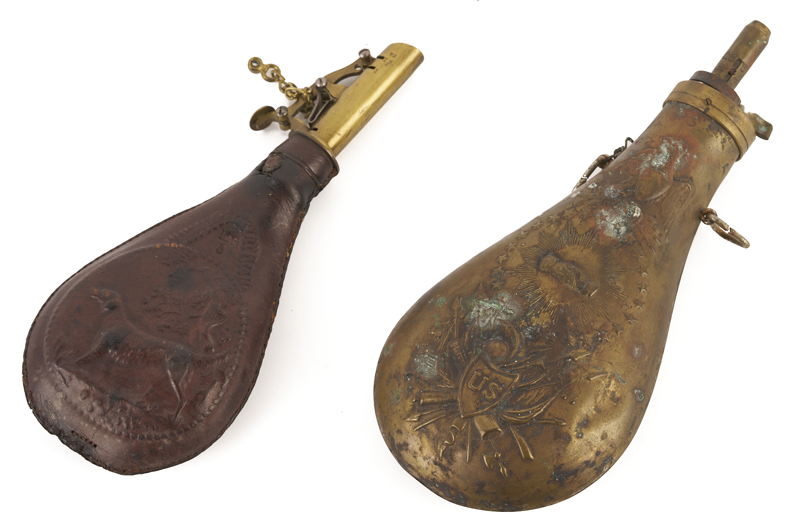 1st Item: Imperial Russian Tula Arsenal Model 1809 Flintlock Pistol dated “1813” on lock; 10 1/2 inch .70 cal smoothbore barrel. Brass mounts, including thumb plate with Alexander the First’s cypher. Various inspector’s/proofing marks. These were issued to various Russian officers and troops during the Napoleonic Wars. Overall 17 in. L. 2nd Item: Embossed brass powder “Peace” flask, with eagle, US markings and a pair of clasped hands to both sides. Flared powder charger with measurement slide; likely antique reproduction. Overall 8 3/4 in. L. 3rd Item: Leather and brass powder flask with embossed scene with a dog to both sides; one side with additional marking “lbs. 3”. Brass powder charger with spring loaded, adjustable measuring device, with 1 and 1 1/4 oz. markings. Overall 8 in. L. 19th century.