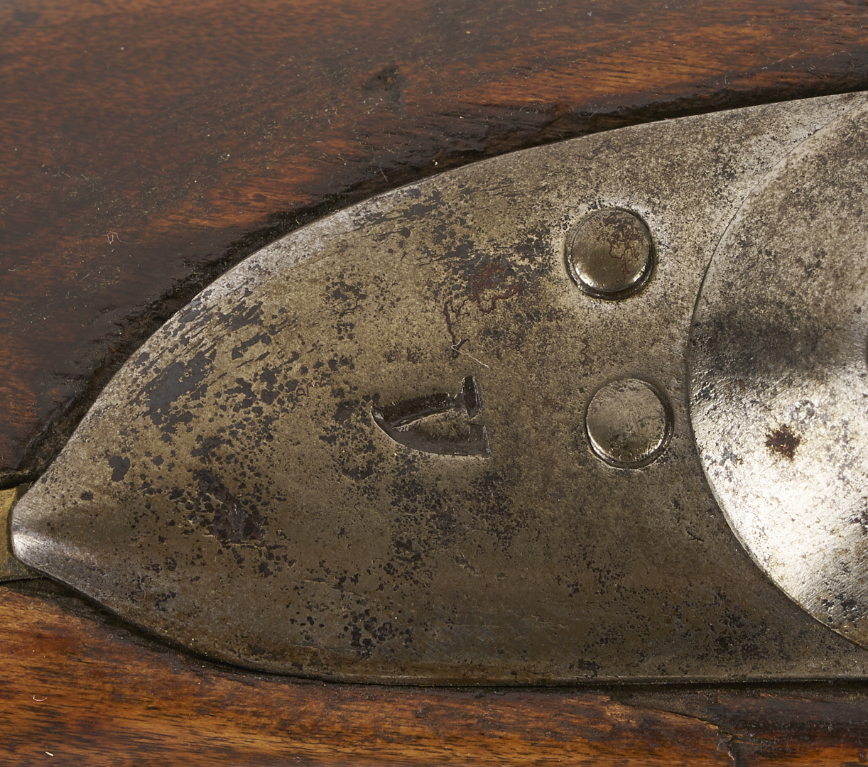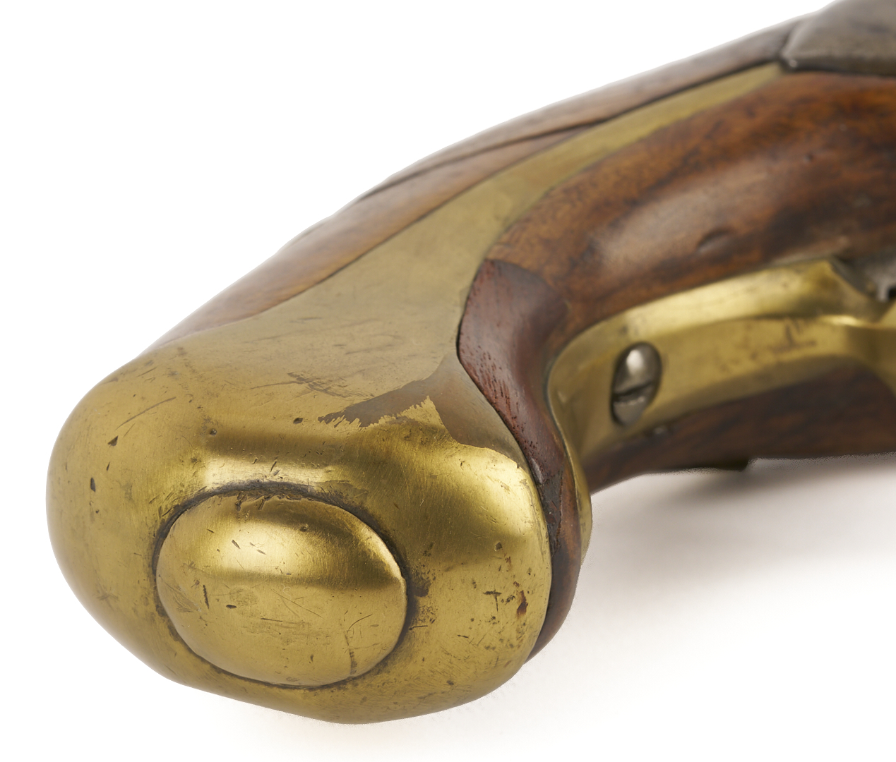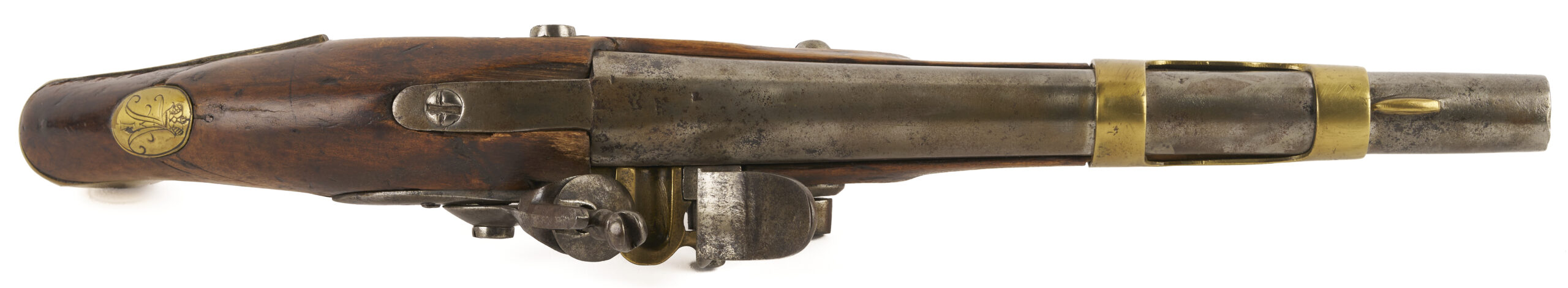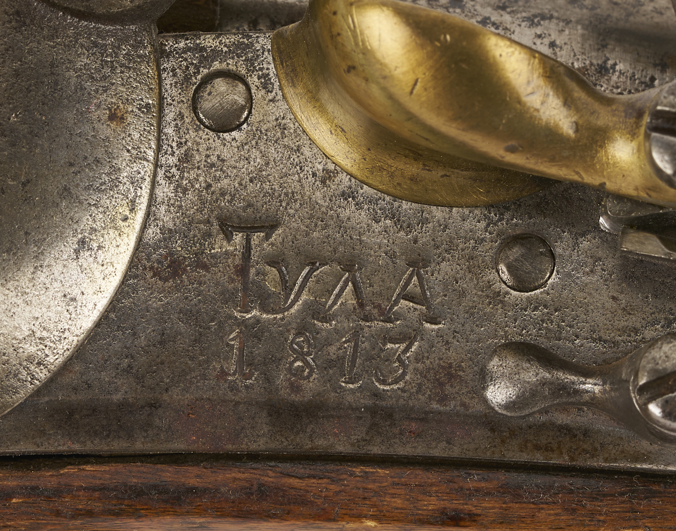 1st Item: Imperial Russian Tula Arsenal Model 1809 Flintlock Pistol dated “1813” on lock; 10 1/2 inch .70 cal smoothbore barrel. Brass mounts, including thumb plate with Alexander the First’s cypher. Various inspector’s/proofing marks. These were issued to various Russian officers and troops during the Napoleonic Wars. Overall 17 in. L. 2nd Item: Embossed brass powder “Peace” flask, with eagle, US markings and a pair of clasped hands to both sides. Flared powder charger with measurement slide; likely antique reproduction. Overall 8 3/4 in. L. 3rd Item: Leather and brass powder flask with embossed scene with a dog to both sides; one side with additional marking “lbs. 3”. Brass powder charger with spring loaded, adjustable measuring device, with 1 and 1 1/4 oz. markings. Overall 8 in. L. 19th century.