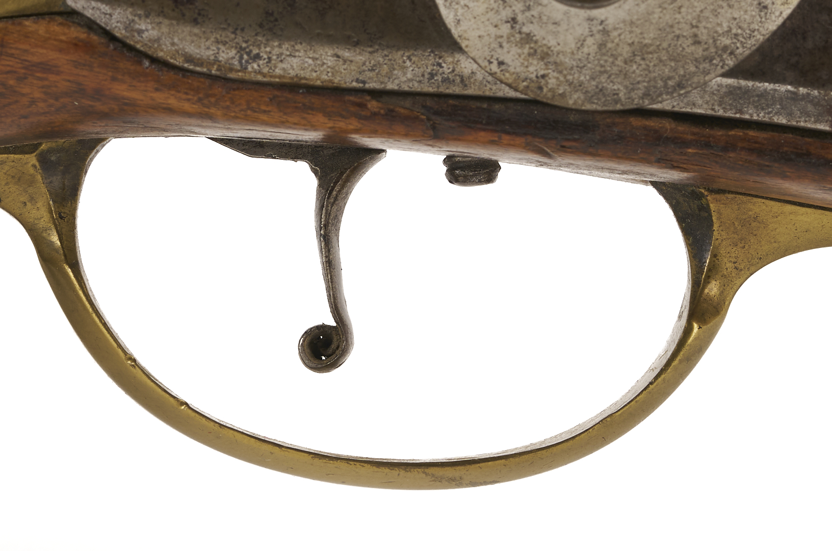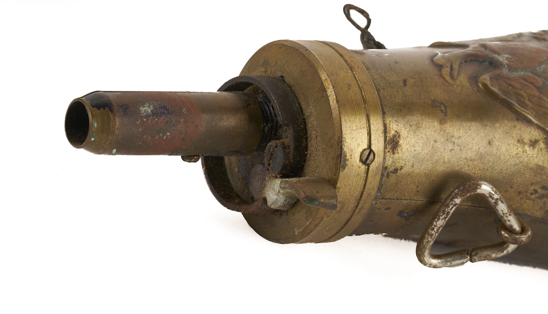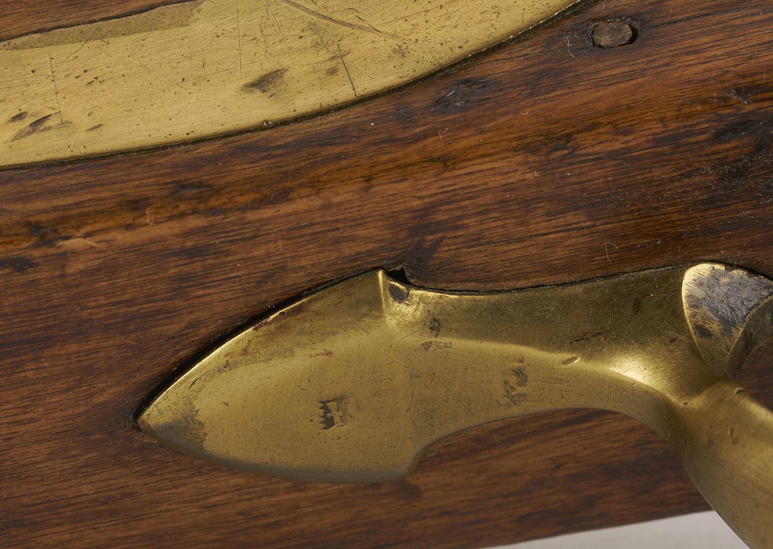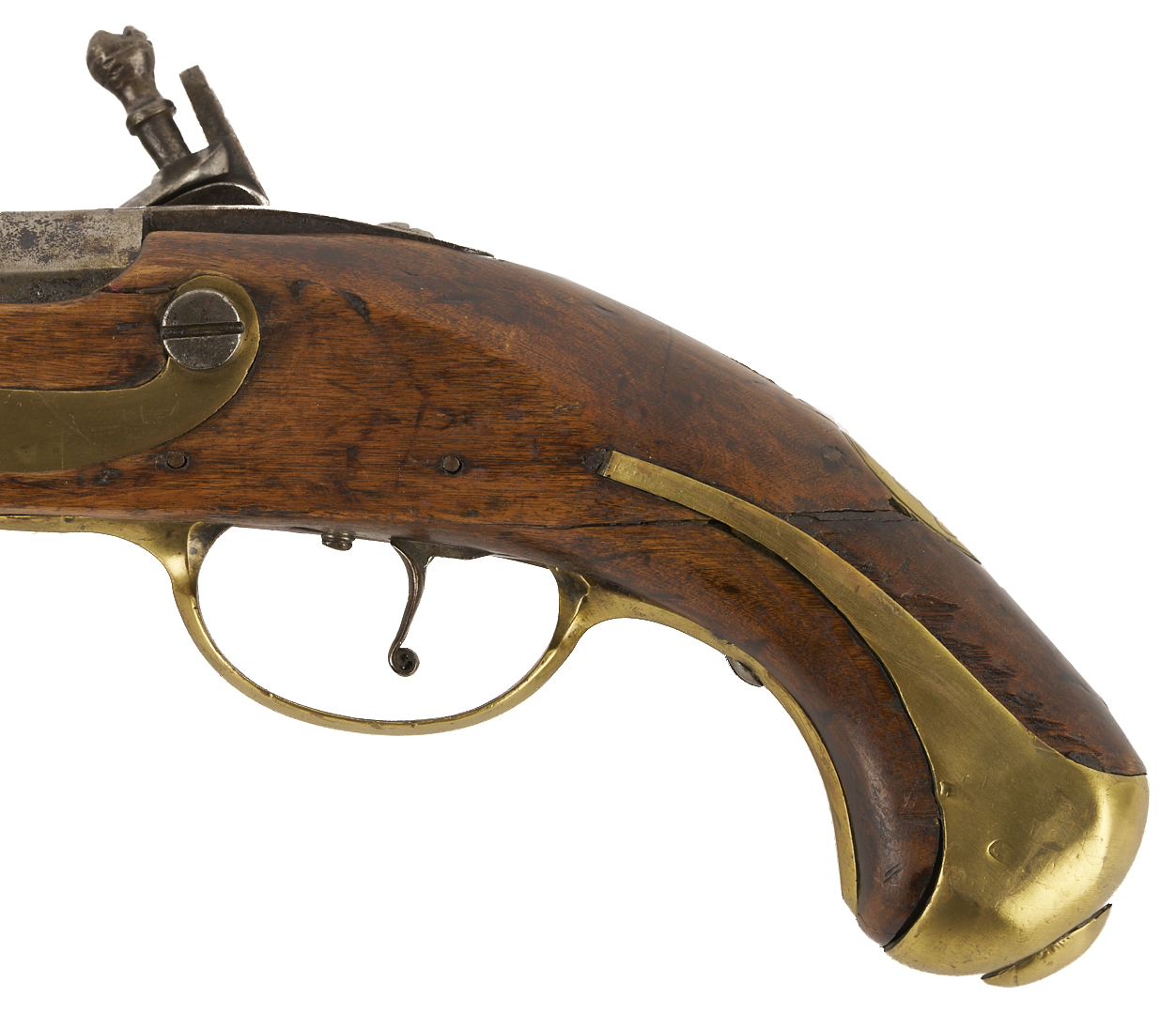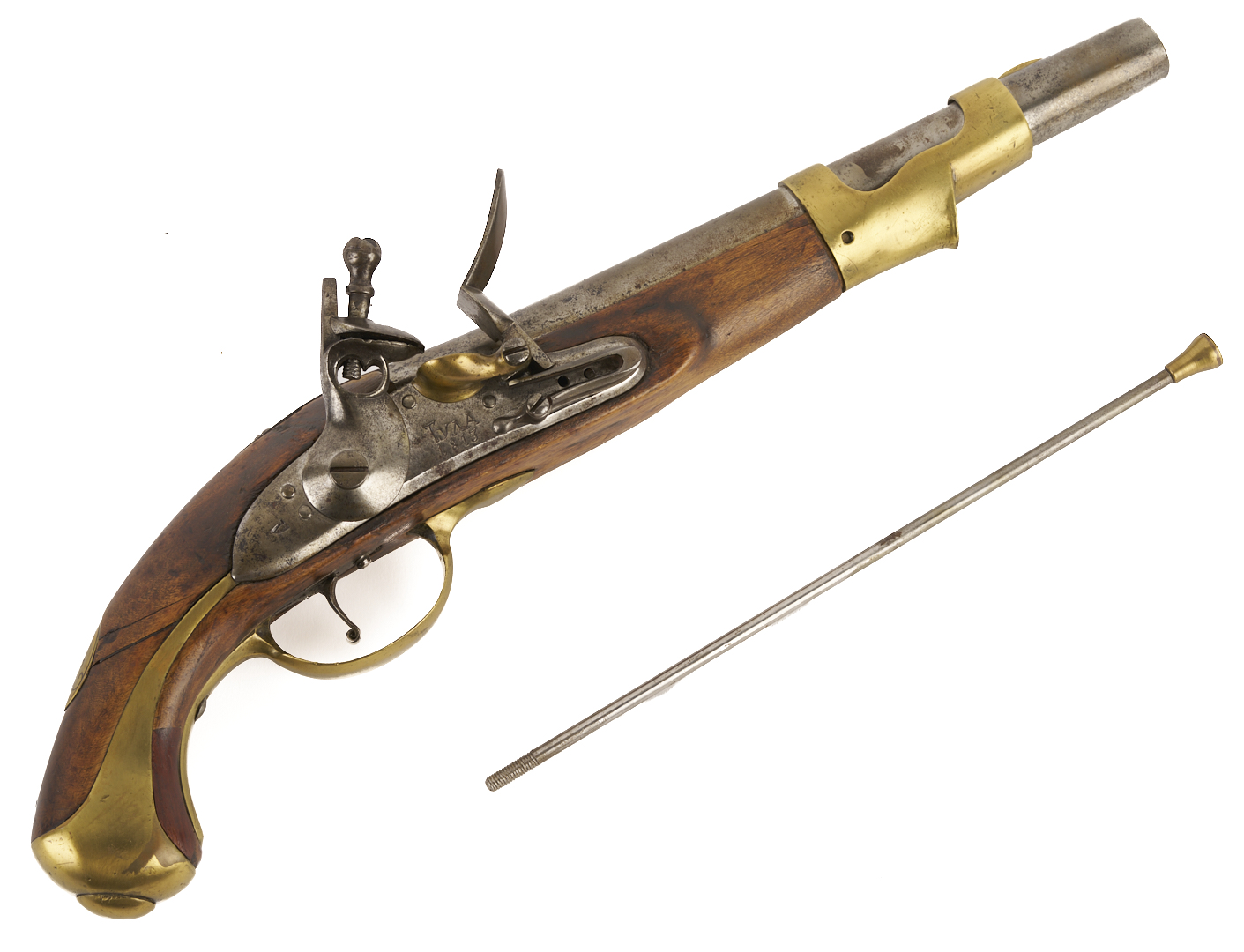 1st Item: Imperial Russian Tula Arsenal Model 1809 Flintlock Pistol dated “1813” on lock; 10 1/2 inch .70 cal smoothbore barrel. Brass mounts, including thumb plate with Alexander the First’s cypher. Various inspector’s/proofing marks. These were issued to various Russian officers and troops during the Napoleonic Wars. Overall 17 in. L. 2nd Item: Embossed brass powder “Peace” flask, with eagle, US markings and a pair of clasped hands to both sides. Flared powder charger with measurement slide; likely antique reproduction. Overall 8 3/4 in. L. 3rd Item: Leather and brass powder flask with embossed scene with a dog to both sides; one side with additional marking “lbs. 3”. Brass powder charger with spring loaded, adjustable measuring device, with 1 and 1 1/4 oz. markings. Overall 8 in. L. 19th century.