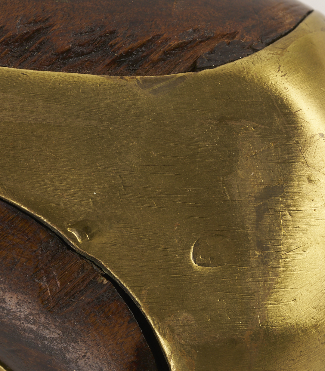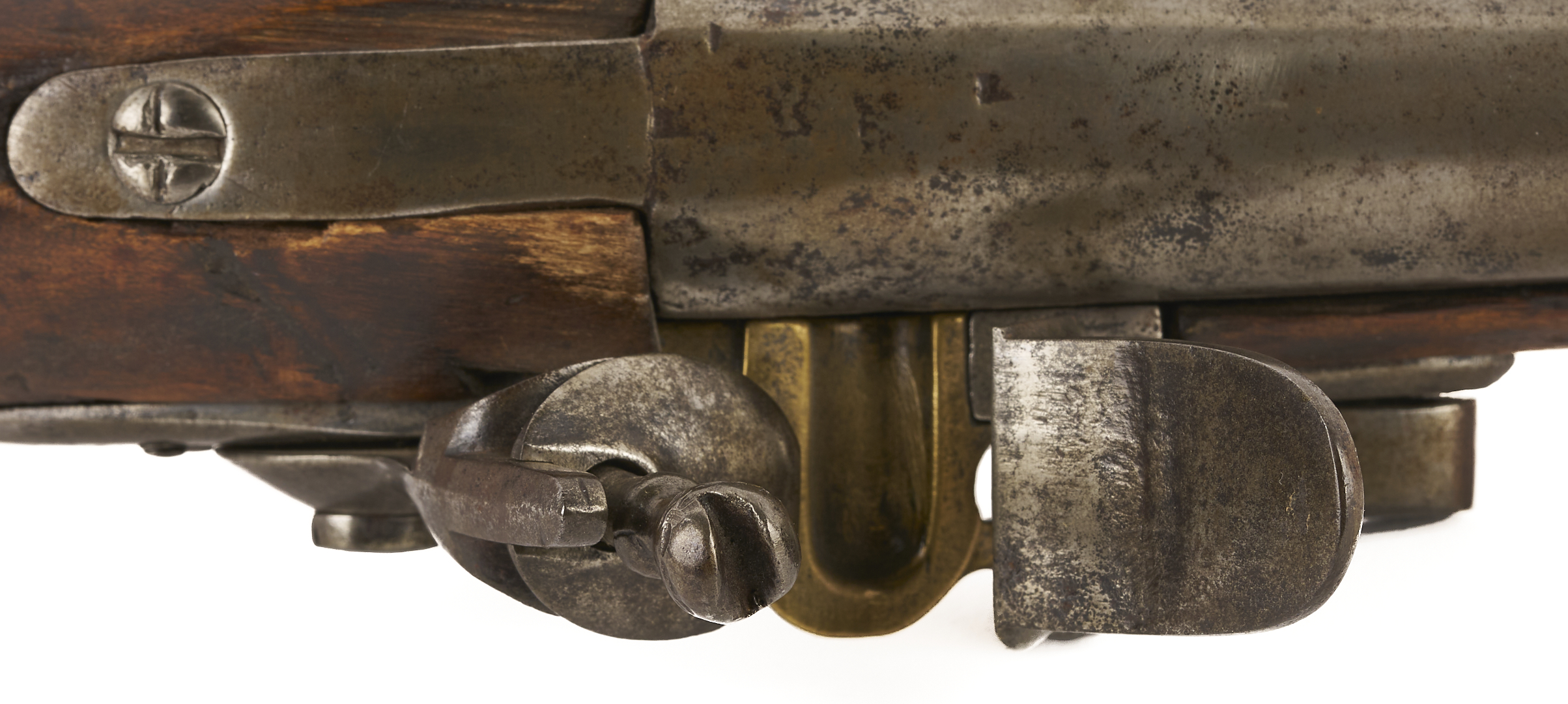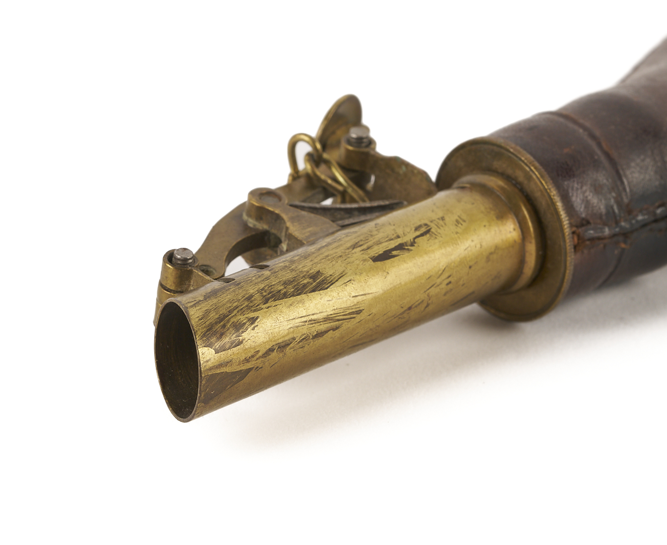 CONDITION: Pistol in stiff working order; slight loss to stock left of tang; stock sanded. Peace flask with tarnishing. Leather flask with slight loss around spout, otherwise supple leather.