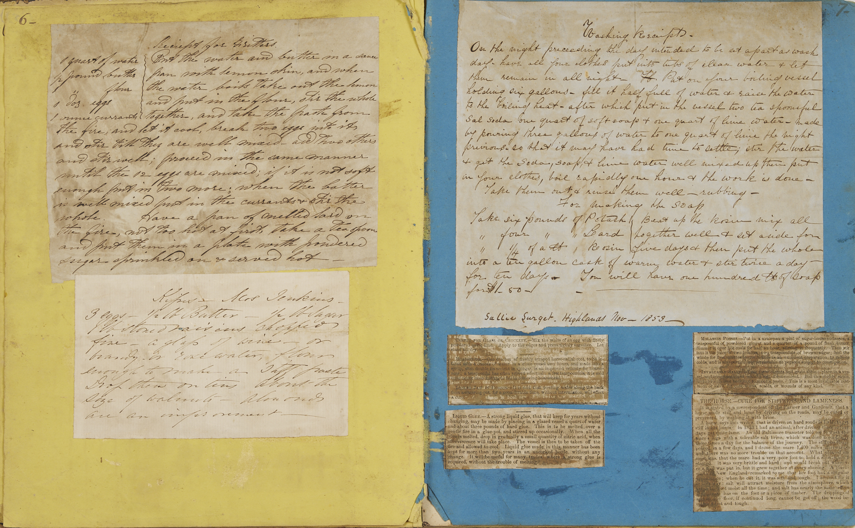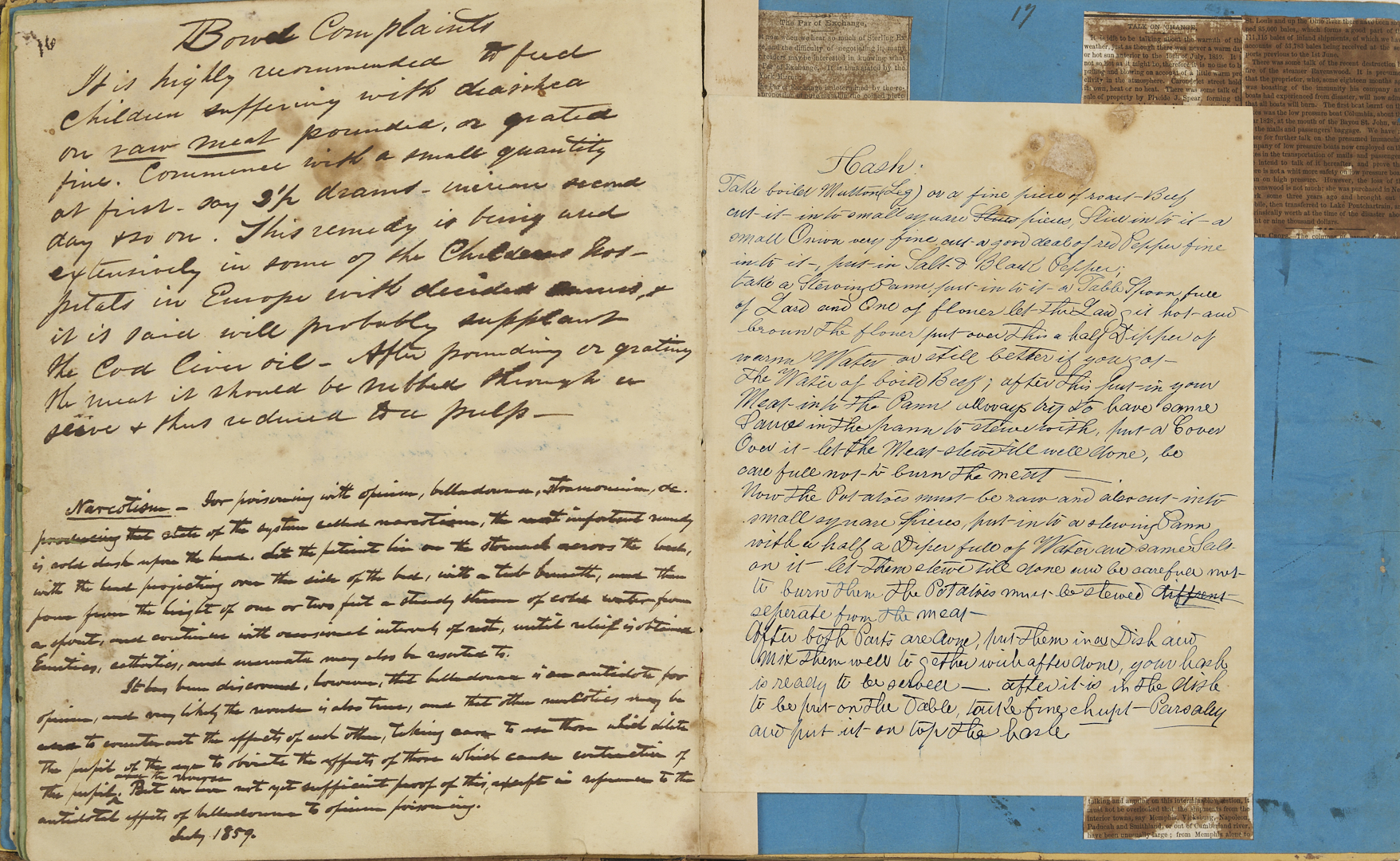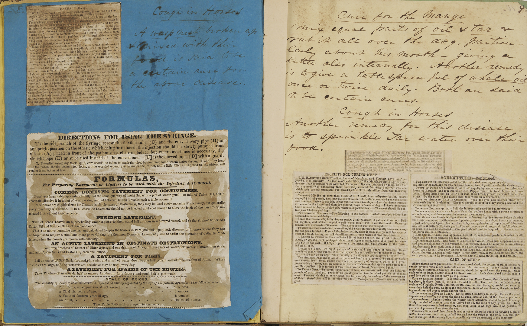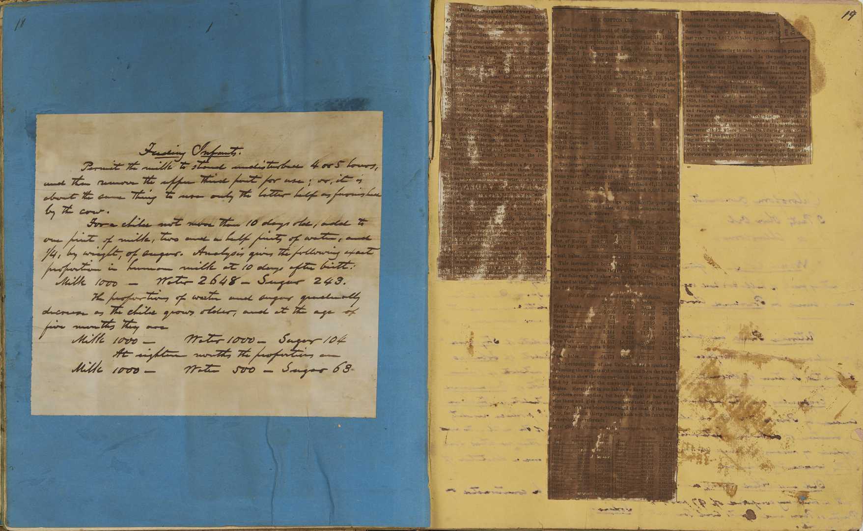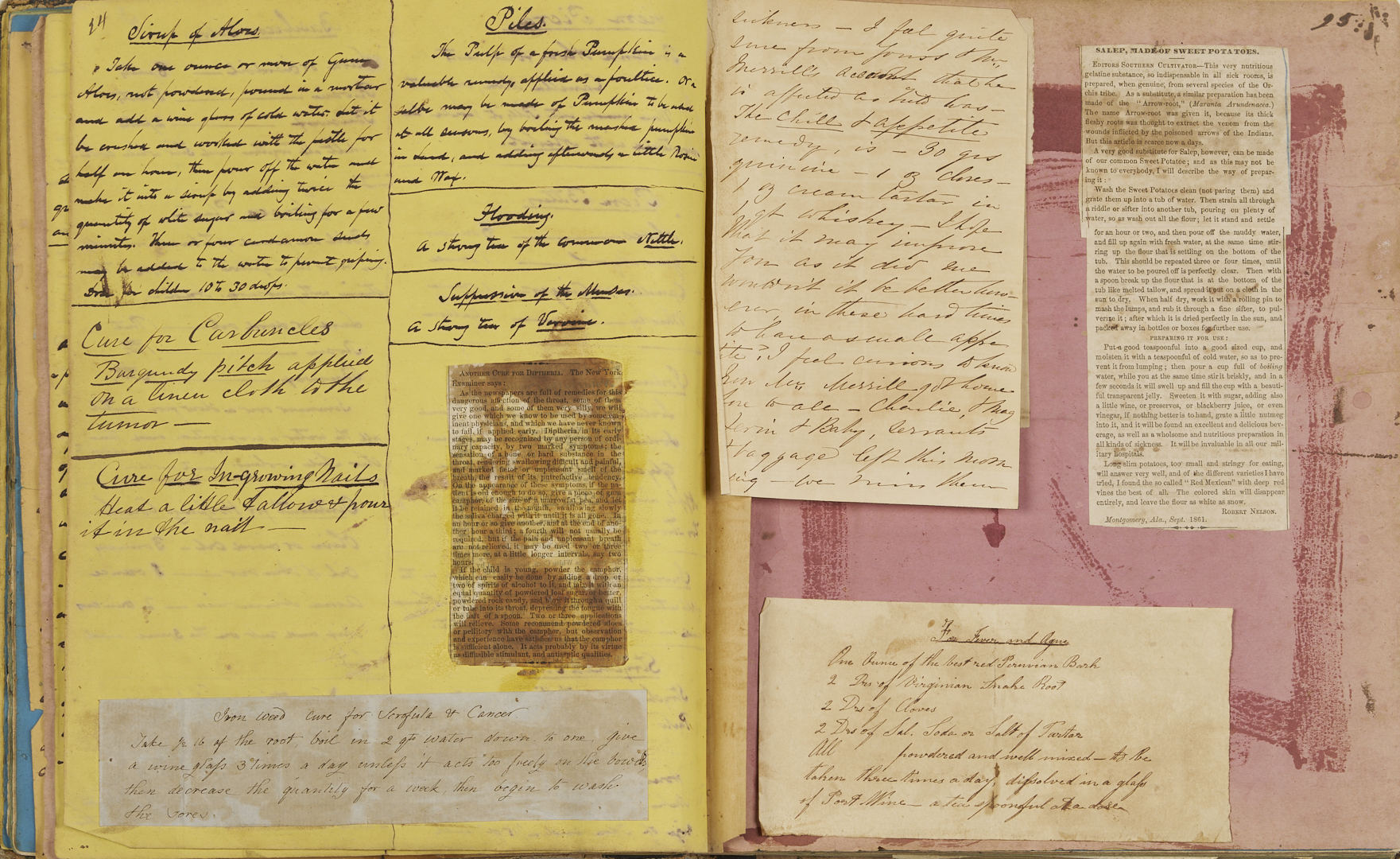 1st item: Elms Court Plantation scrapbook/operational guide, with recipes and processes for preparing a variety of homeopathic remedies, treatments, recipes, and cures and included handwritten instructions for feeding infants; recipes for hash, sausage, soap/honey soap, hair wash, quinine, strychnine, and chloroform; and remedies for bronchitis, whooping cough, flatulence, “for the ear,” and “cough in horses,” among many others. First entry dated 1853 and last entry dated 1888, with 1883 Merrill obituary clipping. Later 19th c. documents and clippings inserted in subsequent pages.