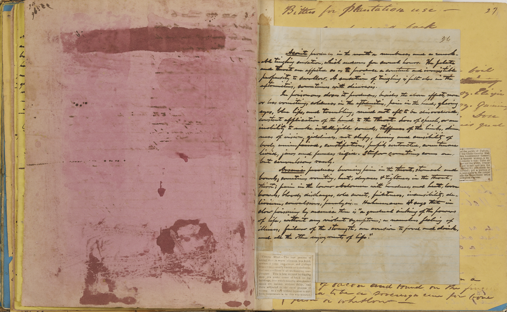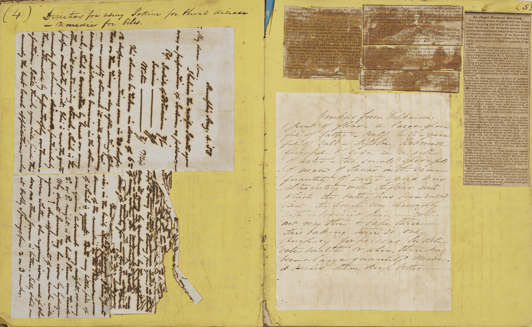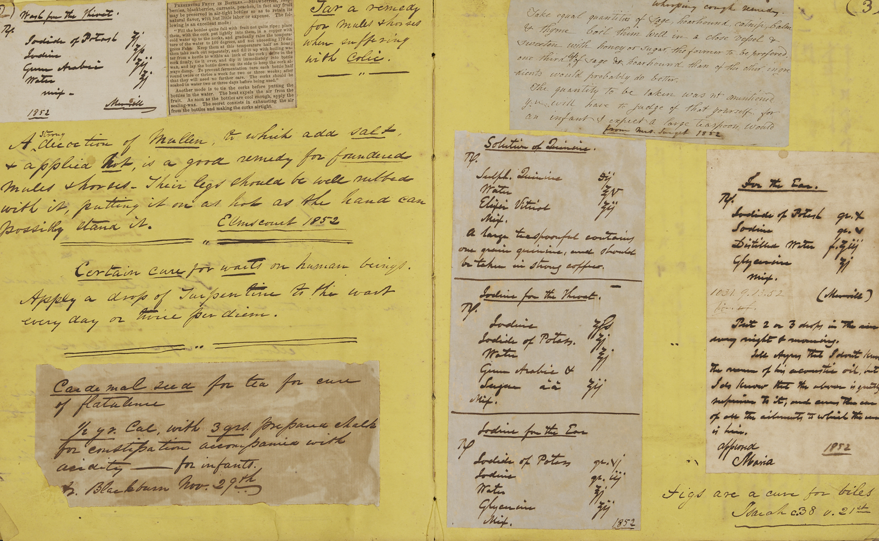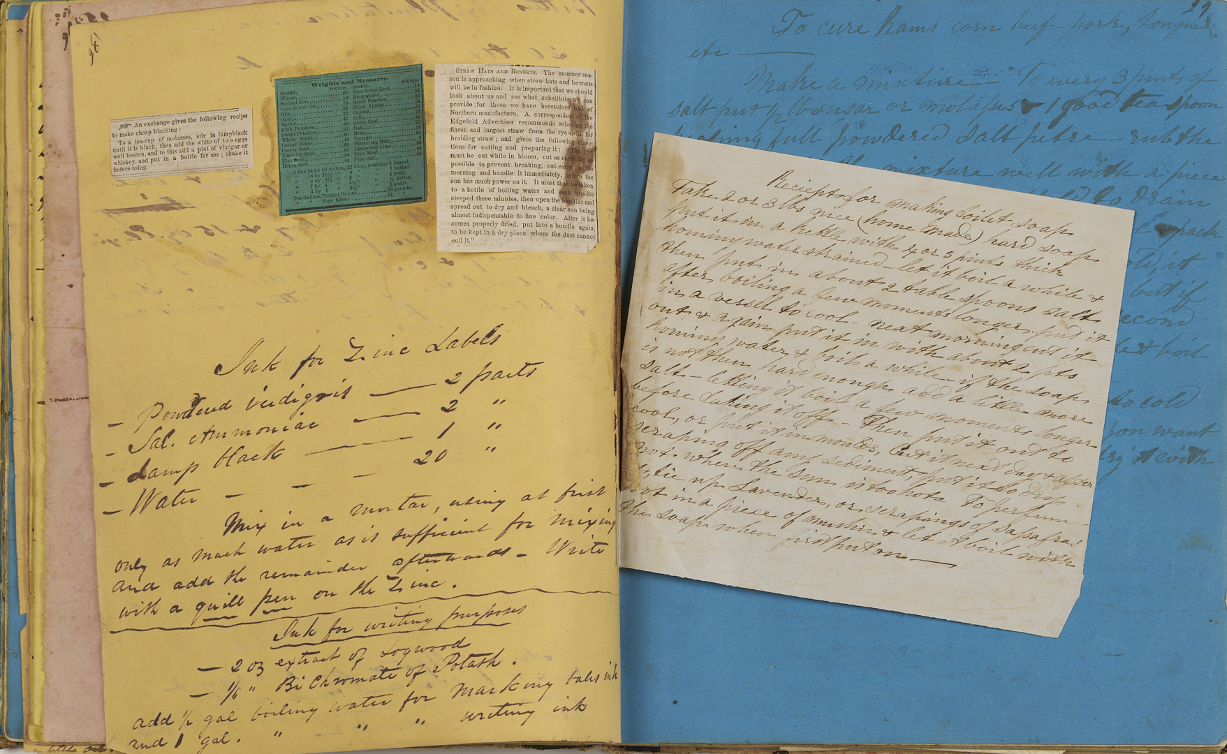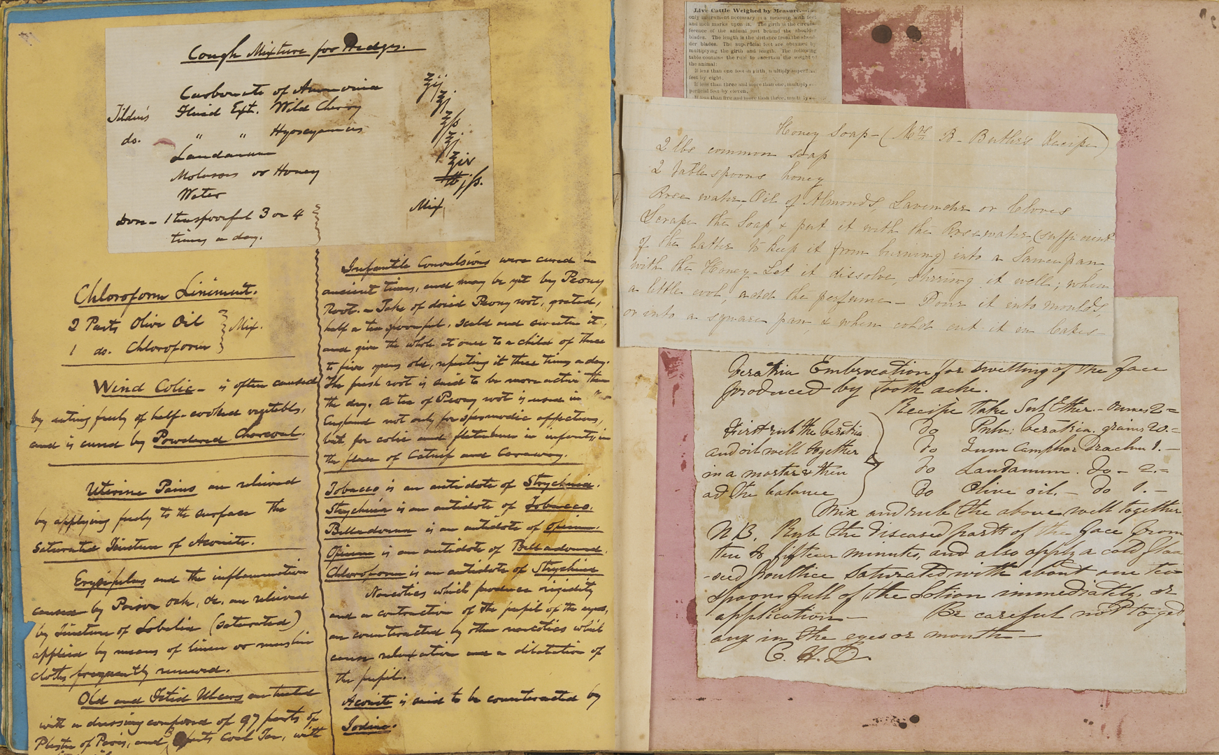 1st item: Elms Court Plantation scrapbook/operational guide, with recipes and processes for preparing a variety of homeopathic remedies, treatments, recipes, and cures and included handwritten instructions for feeding infants; recipes for hash, sausage, soap/honey soap, hair wash, quinine, strychnine, and chloroform; and remedies for bronchitis, whooping cough, flatulence, “for the ear,” and “cough in horses,” among many others. First entry dated 1853 and last entry dated 1888, with 1883 Merrill obituary clipping. Later 19th c. documents and clippings inserted in subsequent pages.