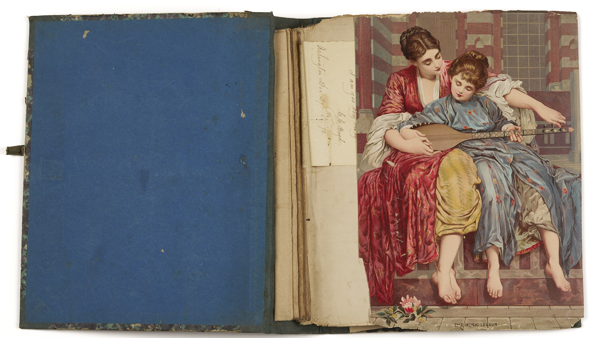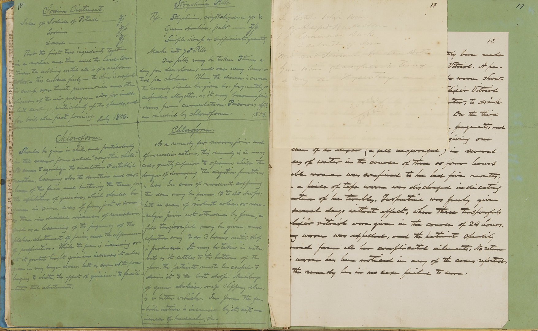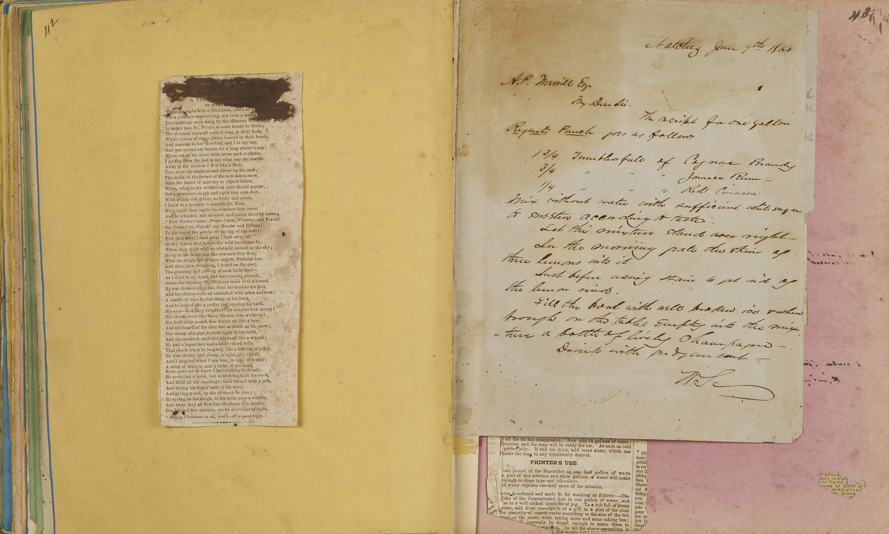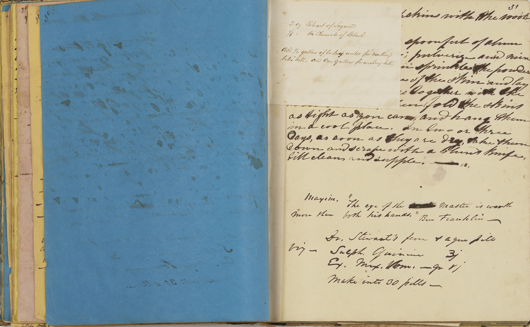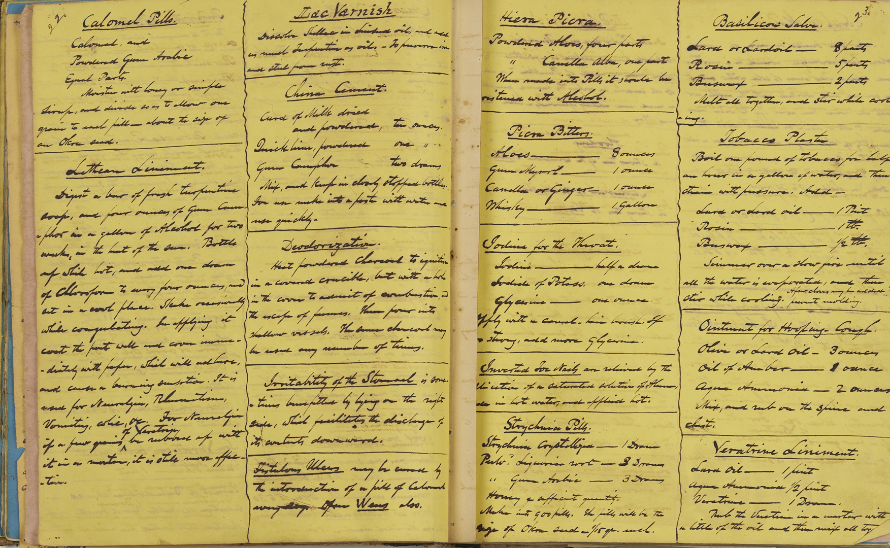 1st item: Elms Court Plantation scrapbook/operational guide, with recipes and processes for preparing a variety of homeopathic remedies, treatments, recipes, and cures and included handwritten instructions for feeding infants; recipes for hash, sausage, soap/honey soap, hair wash, quinine, strychnine, and chloroform; and remedies for bronchitis, whooping cough, flatulence, “for the ear,” and “cough in horses,” among many others. First entry dated 1853 and last entry dated 1888, with 1883 Merrill obituary clipping. Later 19th c. documents and clippings inserted in subsequent pages.