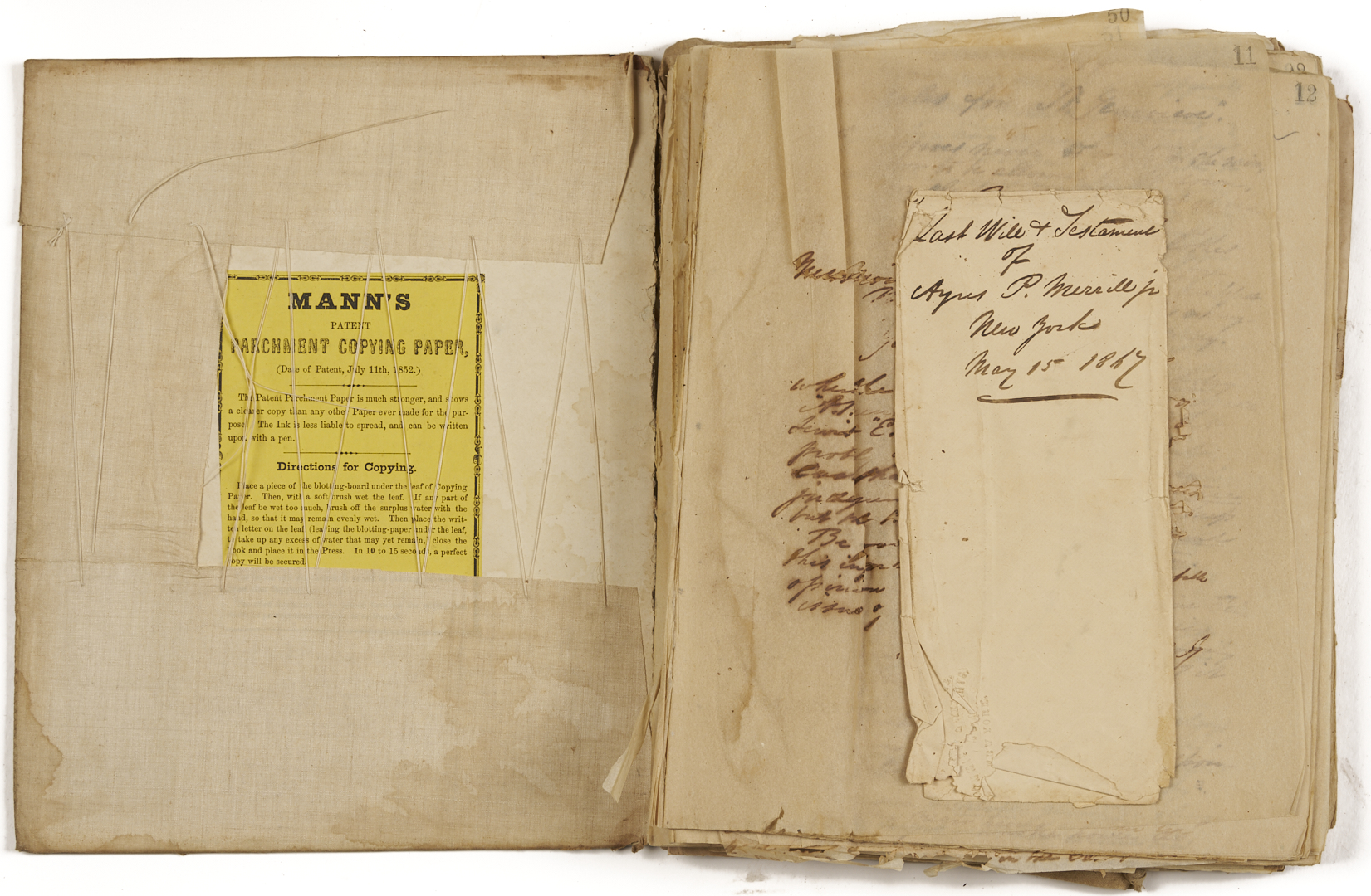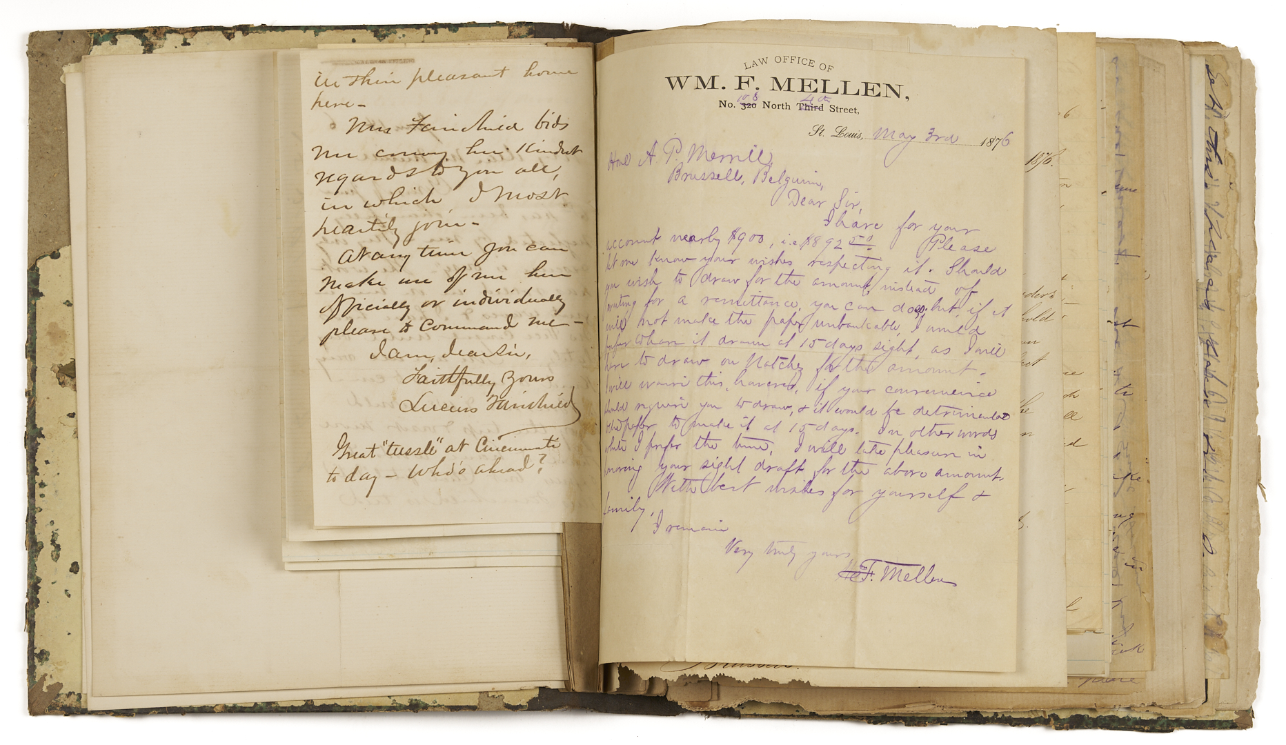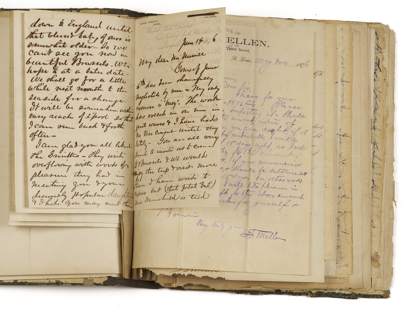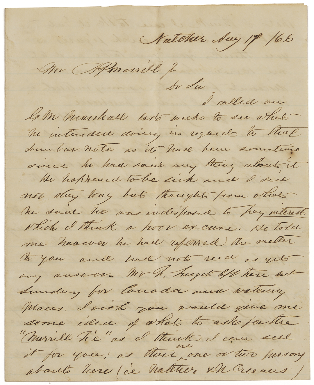 Archive spanning three generations of the Ayers Phillips Merrill family, including over 500 personal and business papers, c. 1857-1887, plus extended family letters and business documents, c. 1820’s-1850’s. The central figure of the archive is A.P. (“Ayres”) Merrill Jr. (1825-1883), a southern planter, Harvard-educated lawyer (1845), and United States Minister to Belgium under the Grant Administration (1876-1877). A Unionist native of Natchez, Mississippi, Merrill’s landholdings included Elms Court, the Hedges and Scotland plantations, and the St. Genevieve, an estate received through his wife, Jane Surget Merrill, daughter of Captain Frances Surget, a prominent Natchez landholder in the antebellum South.