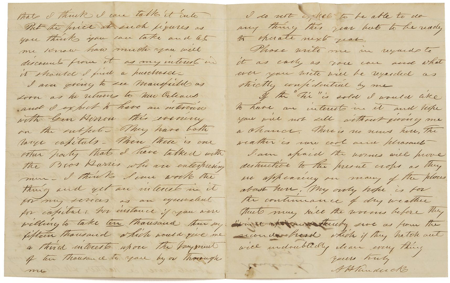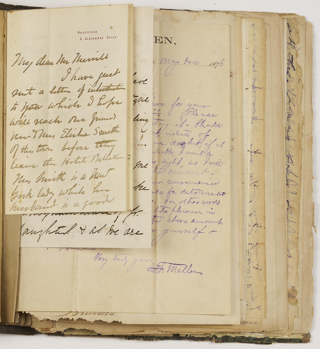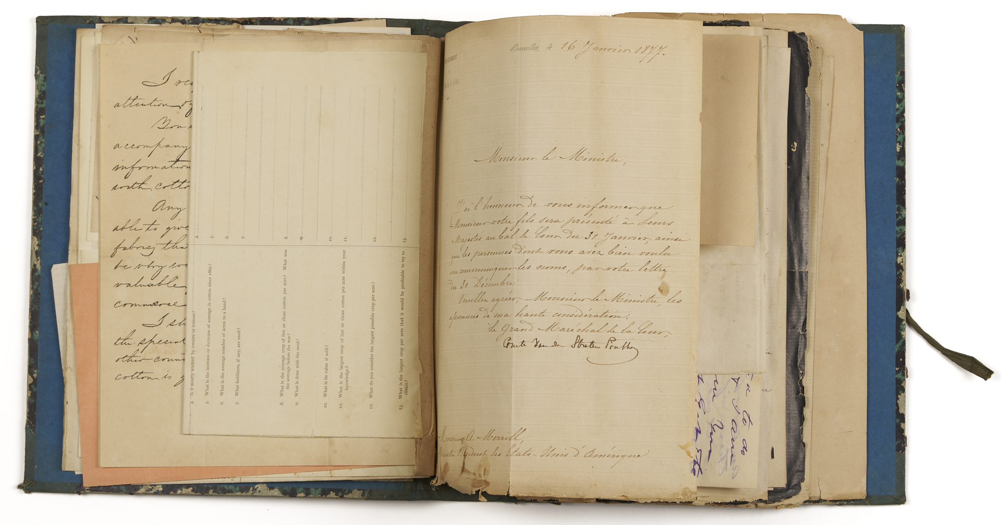 Archive spanning three generations of the Ayers Phillips Merrill family, including over 500 personal and business papers, c. 1857-1887, plus extended family letters and business documents, c. 1820’s-1850’s. The central figure of the archive is A.P. (“Ayres”) Merrill Jr. (1825-1883), a southern planter, Harvard-educated lawyer (1845), and United States Minister to Belgium under the Grant Administration (1876-1877). A Unionist native of Natchez, Mississippi, Merrill’s landholdings included Elms Court, the Hedges and Scotland plantations, and the St. Genevieve, an estate received through his wife, Jane Surget Merrill, daughter of Captain Frances Surget, a prominent Natchez landholder in the antebellum South.