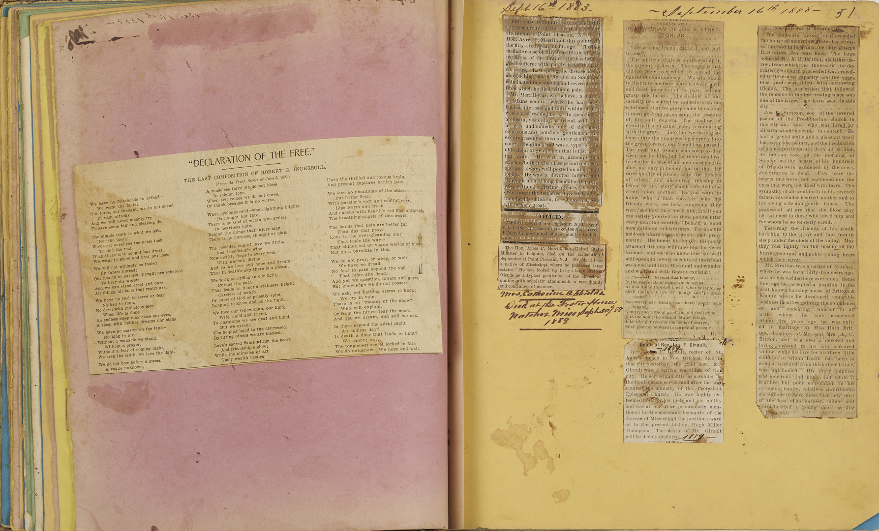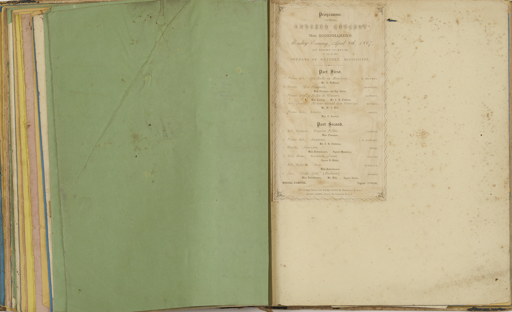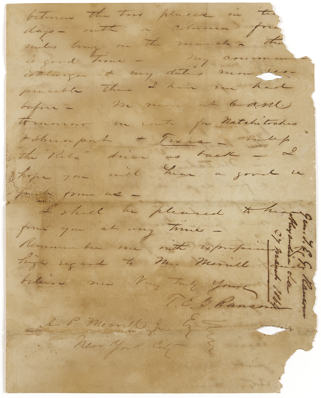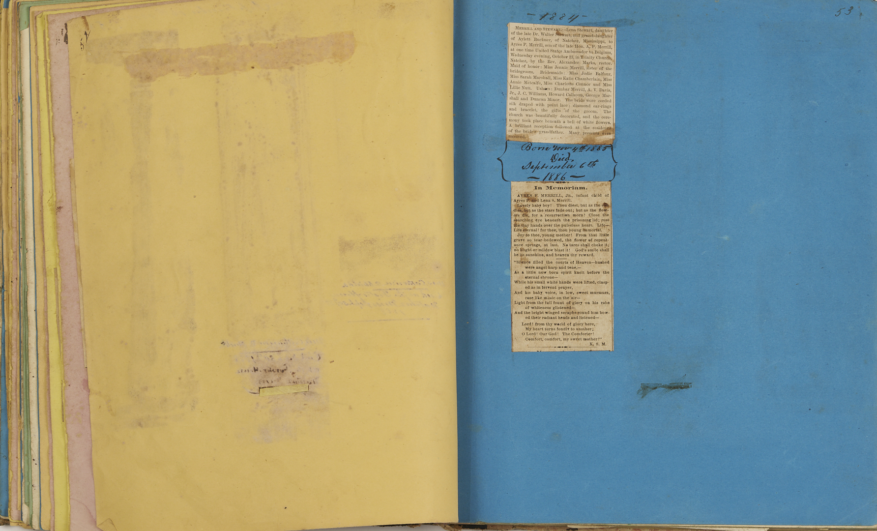 Archive spanning three generations of the Ayers Phillips Merrill family, including over 500 personal and business papers, c. 1857-1887, plus extended family letters and business documents, c. 1820’s-1850’s. The central figure of the archive is A.P. (“Ayres”) Merrill Jr. (1825-1883), a southern planter, Harvard-educated lawyer (1845), and United States Minister to Belgium under the Grant Administration (1876-1877). A Unionist native of Natchez, Mississippi, Merrill’s landholdings included Elms Court, the Hedges and Scotland plantations, and the St. Genevieve, an estate received through his wife, Jane Surget Merrill, daughter of Captain Frances Surget, a prominent Natchez landholder in the antebellum South.