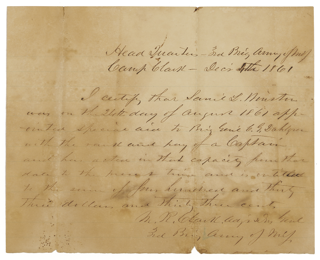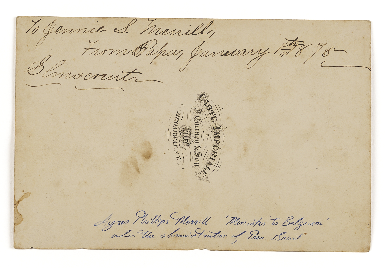 3rd item: 25 personal and business letters and documents that include correspondence signed by [MR?] Clark, 3rd Brig. Gen. NY; US Secretary of State William Seward; Thomas E.G. Ransom; and L. Thomas, likely Lorenzo Thomas, Adj. General under Abraham Lincoln; also with photograph of Merrill as “Minister to Belgium” and inscribed by Merrill en verso plus photocopy of letter from President Grant to Leopold II, King of Belgium, that discusses his selection of Merrill as Ambassador. Housed in a three-ring binder and encapsulated in protective, transparent plastic coverings.