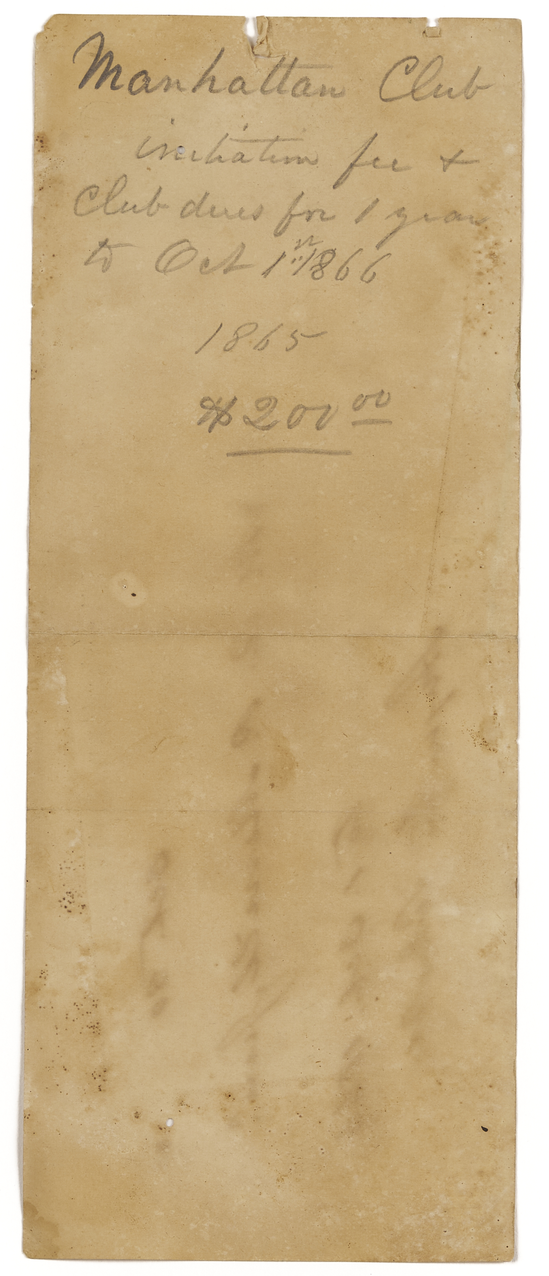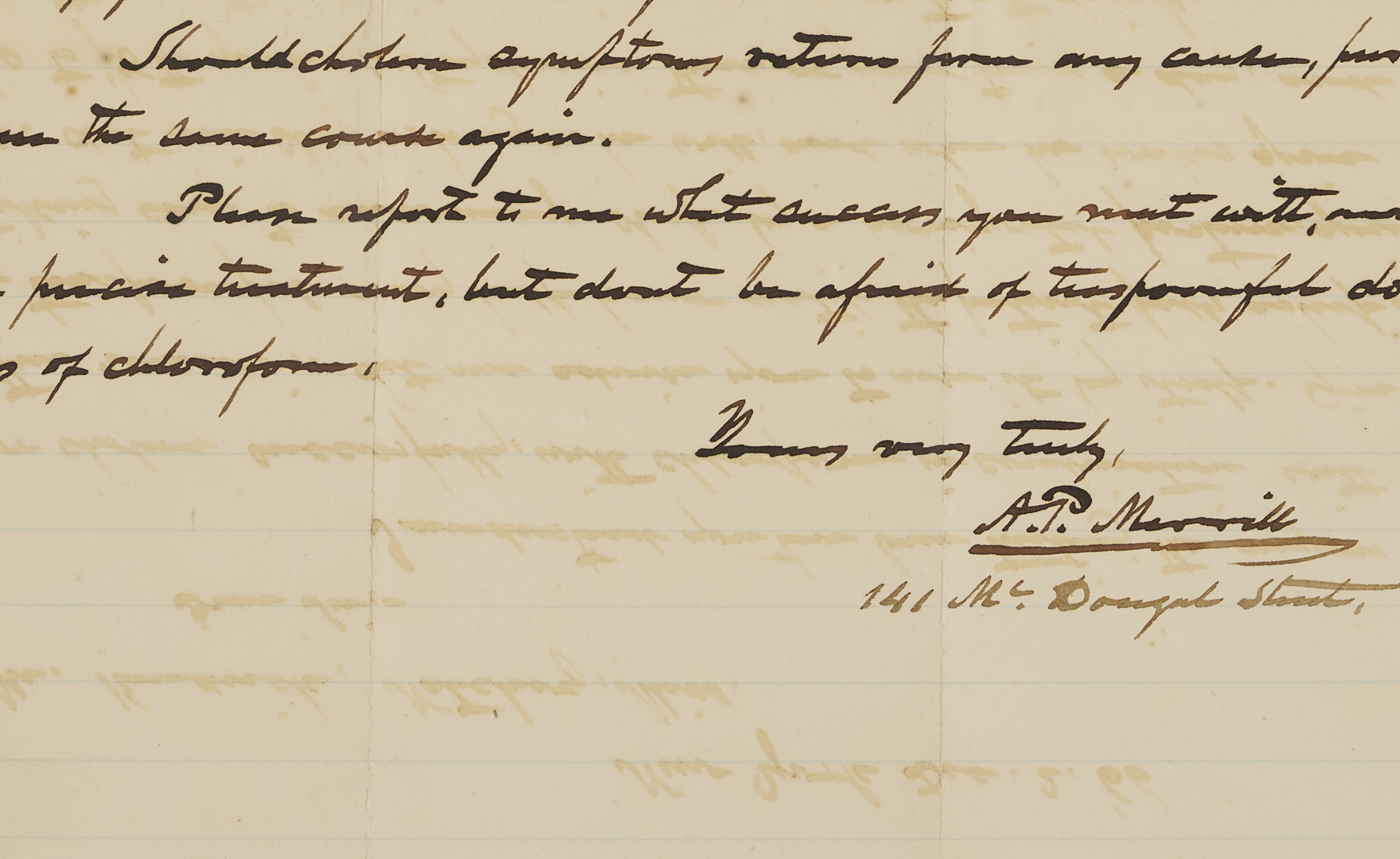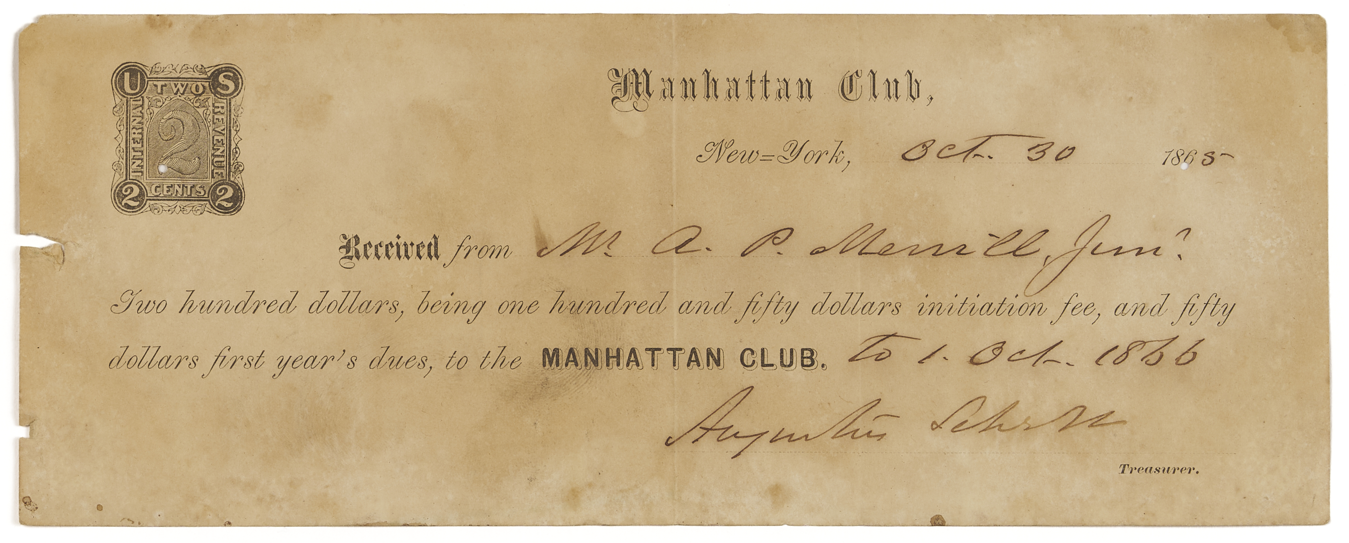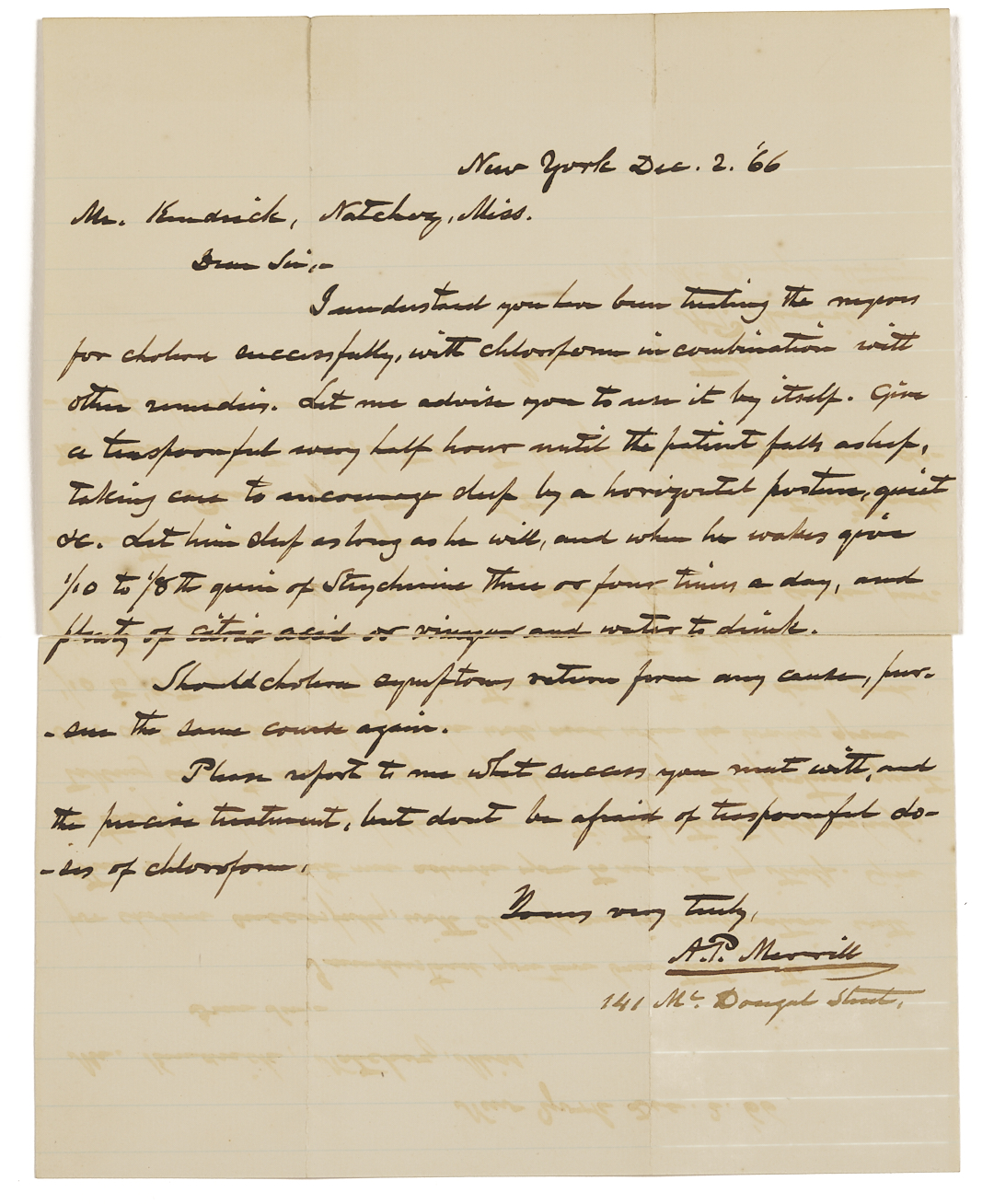 Once established in New York City, Merrill formed the law firm of Goodman & Merrill, a General Commission House specializing in cotton and land transactions. Lot includes metal document box, CDV of Merrill by famed photography studio Jeremiah Gurney, and receipts including Manhattan Club dues, signed by political figure and lawyer, Hon. Augustus Schell. Extended family letters include correspondence and medical guidance from Merrill’s father, Dr. Ayers Phillips Merrill (1798–1873), an influential physician and educator with ties to Massachusetts, Tennessee, and New York. Lot includes a letter written by Merrill Sr. on treating cholera in enslaved people. See lot 86 in this auction for a related archive of Charlotte Jane Ferguson Buckner family papers. Buckner was the grandmother of Charlotte Pauline “Lena” Stewart Merrill, wife of Merrill’s son and namesake, Ayers Phillips Merrill III.