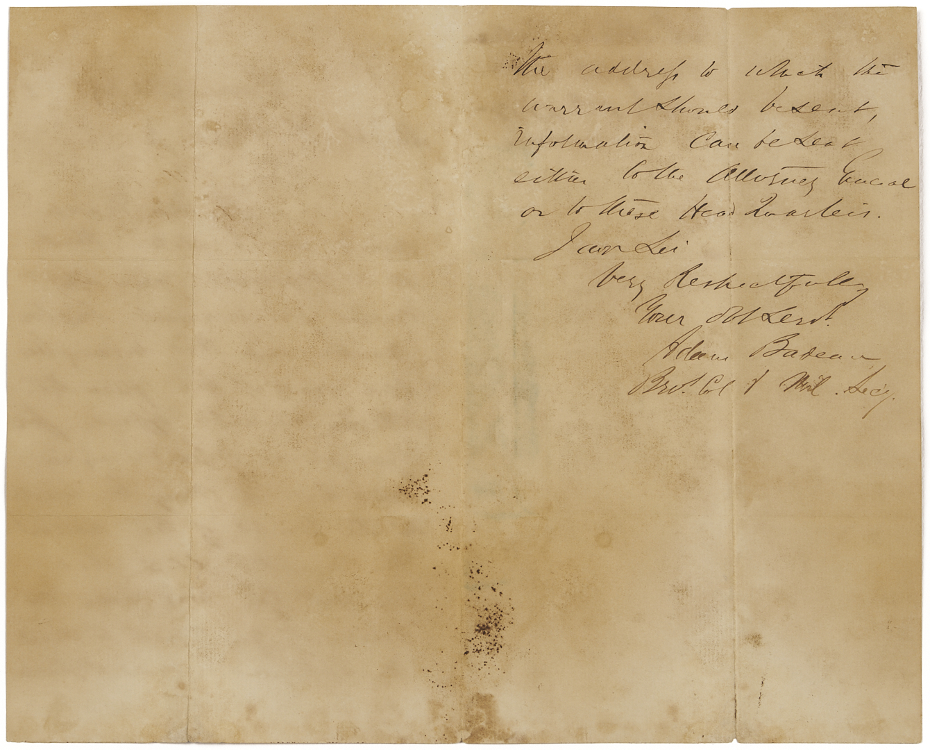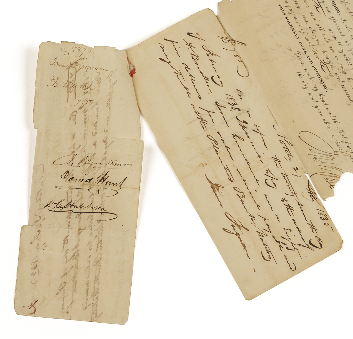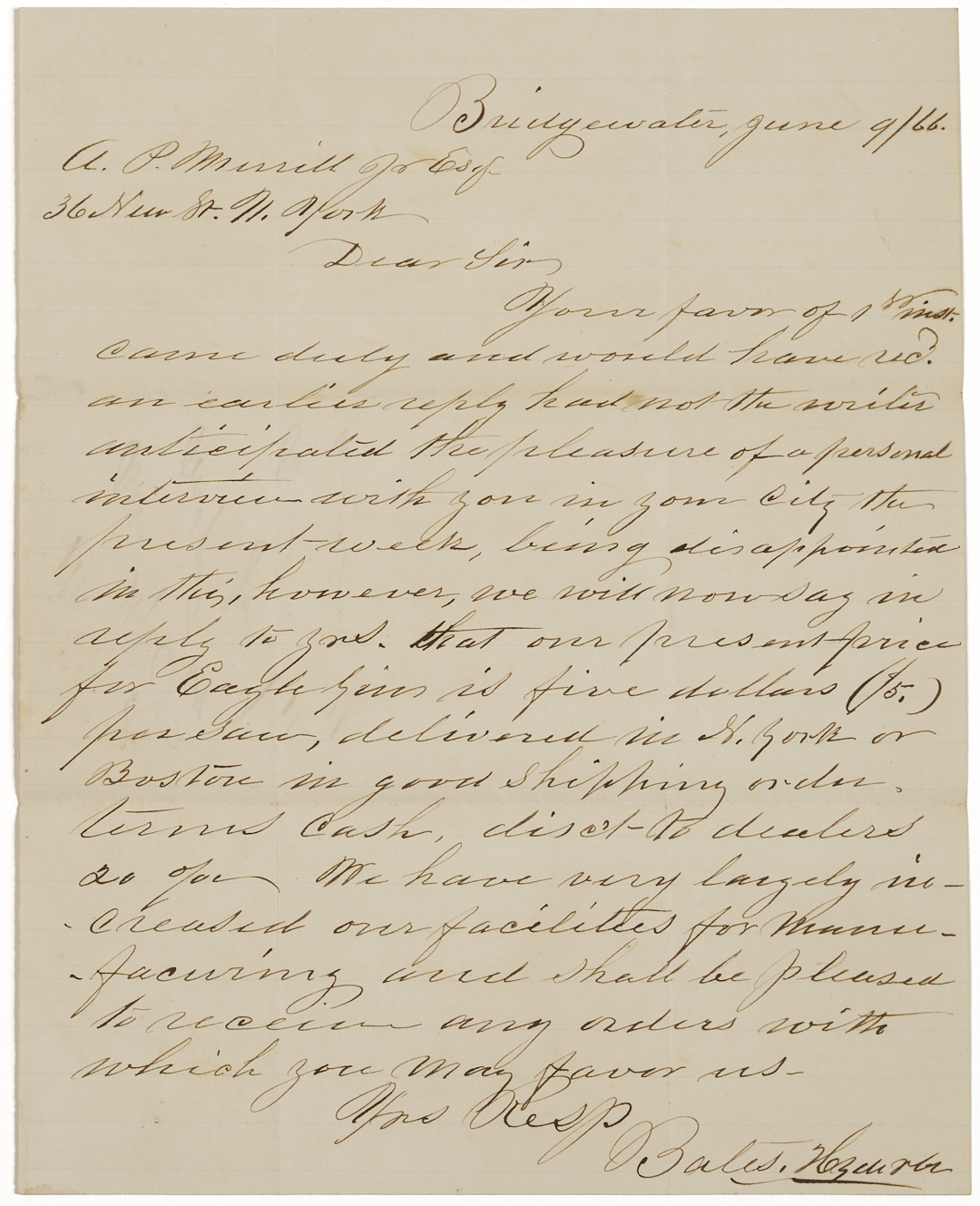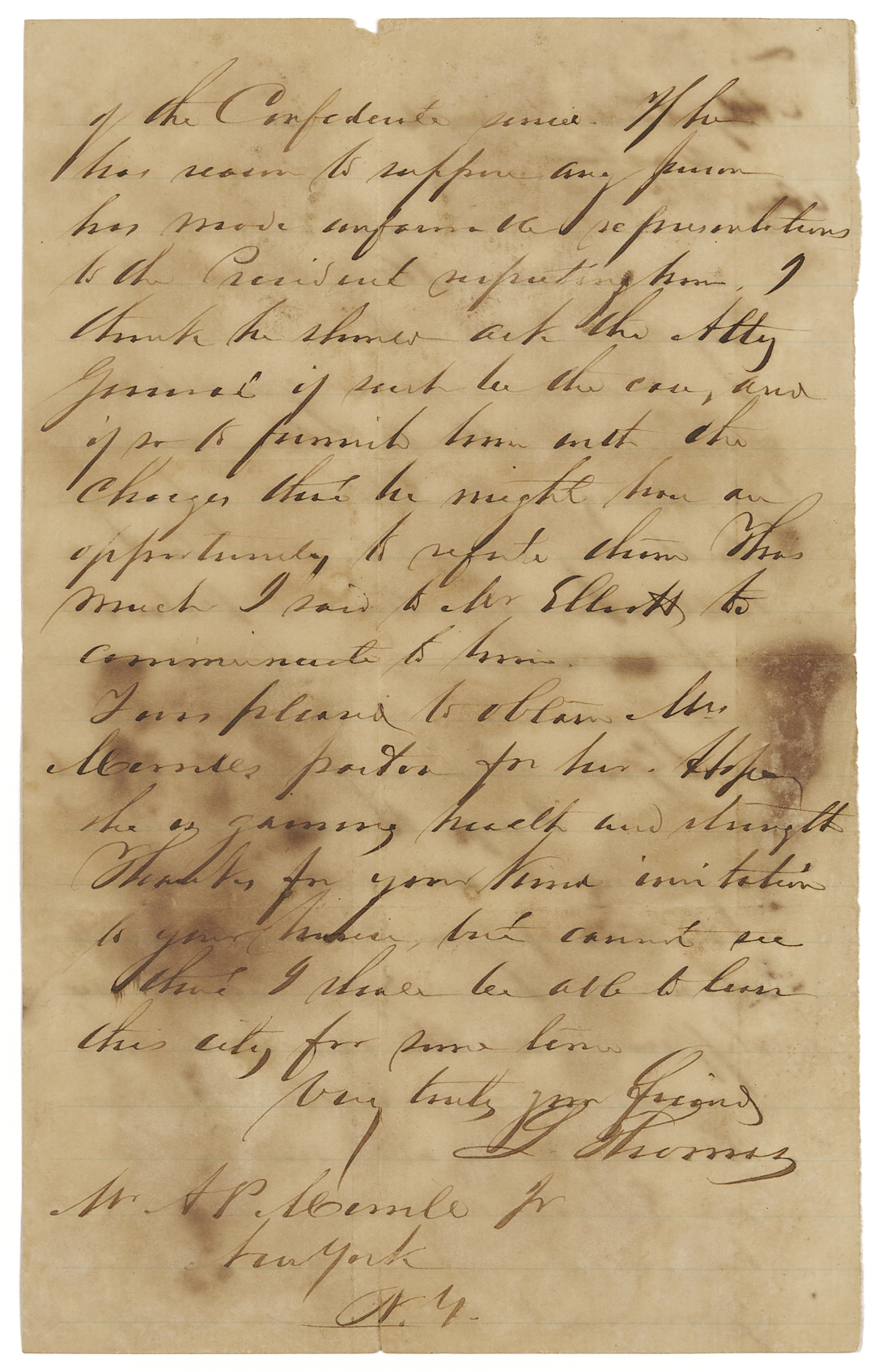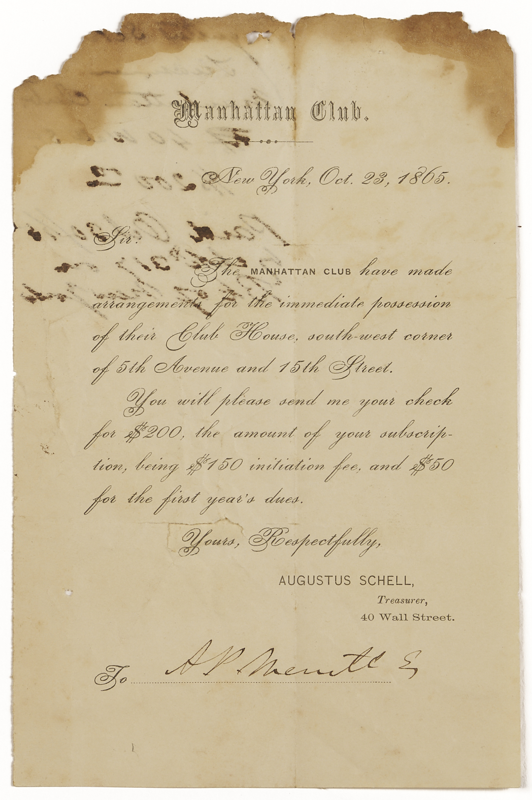 Once established in New York City, Merrill formed the law firm of Goodman & Merrill, a General Commission House specializing in cotton and land transactions. Lot includes metal document box, CDV of Merrill by famed photography studio Jeremiah Gurney, and receipts including Manhattan Club dues, signed by political figure and lawyer, Hon. Augustus Schell. Extended family letters include correspondence and medical guidance from Merrill’s father, Dr. Ayers Phillips Merrill (1798–1873), an influential physician and educator with ties to Massachusetts, Tennessee, and New York. Lot includes a letter written by Merrill Sr. on treating cholera in enslaved people. See lot 86 in this auction for a related archive of Charlotte Jane Ferguson Buckner family papers. Buckner was the grandmother of Charlotte Pauline “Lena” Stewart Merrill, wife of Merrill’s son and namesake, Ayers Phillips Merrill III.