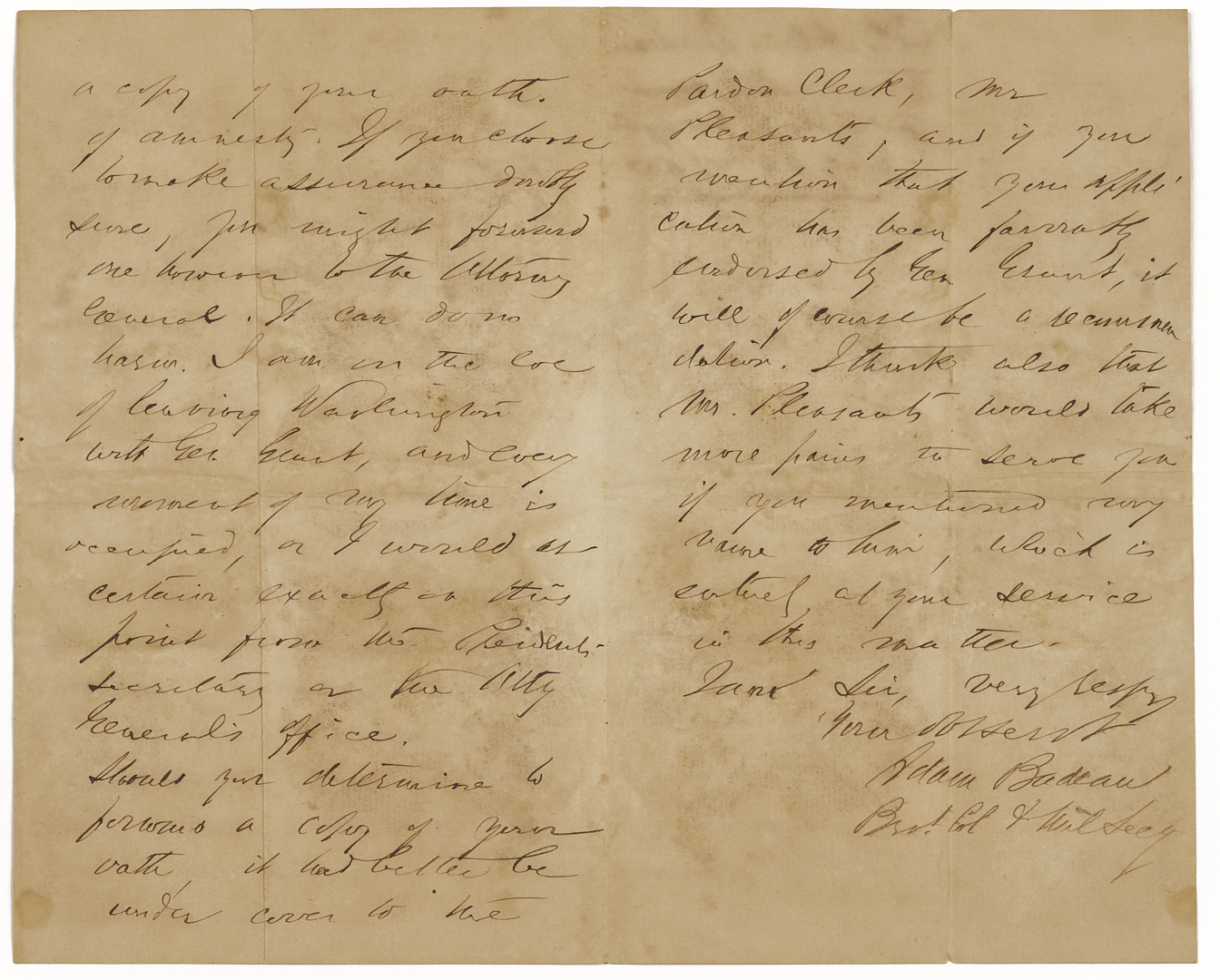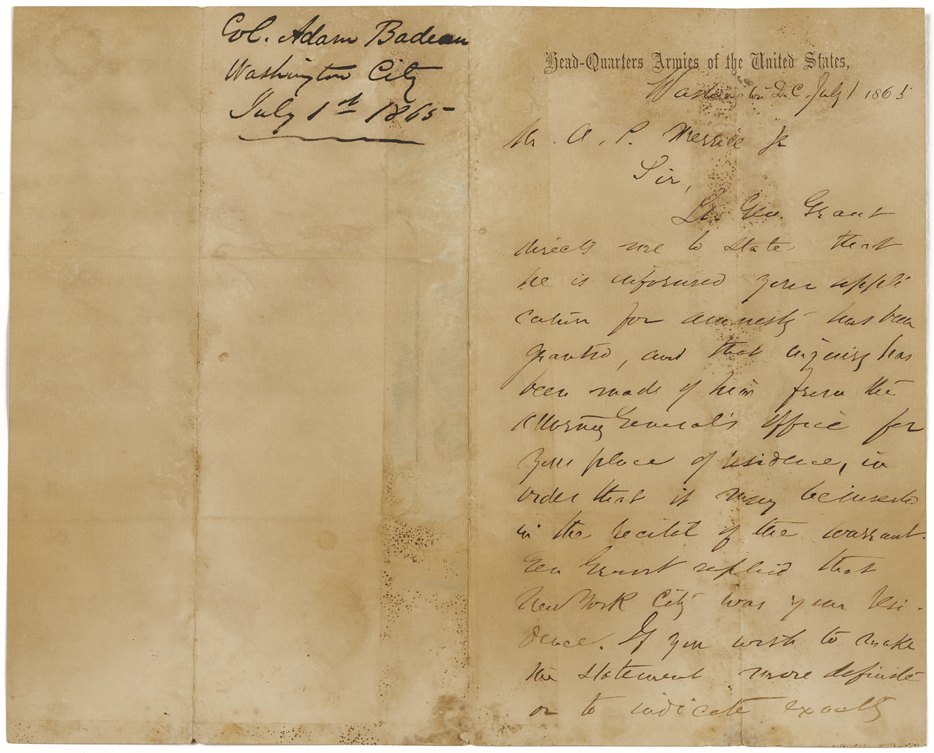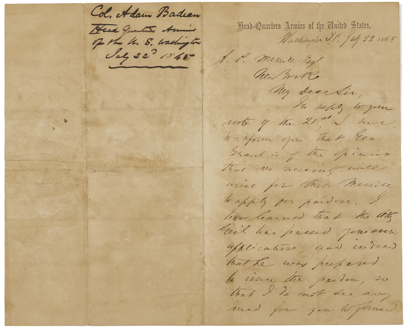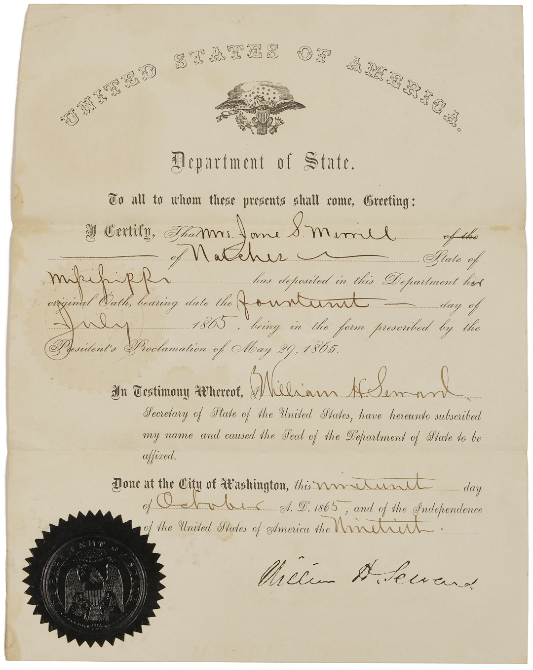 Merrill’s family fled Natchez for New York City during the Civil War, with direct assistance from Ulysses S. Grant. Lot includes loyalty oaths and amnesty-related correspondence with Grant’s secretary, Gen. Adam Badeau.