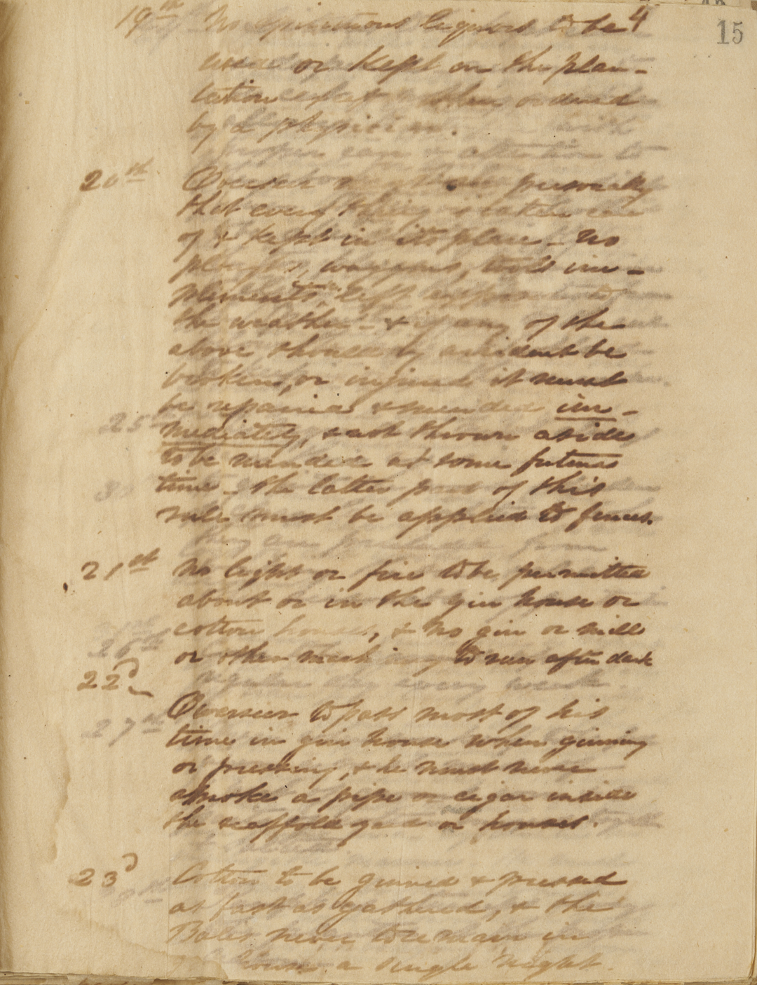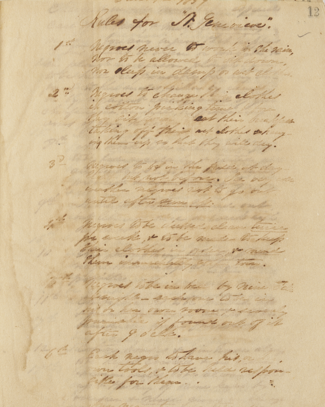 2nd item: Notebook with over 300 pages of letters, notes, documents, and other communications primarily written by Merrill and transferred from the originals Mann’s Parchment Copying Paper, an innovative 19th-century copying technology used for duplicating originals. Includes slave-related documents pertaining to life on the Merrill plantations of Natchez, MS and Concordia, LA, especially “Rules for ‘St. Genevieve’”: a list of 32 rules and guidelines, some pertaining to enslaved people and their working and living conditions. A related ledger book with names of people enslaved at St. Genevieve and other Merrill plantations was sold in Case Auctions Summer 2025 auction, Lot 502.