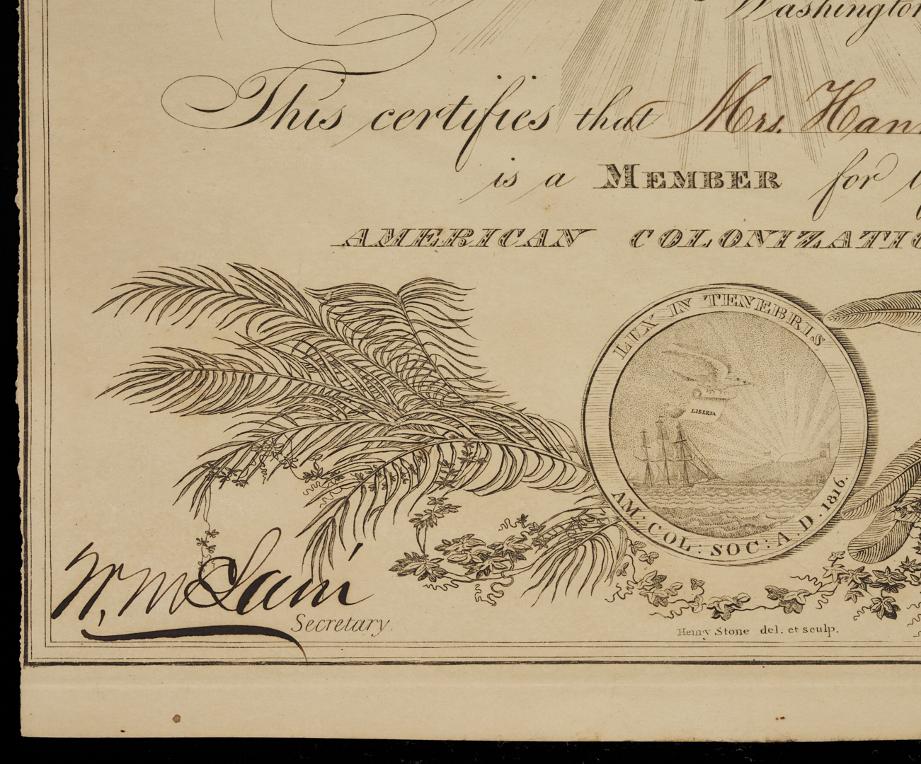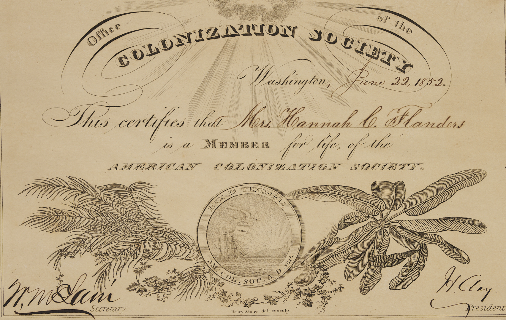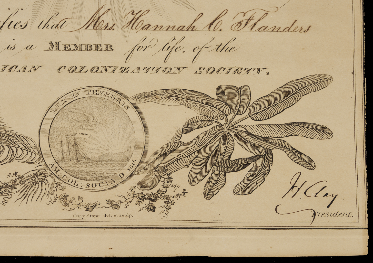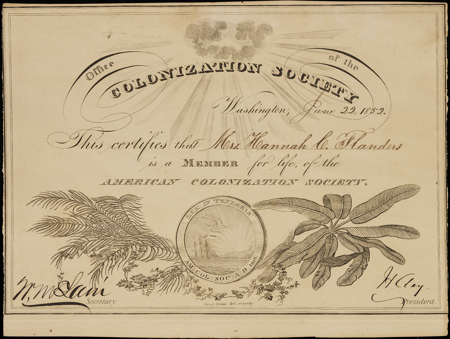 Rare Henry Clay autographed Black History – Liberia related document. American Colonization Society Membership Certificate for Mrs. Hannah C. Flanders, dated June 22, 1852, signed by Kentucky senator Henry Clay, president of the Society. The partially printed document (by Henry Stone) includes an engraving of a sailing ship with bird overhead holding a scroll with the word LIBERIA printed on it and measures 9 1/8 in. x 6 3/4 in. Note: The American Colonization Society was founded to encourage and support the repatriation of Emancipated Slaves and free persons of color to Liberia, located on the West African coast. Henry Clay (1777-1852) represented Kentucky in both the U.S. House and Senate. He was the seventh House Speaker and the ninth Secretary of State, and ran unsuccessfully for president in 1824, 1832 and 1844. He helped establish the American Colonization Society in 1816. Interestingly, this document is dated just one week before his death from an extended battle with tuberculosis, indicating these certificates (which rarely come on the market today) were likely signed by Clay well in advance of being issued.