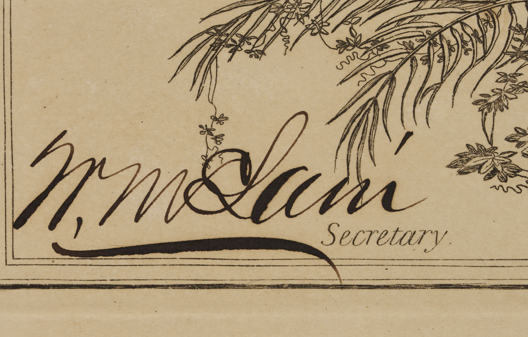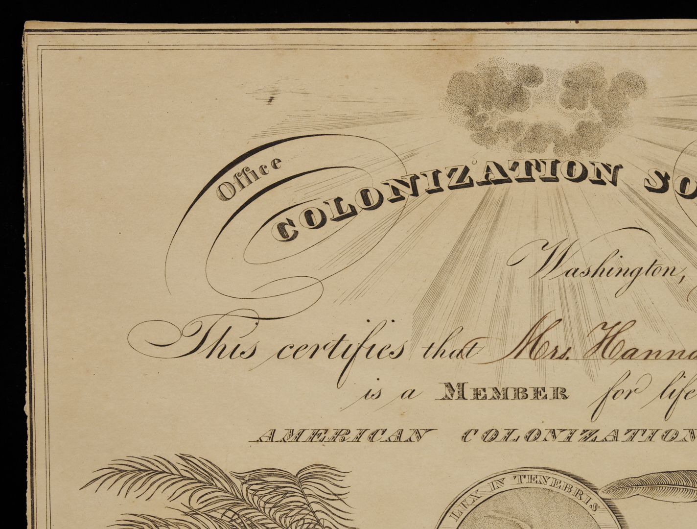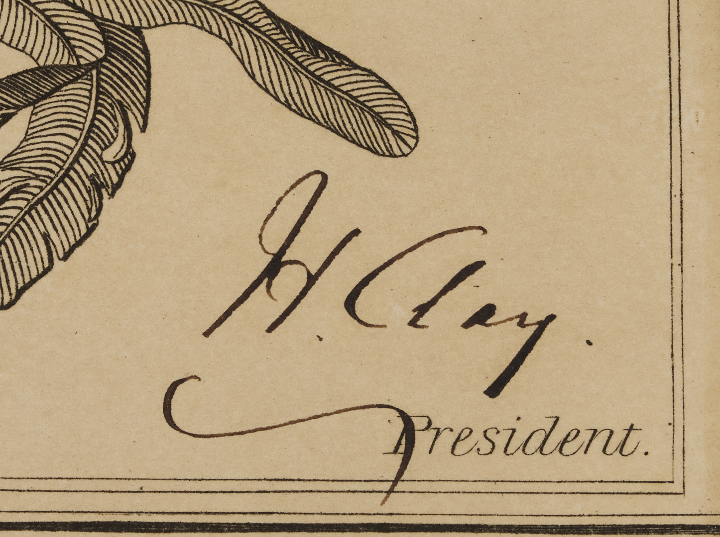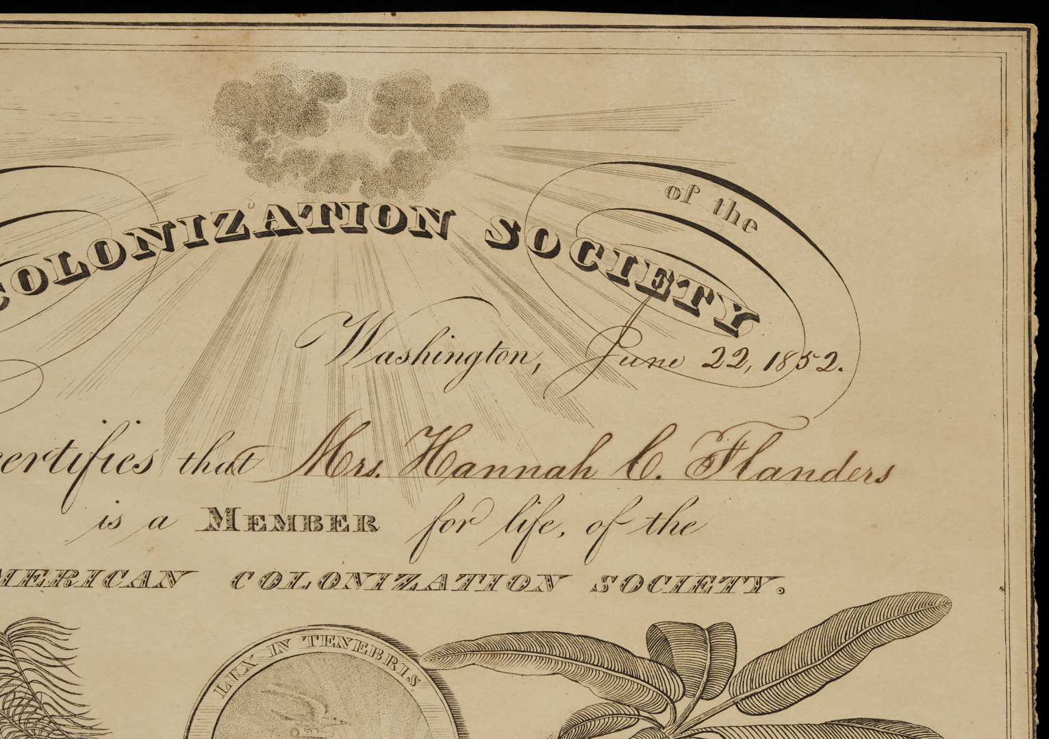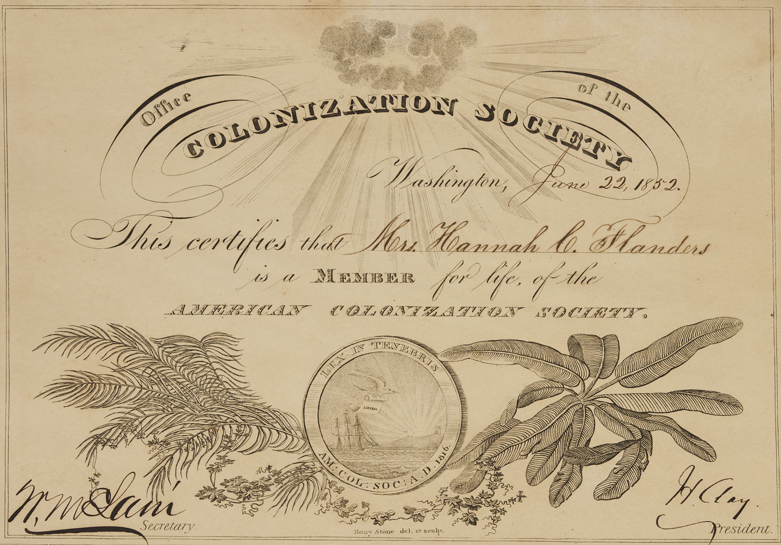 Rare Henry Clay autographed Black History – Liberia related document. American Colonization Society Membership Certificate for Mrs. Hannah C. Flanders, dated June 22, 1852, signed by Kentucky senator Henry Clay, president of the Society. The partially printed document (by Henry Stone) includes an engraving of a sailing ship with bird overhead holding a scroll with the word LIBERIA printed on it and measures 9 1/8 in. x 6 3/4 in. Note: The American Colonization Society was founded to encourage and support the repatriation of Emancipated Slaves and free persons of color to Liberia, located on the West African coast. Henry Clay (1777-1852) represented Kentucky in both the U.S. House and Senate. He was the seventh House Speaker and the ninth Secretary of State, and ran unsuccessfully for president in 1824, 1832 and 1844. He helped establish the American Colonization Society in 1816. Interestingly, this document is dated just one week before his death from an extended battle with tuberculosis, indicating these certificates (which rarely come on the market today) were likely signed by Clay well in advance of being issued.