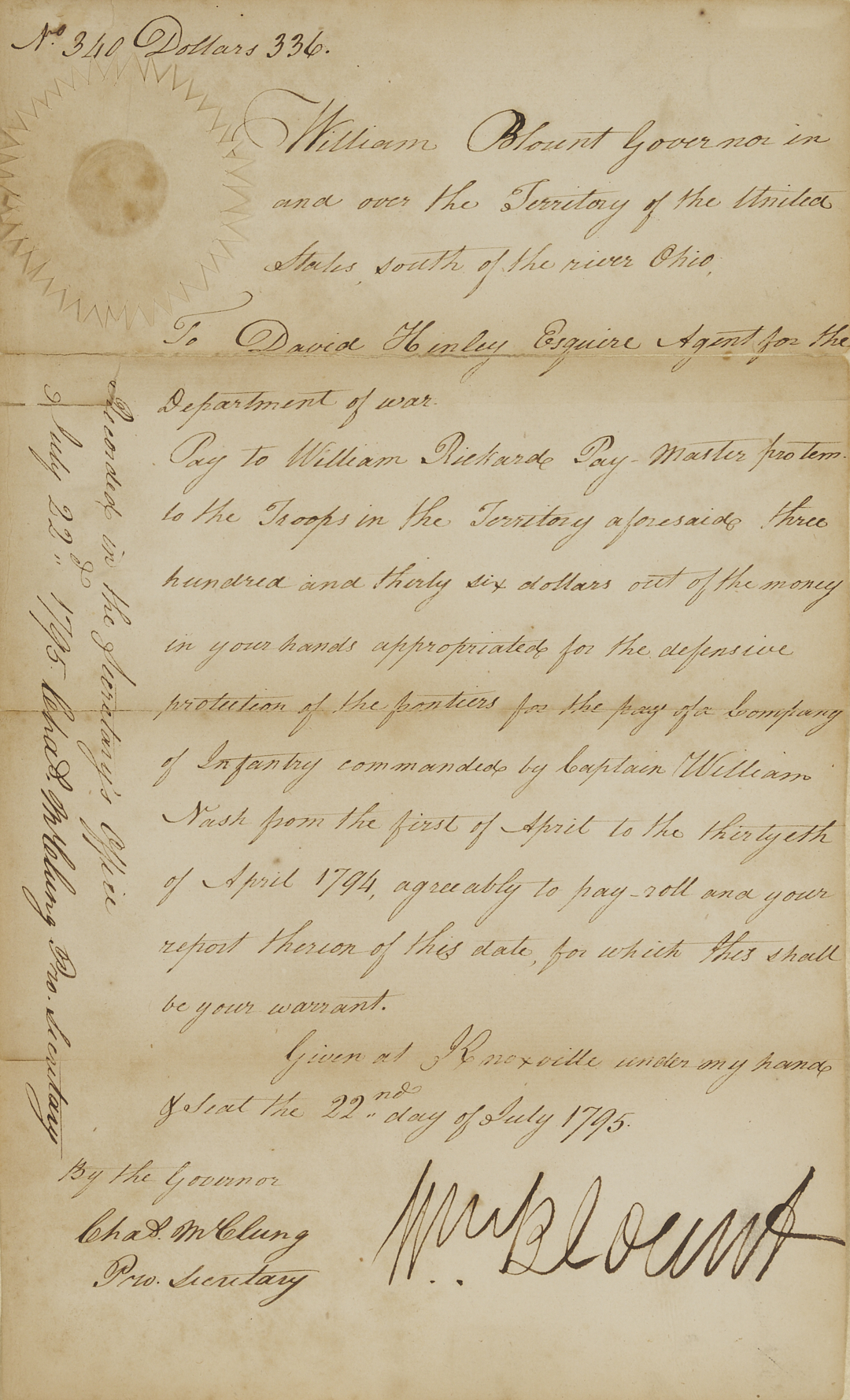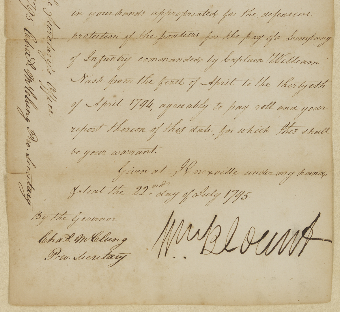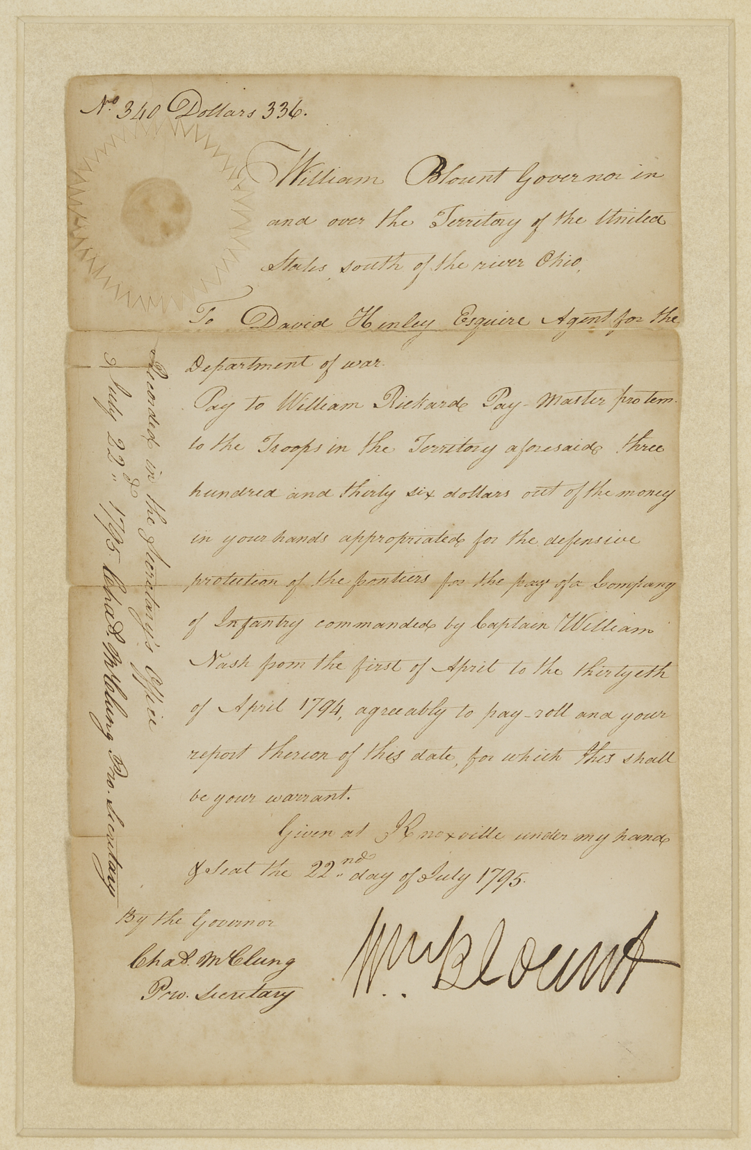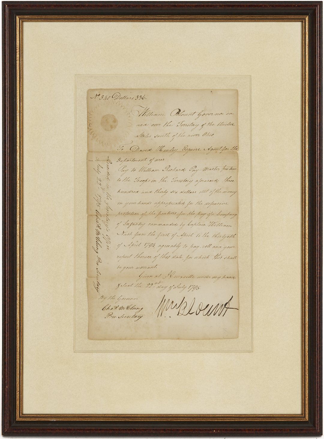 Original document signed by William Blount (1749-1800, served 1790-1796), the Governor of the Territory of the United States south of the river Ohio, dated July 22, 1795, written in Knoxville, Tennessee. A warrant for payment to William Richard, the Pay Master for the troops in the territory, for three hundred and thirty-six dollars, “for the pay of a Company of Infantry commanded by Capt. William Nash from the first of April to the thirtyeth of April 1794, agreeably to pay roll and your repost therin of this date, for which this shall be your warrant. Given at Knoxville under my hand the 22nd day of July 1795”. Float-mounted, framed, and housed under glass. Letter: 13 in. H x 7 3/4 in. W. Framed: 22 1/2 in. H x 16 1/2 in. W. Note: In February 1790, North Carolina ceded its western land holdings to the United States. A few months later, the area became the newly created Territory of the United States South of the River Ohio (the Southwest Territory). President George Washington appointed Blount territorial governor. In 1795, Blount called a meeting of the territorial legislature to request a referendum for statehood, and Tennessee officially became a state on June 1, 1796. (Source: The Tennessee Encyclopedia).