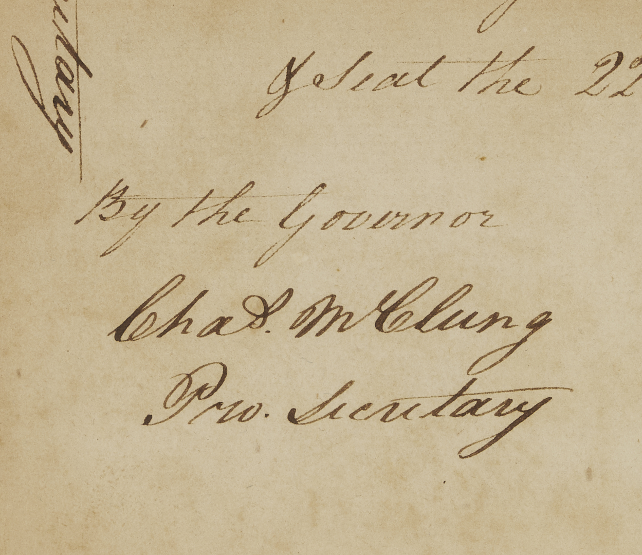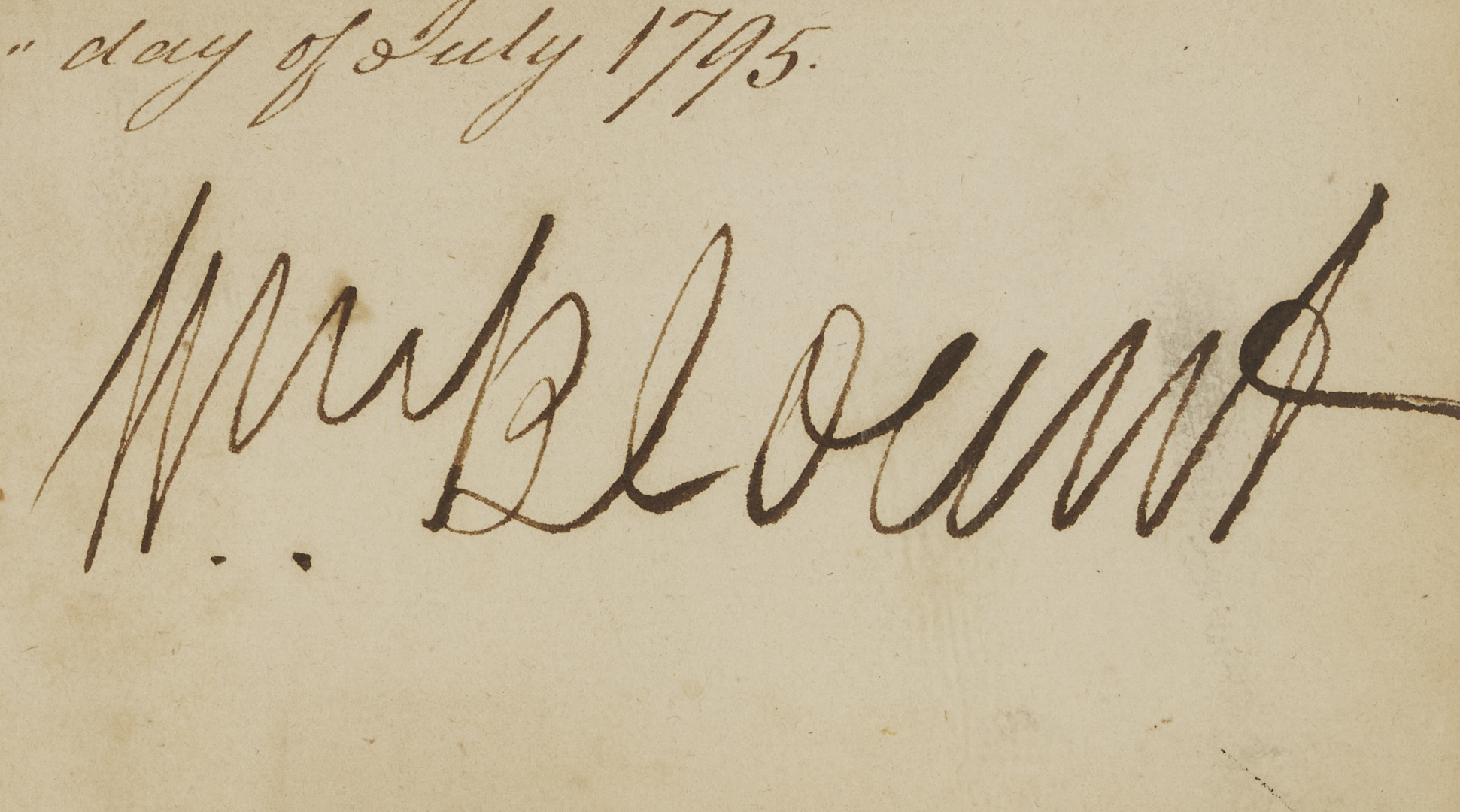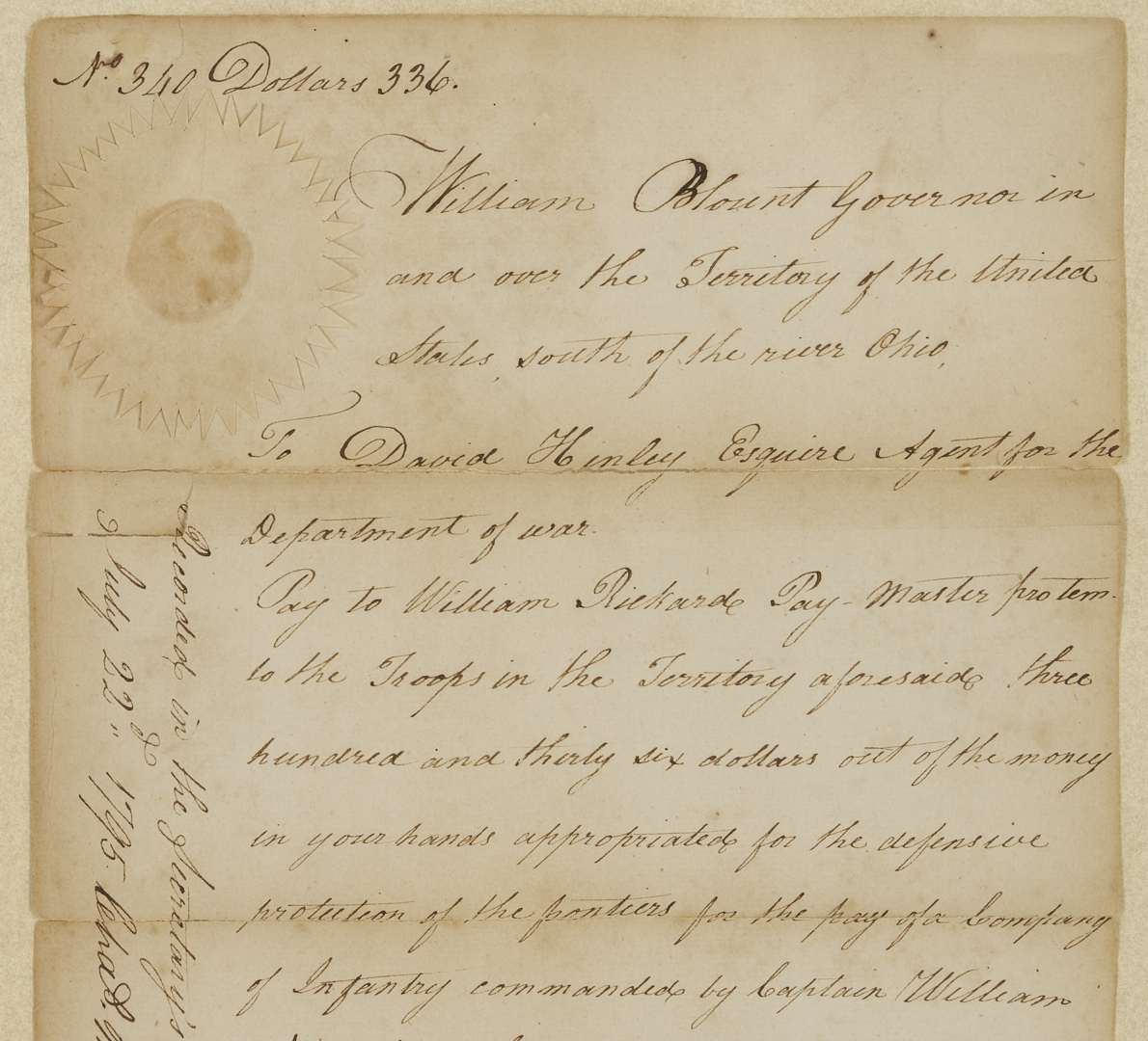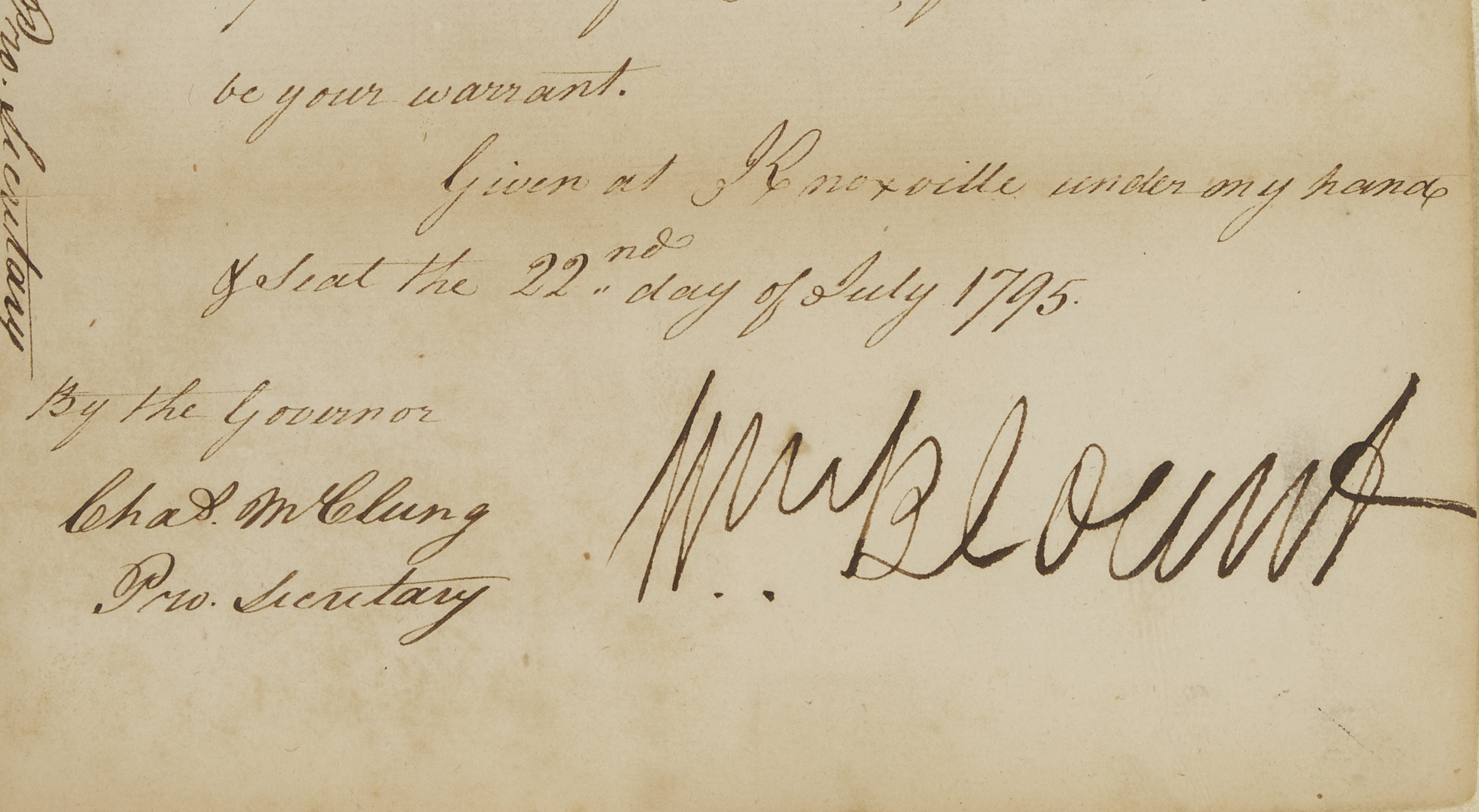 Original document signed by William Blount (1749-1800, served 1790-1796), the Governor of the Territory of the United States south of the river Ohio, dated July 22, 1795, written in Knoxville, Tennessee. A warrant for payment to William Richard, the Pay Master for the troops in the territory, for three hundred and thirty-six dollars, “for the pay of a Company of Infantry commanded by Capt. William Nash from the first of April to the thirtyeth of April 1794, agreeably to pay roll and your repost therin of this date, for which this shall be your warrant. Given at Knoxville under my hand the 22nd day of July 1795”. Float-mounted, framed, and housed under glass. Letter: 13 in. H x 7 3/4 in. W. Framed: 22 1/2 in. H x 16 1/2 in. W. Note: In February 1790, North Carolina ceded its western land holdings to the United States. A few months later, the area became the newly created Territory of the United States South of the River Ohio (the Southwest Territory). President George Washington appointed Blount territorial governor. In 1795, Blount called a meeting of the territorial legislature to request a referendum for statehood, and Tennessee officially became a state on June 1, 1796. (Source: The Tennessee Encyclopedia).