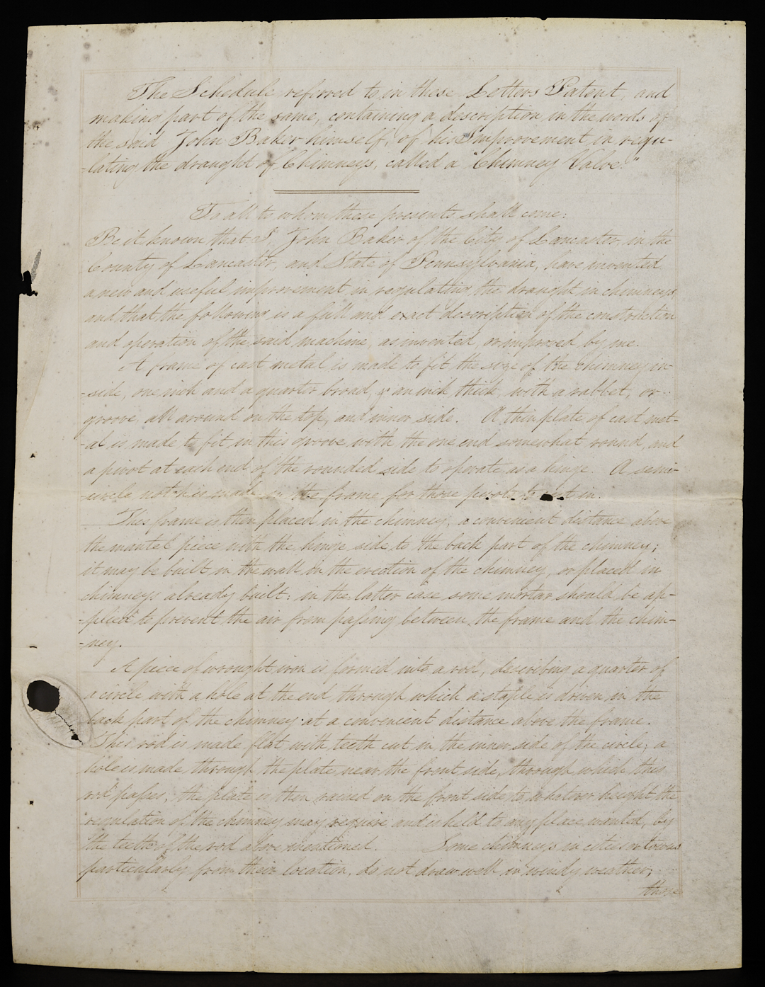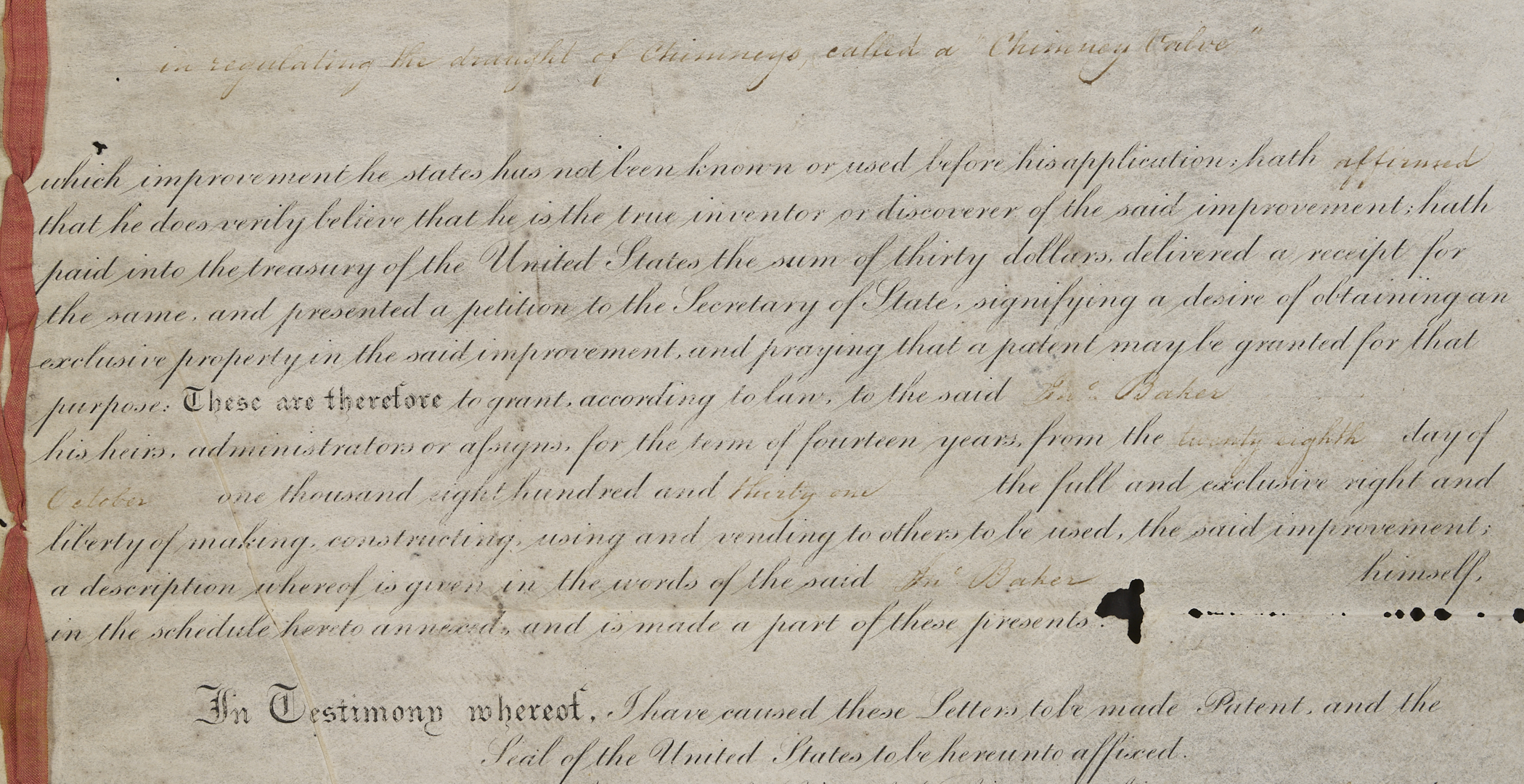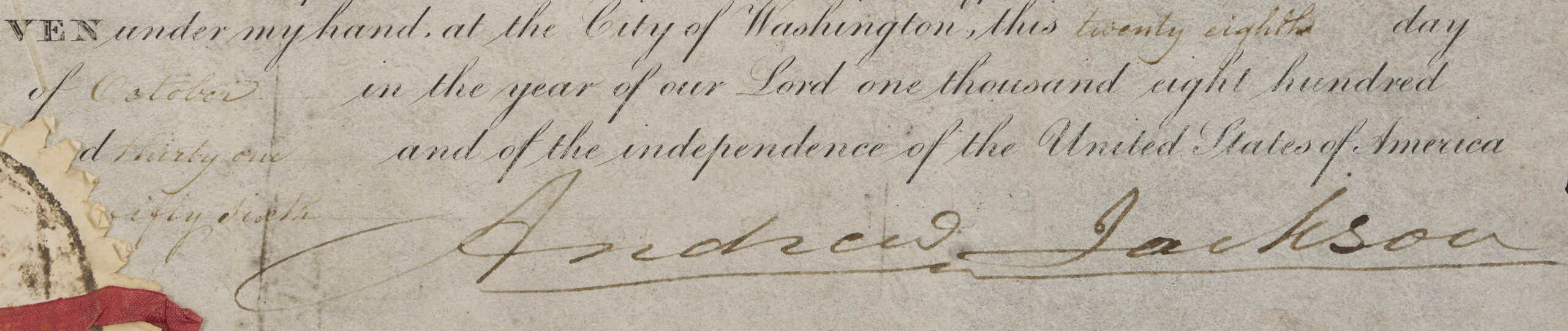 U. S. President Andrew Jackson (1767-1845), large and bold autograph signature on two-page Letters Patent for John Baker’s “improvement in regulating the draught of chimneys, called a Chimney Valve,” dated Oct. 28, 1831. Countersigned by Secretary of State Edward Livingston and Attorney General B.B. Taney. White wafer seal and pink ribbons adhered at the lower left. Jackson’s signature is very large, measuring over 6 1/2 in. long. The second page of the patent features a detailed description of the Chimney Valve, written and signed by Baker, a resident of Lancaster, PA. 2 pages, each 14 in. H x 11 in. W. The documents are enclosed (not attached) in a tooled leather portfolio, 16 1/2 in H x 14 in. W.