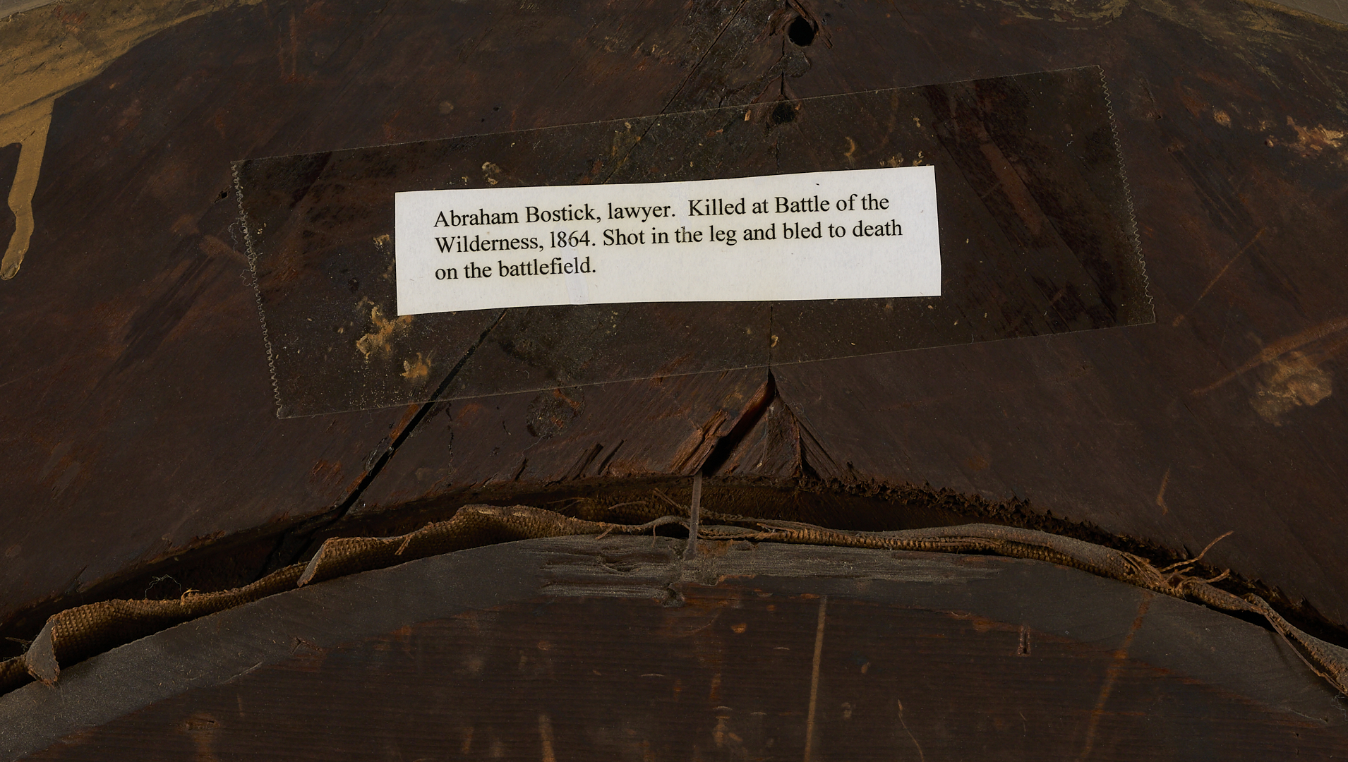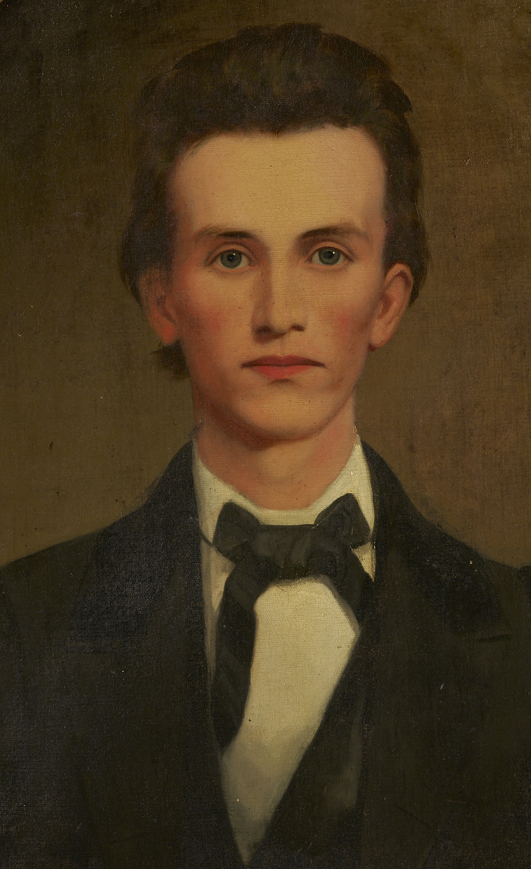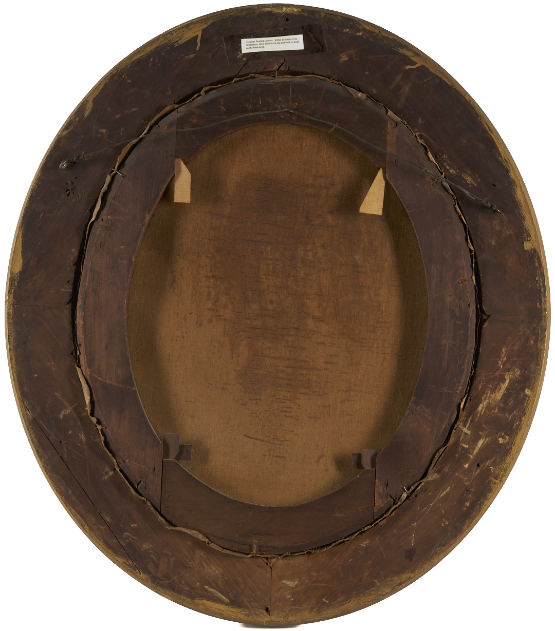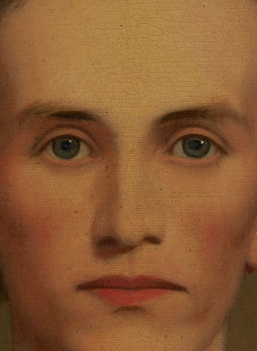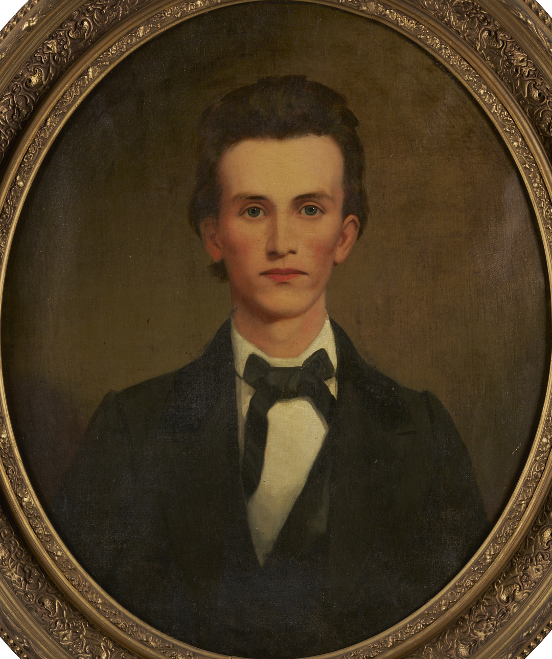Washington Bogart Cooper (Tennessee, 1802-1882) oil on canvas oval portrait of Abraham (Abram) Bostick of Nashville, Tennessee. Bostick is depicted shortly before his death at age 20, fully facing the viewer and wearing a black coat and tie with white shirt. Unsigned, in original oval carved and molded giltwood and composition frame. Sight: 29 in. H x 24 in. W. Frame: 39 in. H x 33 in. W. Note: Abram (Abraham) Bostick was born Nov. 18, 1840 to Hardin and Margaret Litton Bostick of Nashville. He was a 20 year old teacher when he enlisted in Company A, 7th Tennessee Infantry Regt. in 1861. He later served in Company K, where his brother, Thomas Hardin Bostick, was Captain. Abram was promoted to Sergeant Major just a few days before he was fatally wounded at Gainesville, VA, on June 28, 1862. Abram was the nephew of the painter, Washington Bogart Cooper (through his mother’s sister). Cooper’s account book shows Abram’s family paid for multiple portraits over the years (although not every sitter was named). The full-facing positioning of the subject, unusual for Cooper, suggests this portrait may have been painted posthumously, from a CDV. Artist biography: Washington Cooper was born near Jonesboro, TN in 1802, but by 1820 he and his family were in Bedford County in Middle TN. According to family tradition, in about 1828, Cooper -who was known for sketching people and animals on any surface he could find- caught the attention of an artist whose name is not presently known, and was given some brief instruction in Murfreesboro. According to the later writings of his younger brother and fellow artist, William Cooper, in 1830 Washington Cooper moved to Nashville and a year later had earned enough money to travel to Philadelphia for a year to study with Thomas Sully and Henry Inman. Cooper returned to Nashville, where he commenced a prolific career in portraiture. Between 1837 and 1846, he averaged thirty five portraits a year. He was able to fund a formal art education in New York and Europe for his brother, William Cooper. William eventually returned to the South and also painted portraits, including many in Nashville. In the early 1840s, Washington Cooper traveled briefly to paint in the Northeast and New Orleans, but he otherwise worked mainly in the Nashville area until three years before his death in 1888 at the age of 86. He painted a series of portraits of the governors of Tennessee, a series of portraits of the Masonic Grand Masters of Nashville, and a series of portraits of Bishops of the Methodist Episcopal Church, along with a significant number of portraits of wealthy gentlemen, ladies, and their children, which remain in Tennessee private homes and institutional collections today. (Source: James C. Kelly, “Portrait Painting in Tennessee,” The Tennessee Historical Quarterly, Winter, 1987, Vol. XLVI No. 4).