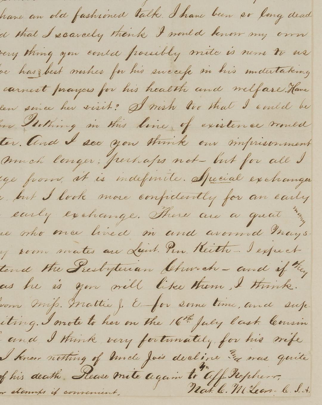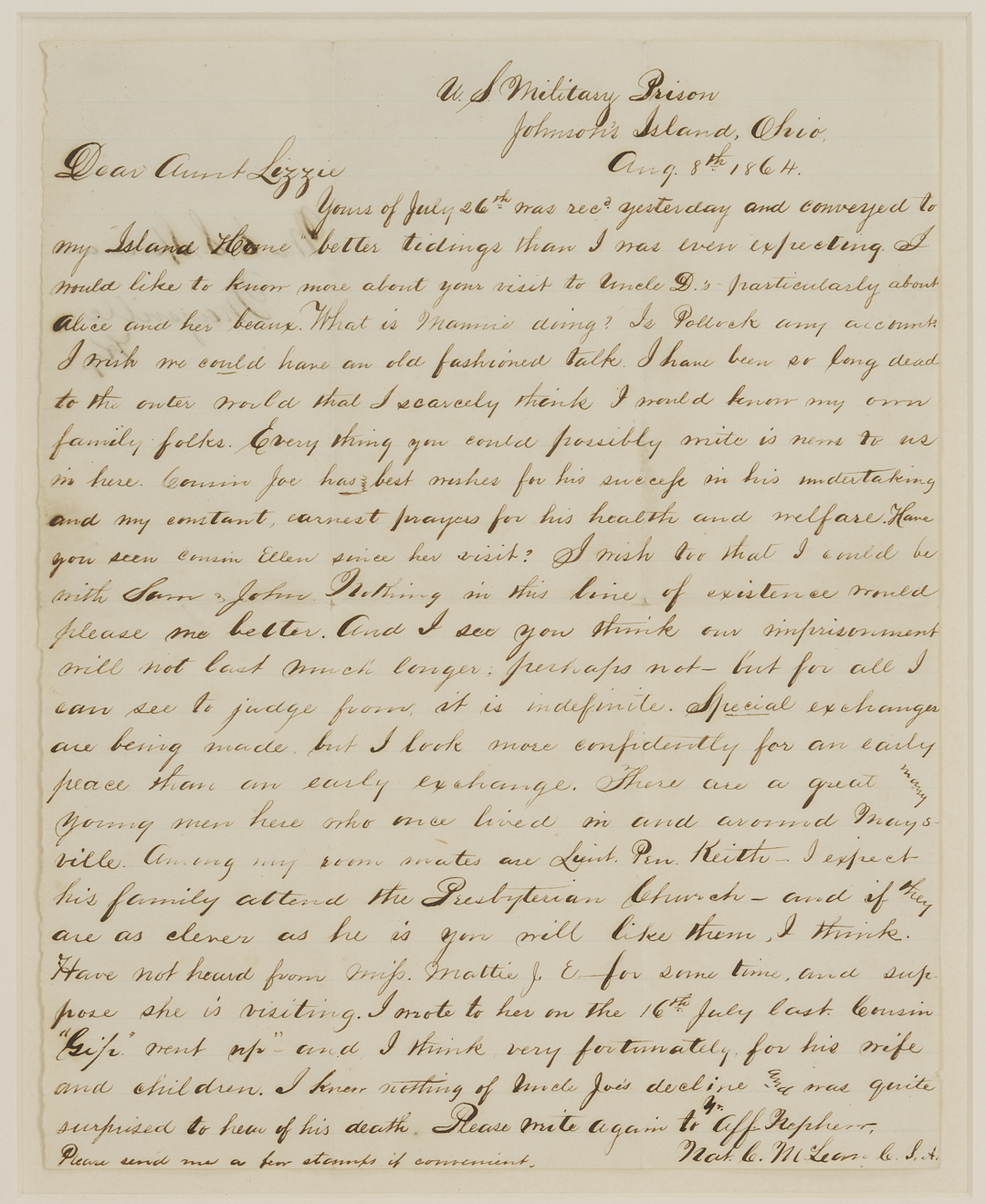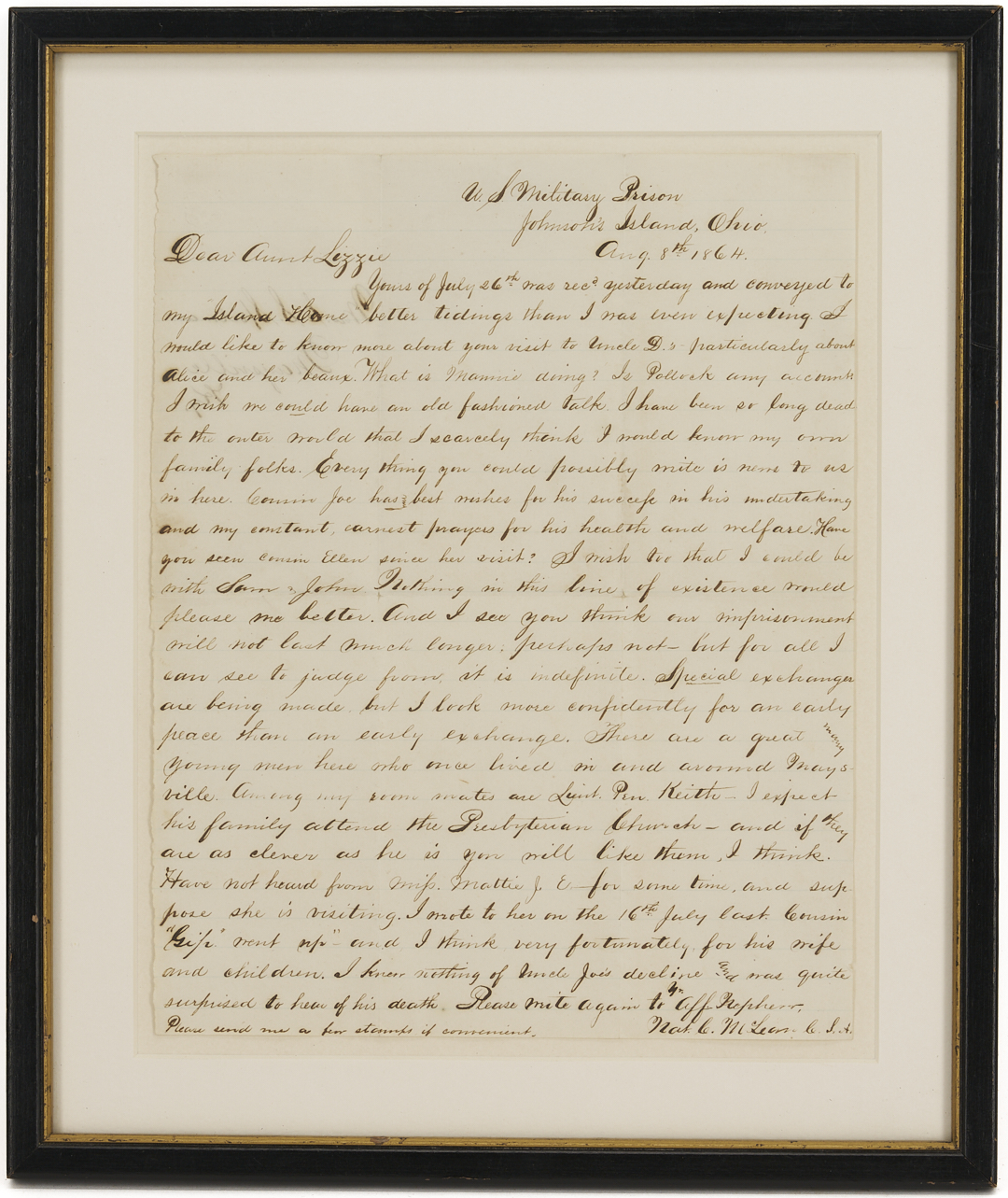 Civil War Letter from Nat C. McLean of the Kentucky 8th and 10th (Johnson’s) Cavalry, Co. E, written from Johnson’s Island Prison, Ohio, dated Aug. 8 1864. Johnson’s Cavalry took part in John Hunt Morgan’s famous Christmas raid and ill-fated Indiana-Ohio raid. During the latter, the majority of the regiment were captured and imprisoned, many for the duration of the war. It is not clear when and where McLean was captured, but in this letter, McLean is pessimistic about his chances for release and confides to his aunt, “I have been so long dead to the outer world that I scarcely think I would know my own family folks… I look more confidently for an early peace than an early exchange.” The missive mainly revolves around family matters and news from back home in Kentucky. Of his fellow prisoners, he mentions “…There are a great many young men here who once lived in and around Maysville,” specifically his roommate Lt. Pen Keith. 1 page, pen and ink on lined paper, 9 3/4 in. H x 7 5/8 in. W. Framed and mounted under glass in a frame with black and gold edges, 13 in. H x 11 in. W.