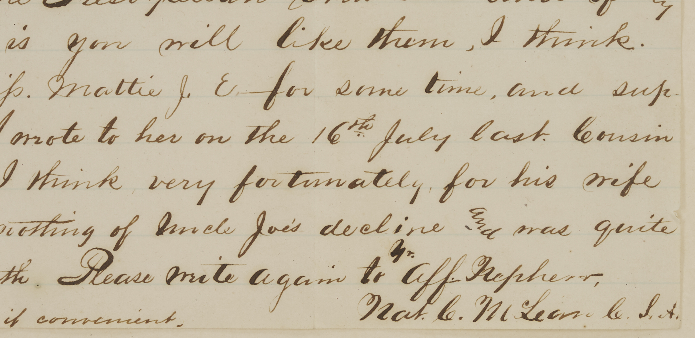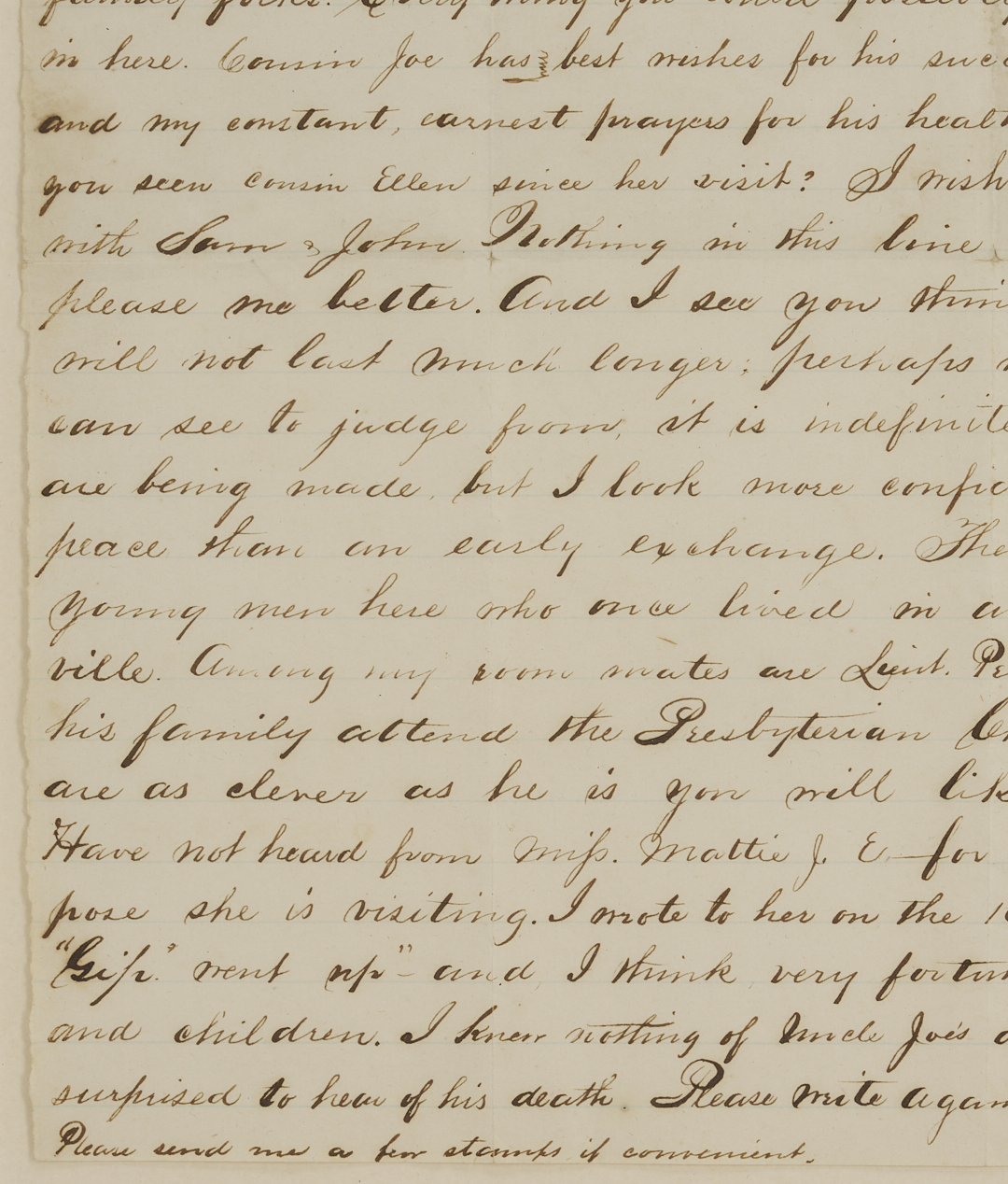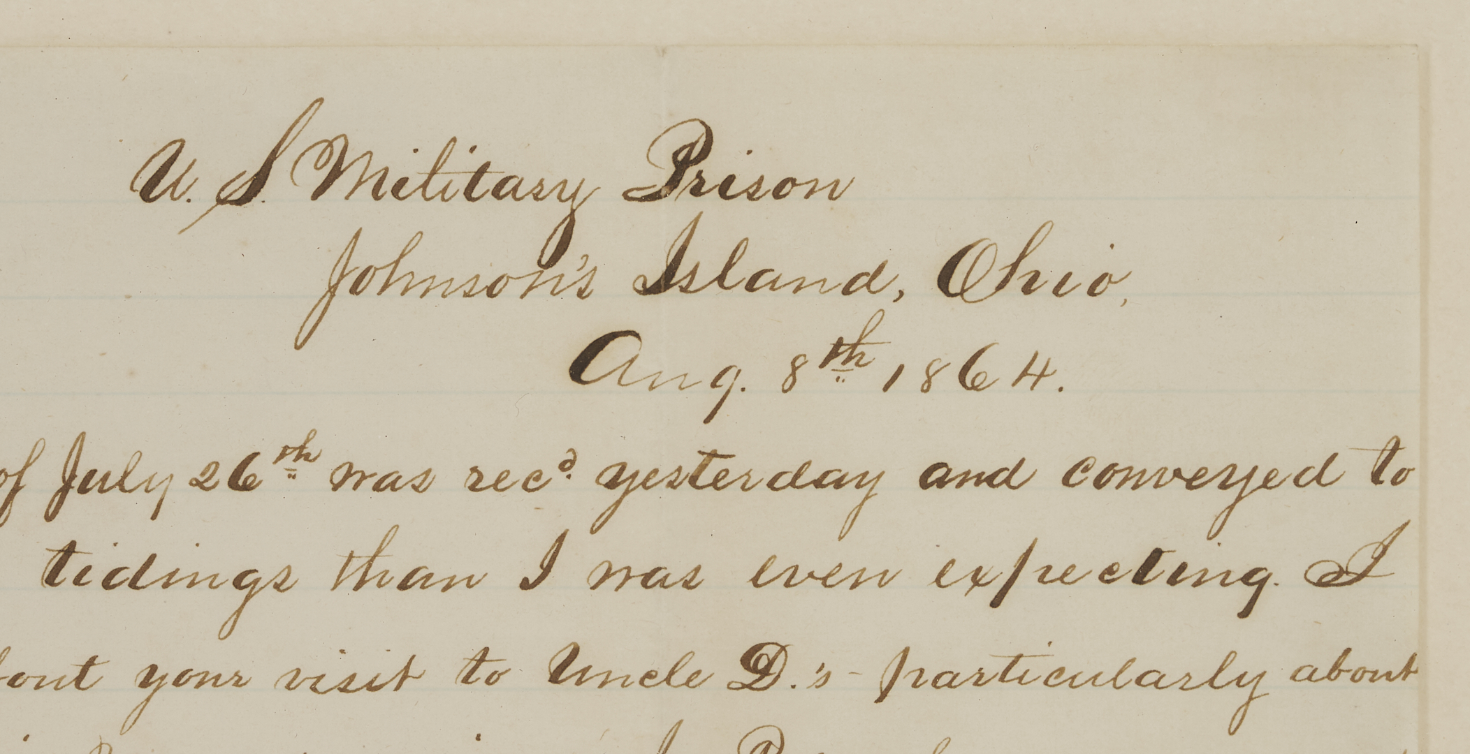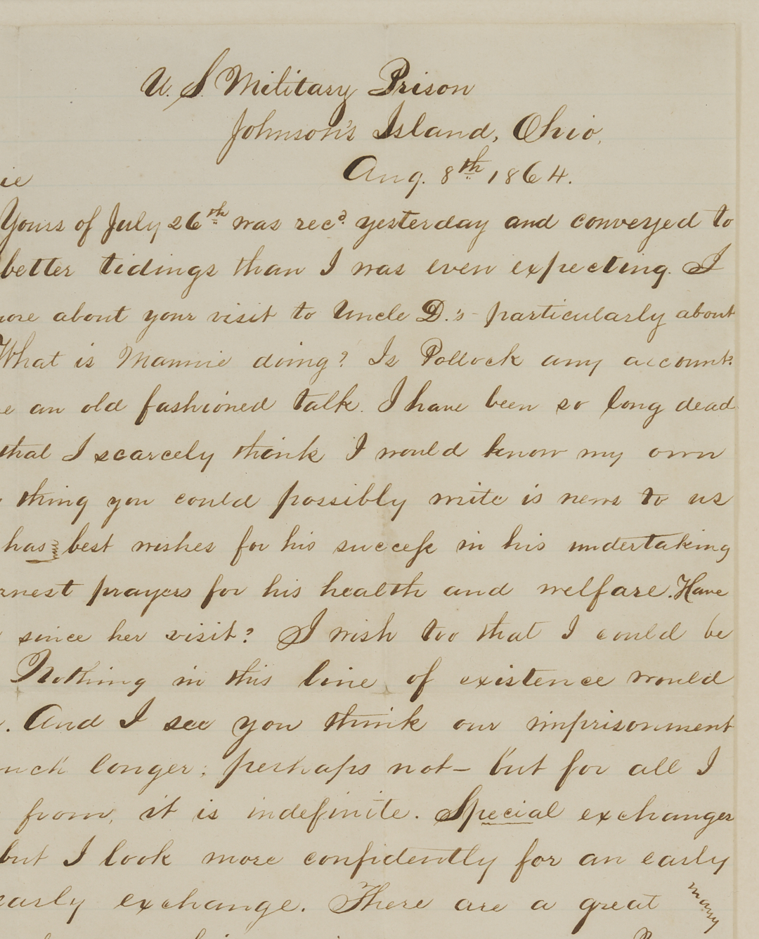 Civil War Letter from Nat C. McLean of the Kentucky 8th and 10th (Johnson’s) Cavalry, Co. E, written from Johnson’s Island Prison, Ohio, dated Aug. 8 1864. Johnson’s Cavalry took part in John Hunt Morgan’s famous Christmas raid and ill-fated Indiana-Ohio raid. During the latter, the majority of the regiment were captured and imprisoned, many for the duration of the war. It is not clear when and where McLean was captured, but in this letter, McLean is pessimistic about his chances for release and confides to his aunt, “I have been so long dead to the outer world that I scarcely think I would know my own family folks… I look more confidently for an early peace than an early exchange.” The missive mainly revolves around family matters and news from back home in Kentucky. Of his fellow prisoners, he mentions “…There are a great many young men here who once lived in and around Maysville,” specifically his roommate Lt. Pen Keith. 1 page, pen and ink on lined paper, 9 3/4 in. H x 7 5/8 in. W. Framed and mounted under glass in a frame with black and gold edges, 13 in. H x 11 in. W.