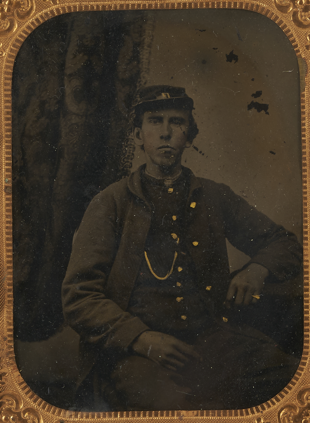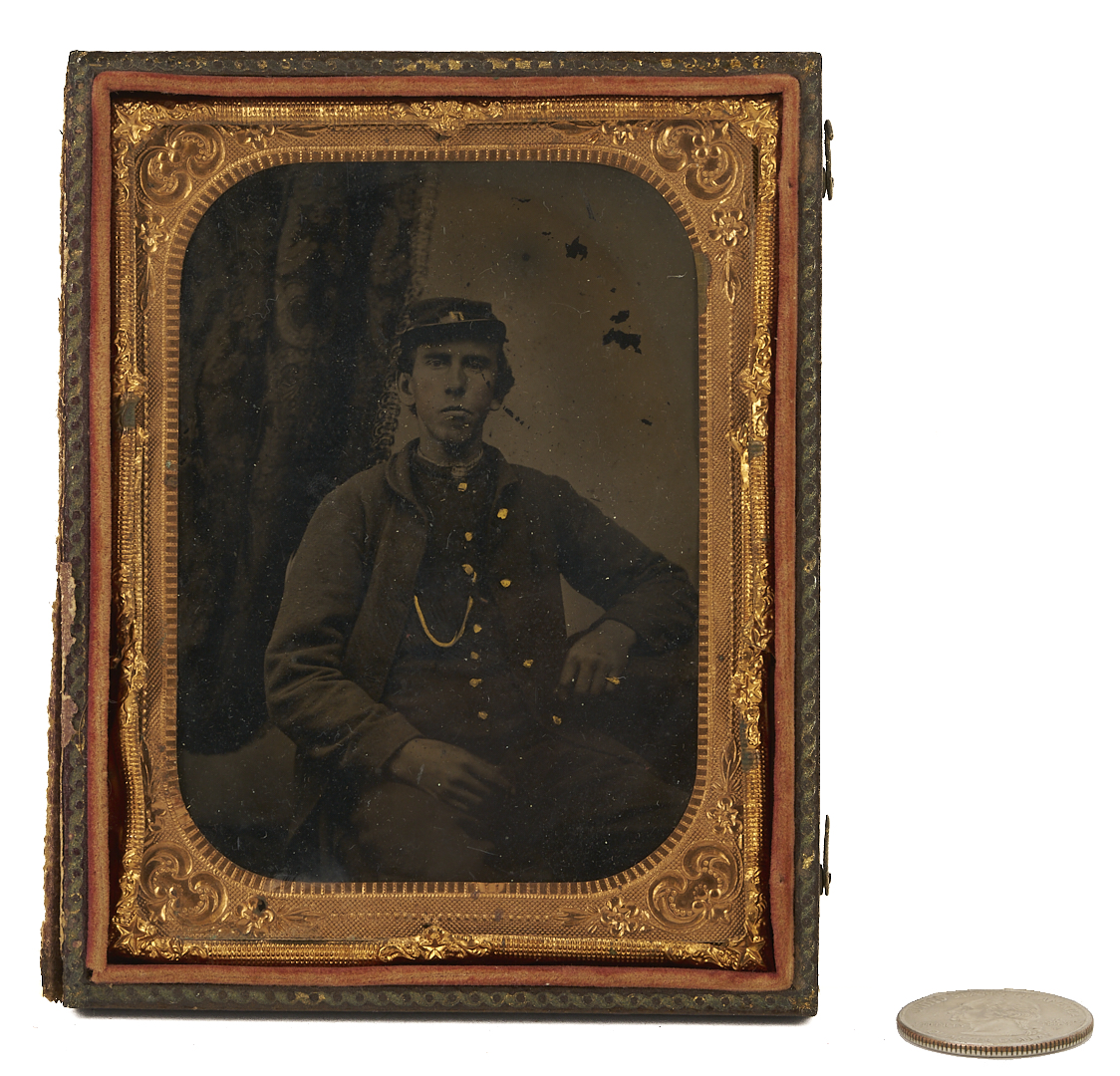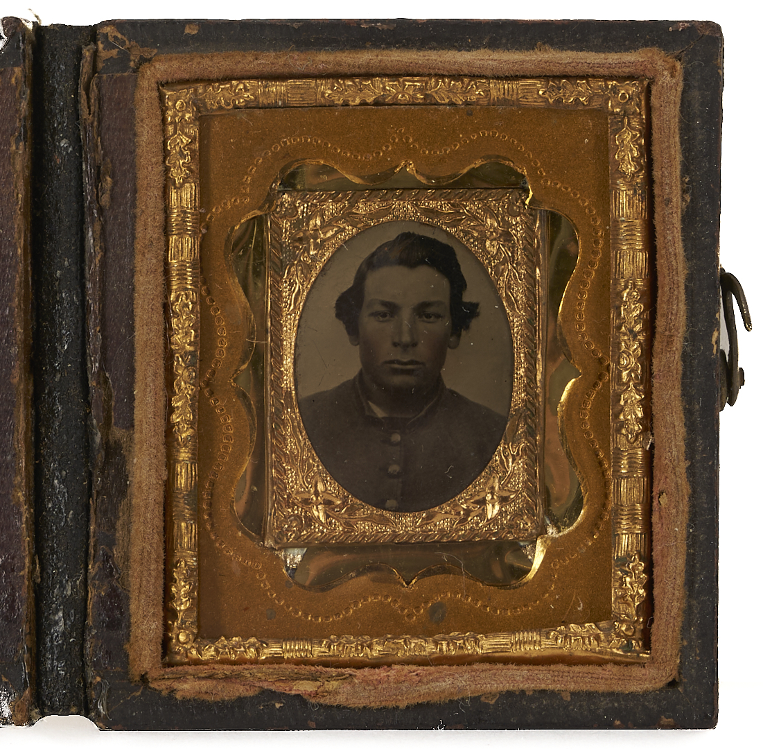 3 Civil War soldier images, including 1 gem-sized bust portrait of a Confederate soldier, unidentified, in a leather case, and 1 ninth-plate sized half-length portrait of an unidentified seated Union soldier in gutta percha case. Also included is a Quarter Plate size tintype of a seated soldier wearing what appears to be a Union uniform, with inscription to tape en verso noting his identity as Robert B. or H. Lovell (not Covell). The NPS Soldiers and Sailors Database shows a Robert B. Lovell, born 1840 in Nashville, Tennessee (served as a private in Baxter’s Company, Tennessee Light Artillery, and died April 13, 1862, in a Knoxville hospital of typhoid fever), and a Robert H. Lovell of the 8th Indiana Regt. (Note: This image was acquired in Nashville, Tennessee, but with no further provenance). All American, circa 1860-65.