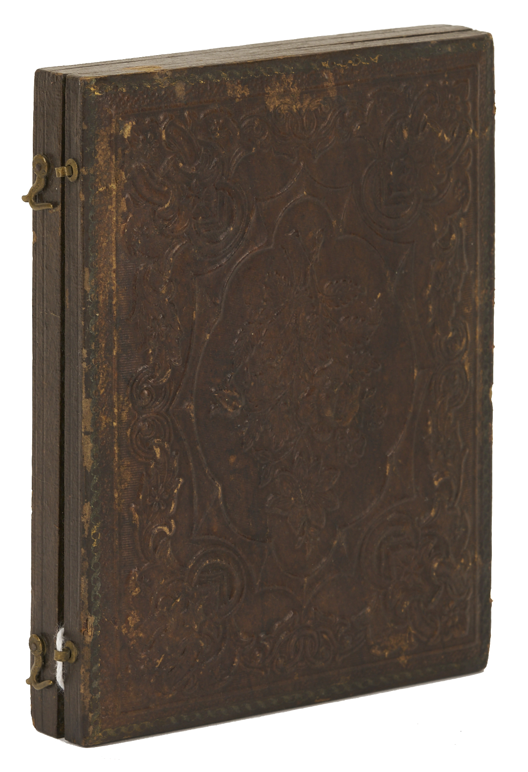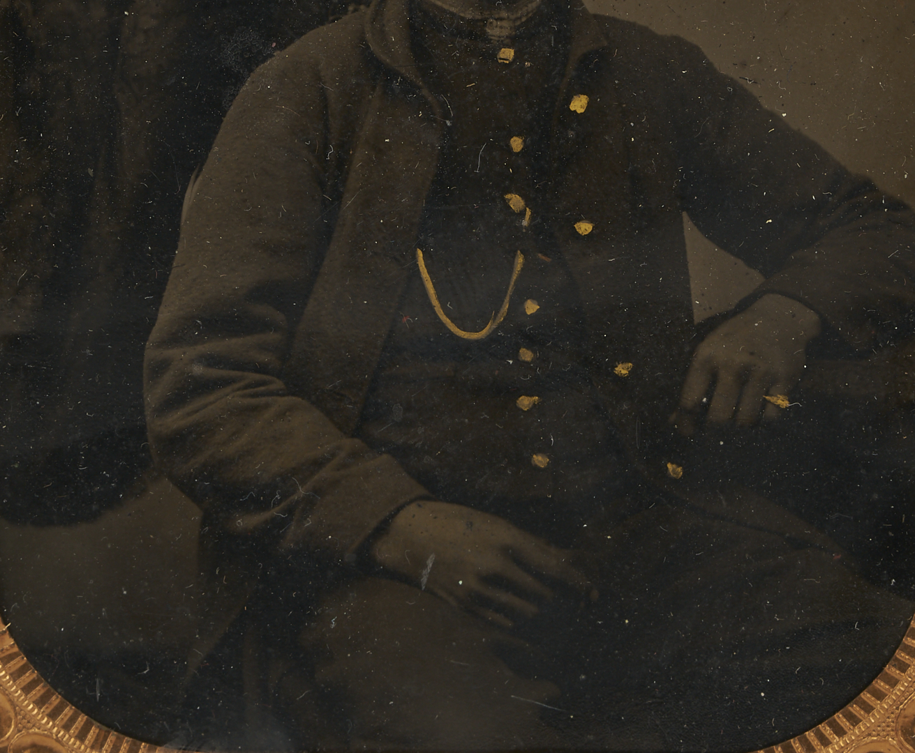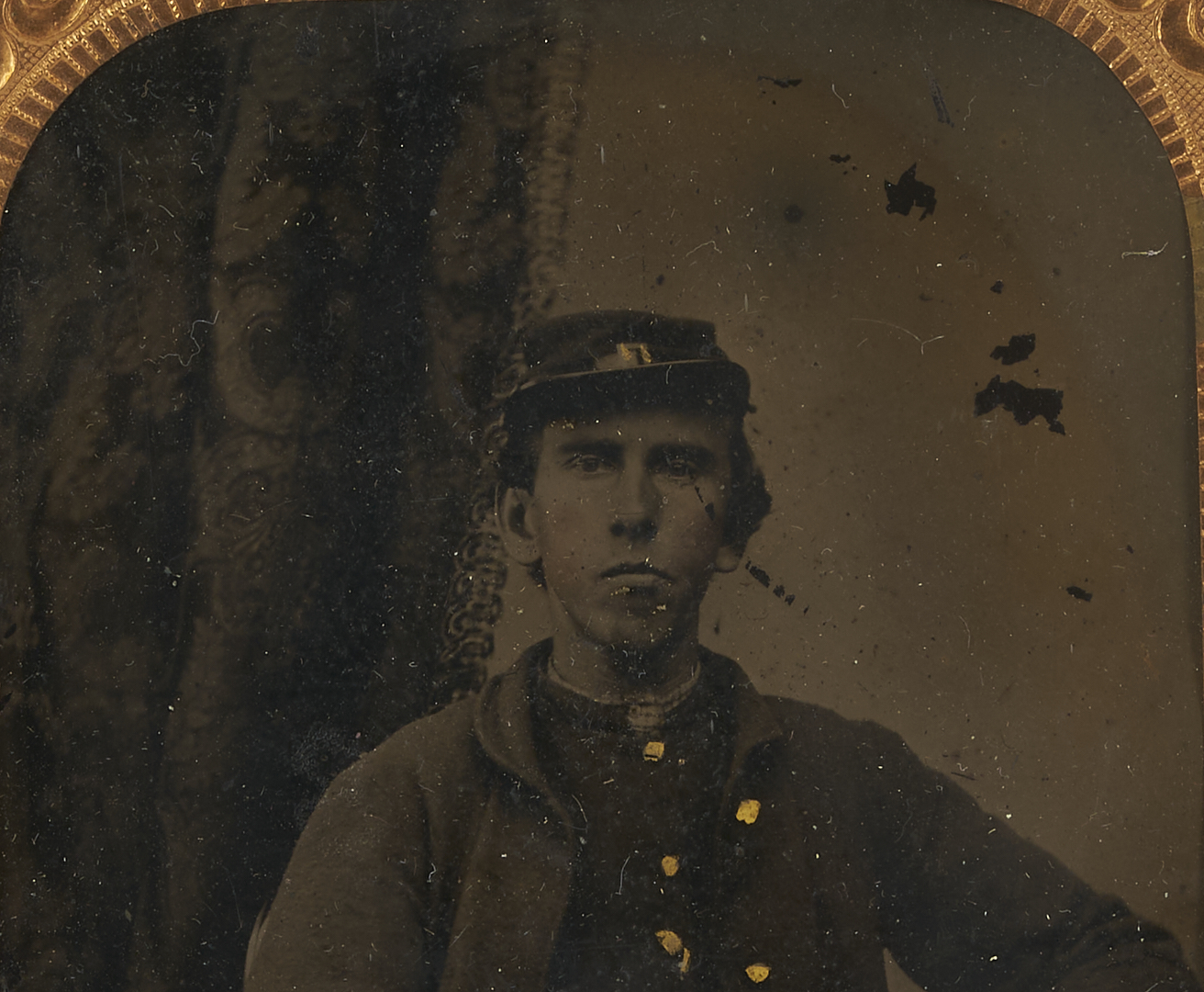 Gem-sized Confederate image in excellent condition. Ninth plate image with lifting to the emulsion lower left corner. Quarter plate image with flakes and a scratch to the upper right quadrant of the image, with the scratch affecting the subject’s face. The case is separated into halves.