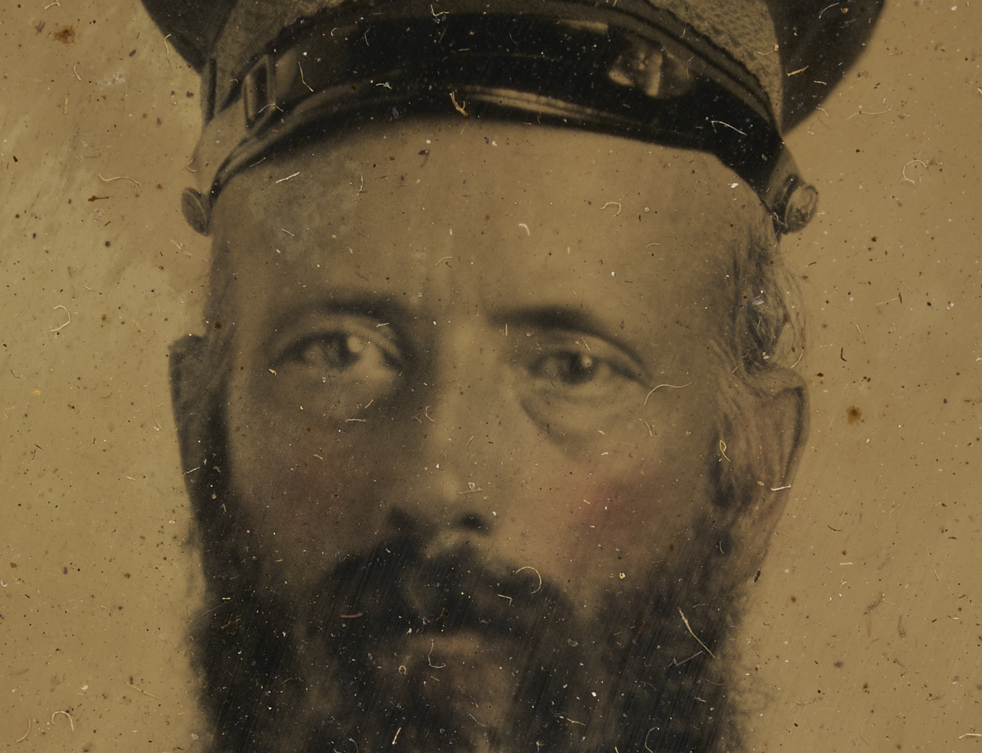 Four (4) Civil War era tintypes, including Colonel Calvin Harvey Walker of the 3rd Tennessee Infantry (Clack’s Tennessee Brigade). Sixth plate image of Walker wearing a captain’s frock and Wheel Cap, set in gutta percha case. Walker, nicknamed “Old Ballie”, enlisted as a Captain and was later elected as Colonel of the 3rd Tennessee after his release from capture at the Battle of Fort Donelson. At the Battle of Kolb Farm, Walker was killed when a shell exploded and a fragment struck him in the face. An eyewitness noted that the shrapnel “blew off all his head except chin and rather long whiskers.” A photograph of Walker with his brother James is featured on the cover of the book From the Flame of Battle to the Fiery Cross: The 3rd Tennessee Infantry With Complete Roster. Also included is one sixth plate image of a soldier identified on accompanying tag as Henry P. Covault of the 11th Ohio Infantry company G, with patriotic mat stamped with flag, shield and banner insignia. According to the tag accompanying this lot, Covault was wounded on Sept. 1, 1862 at the second battle of Bull Run at Manassas, VA. (Note: we have not independently verified this information). Also included is one sixth plate image of a soldier holding a rifle with inscription “My father’s picture Civil War”; and one ninth plate image of an unidentified soldier. All in leather cases except where noted.