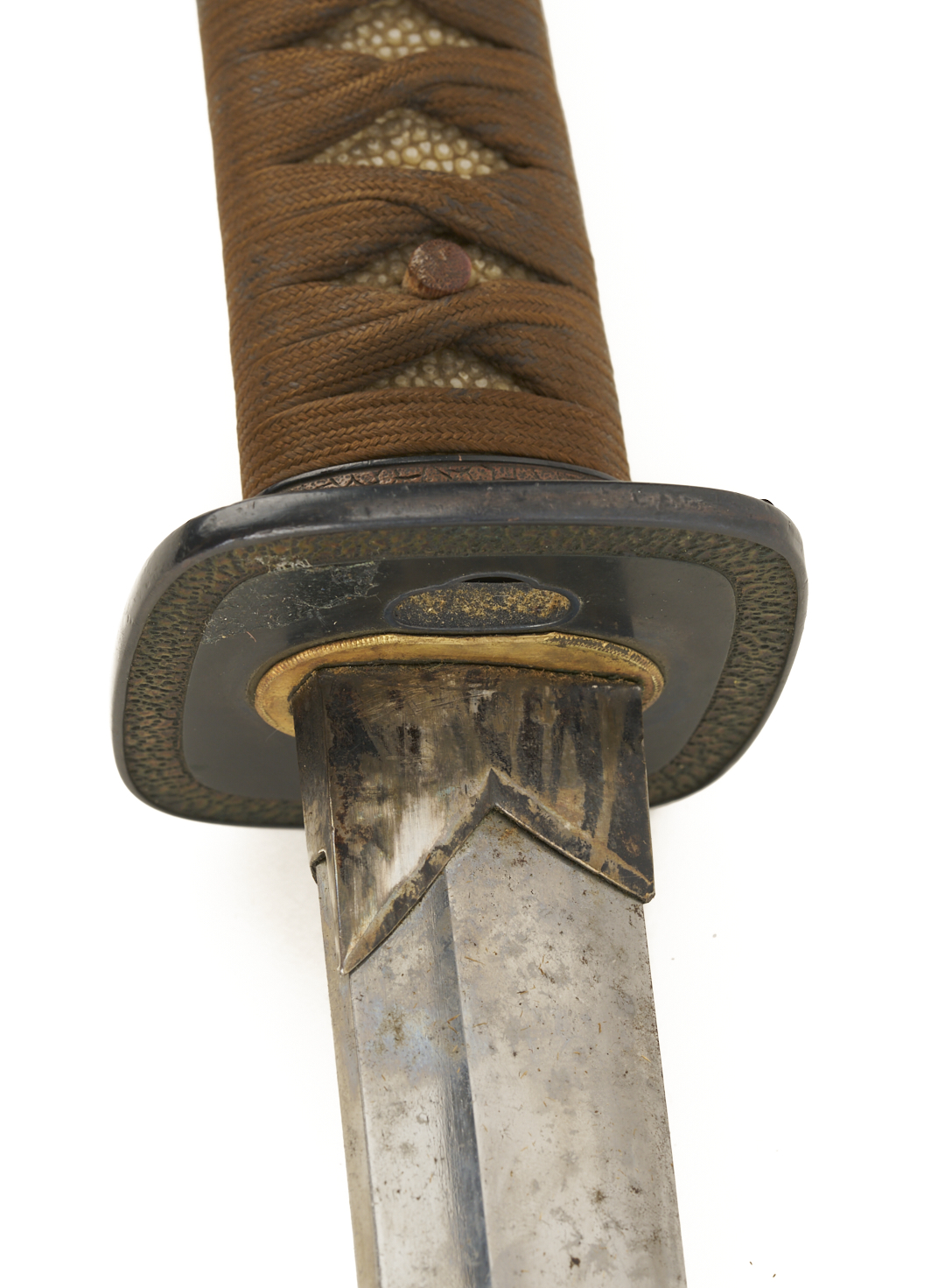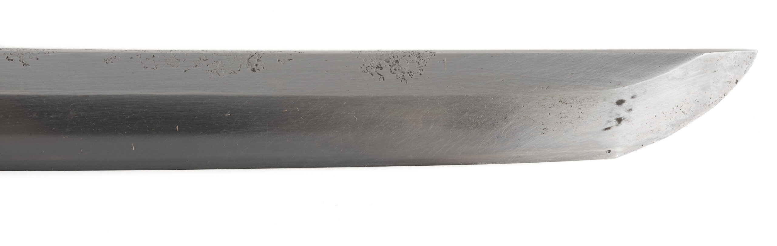 CONDITION: Saya (scabbard) with some flakes of missing lacquer, tape repair. Blade sharpened, with some light pitting and rust spots to nakago.