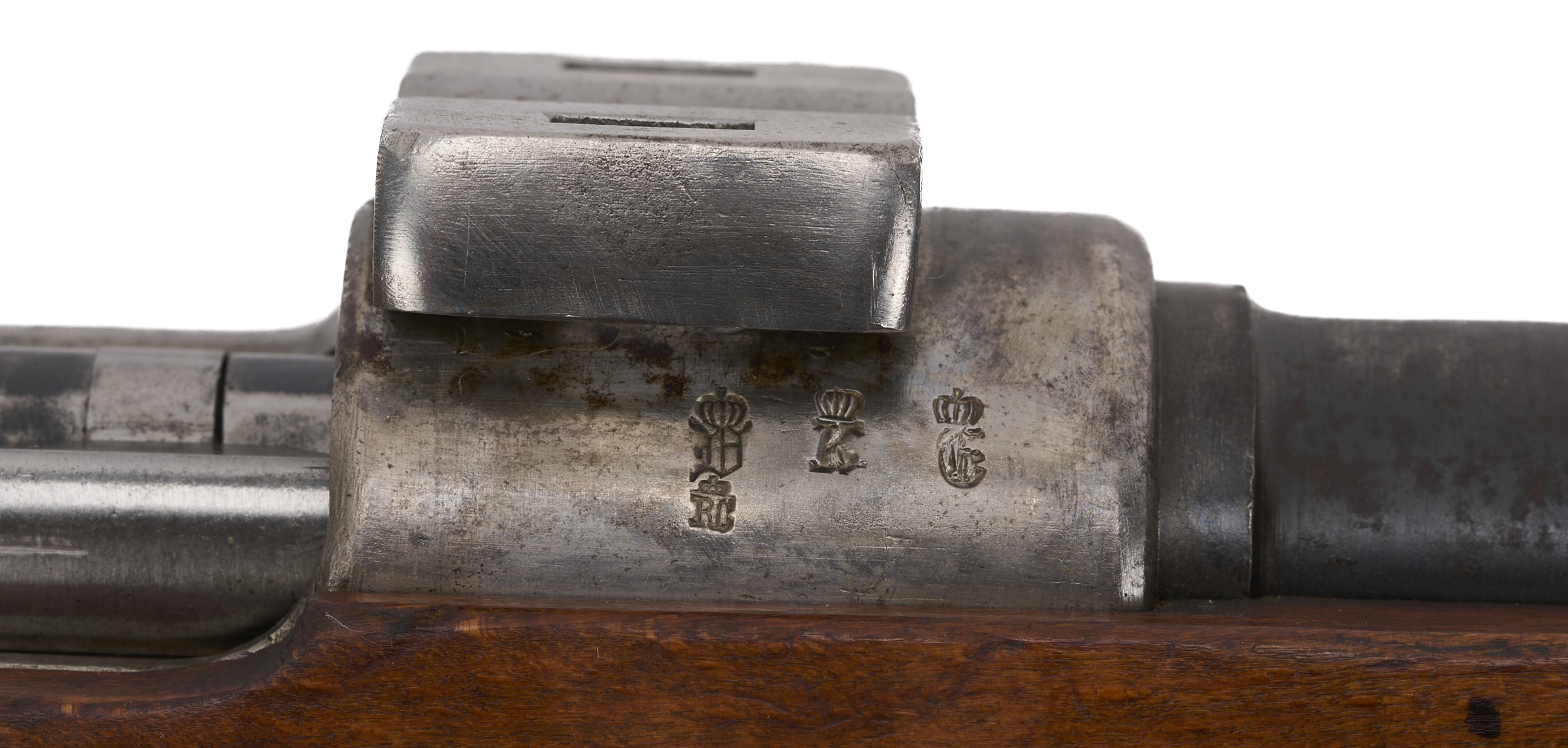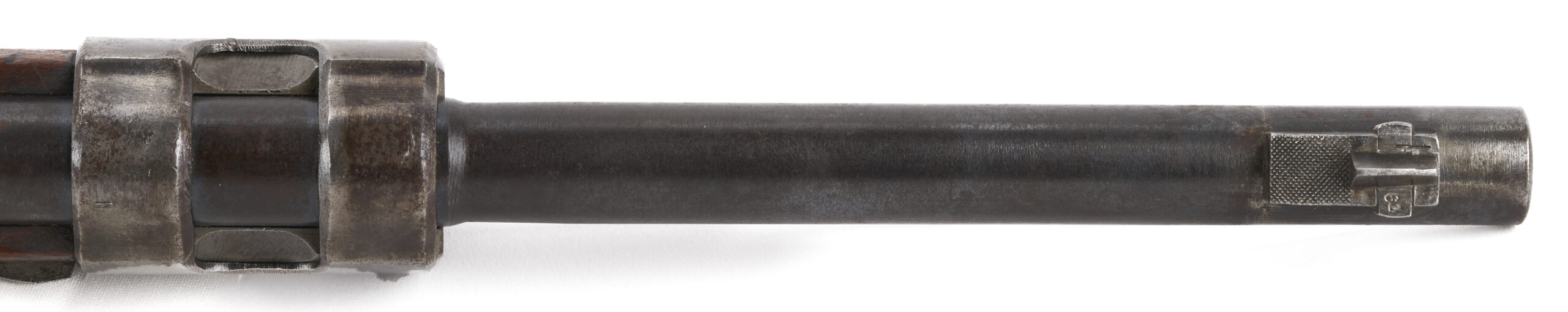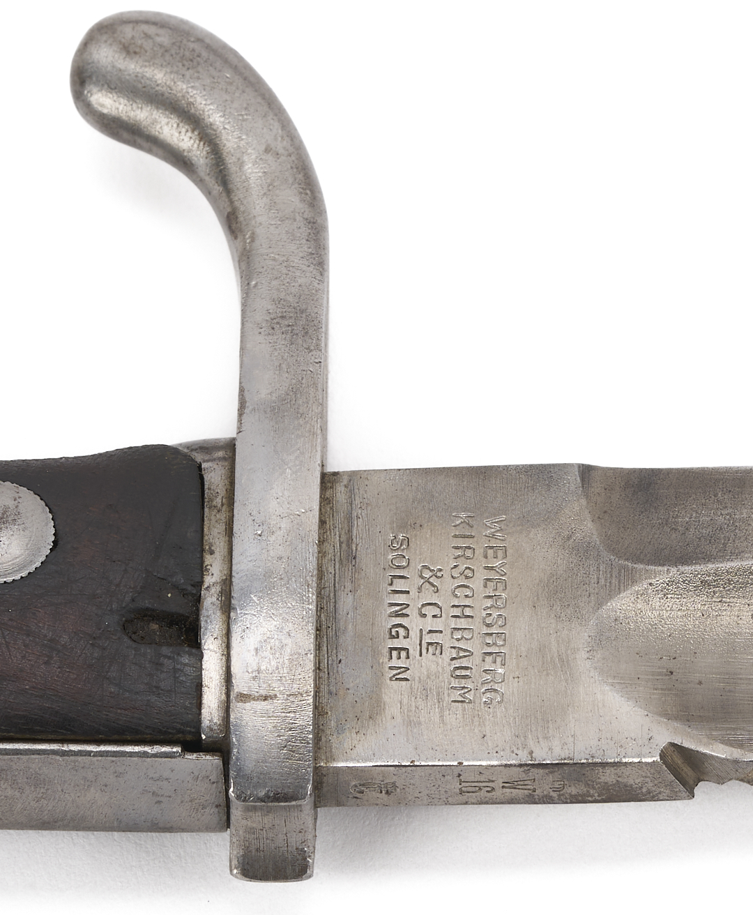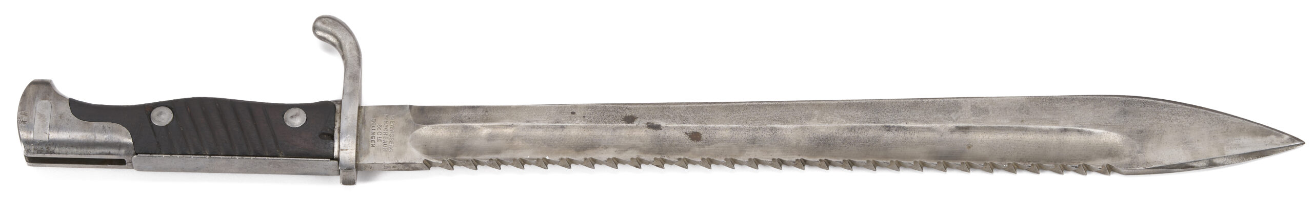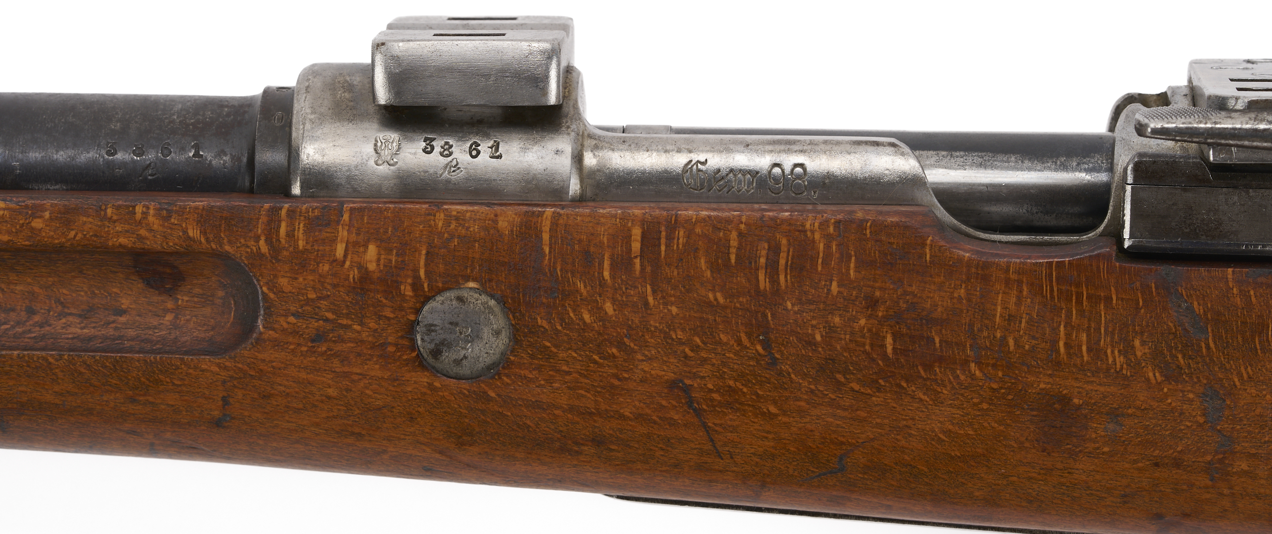 German WWI Gewehr 98 bolt action rifle fitted with scope mounts for sniper configuration; offset to the left to allow use of stripper clips. Left side of receiver marked with serial # 3861 and “Gew. 98.” Top of receiver markings obscured by scope mount, however, it has the standard crown over script letter proofs on the right side of the receiver. Stamped “S” to top of barrel to indicate rechambering for rounded Spitzer bullets. Chambered in 7.92 x 57mm Mauser, with 29 1/4 in. barrel, fixed front sight and “roller coaster” rear sight. Replacement straight bolt handle (not turned down), but with stock trimmed to account for sniper bolt. Matching serial numbers on receiver, barrel, barrel bands, follower, floor plate, trigger guard, trigger guard screws, butt plate, front and rear sights, cleaning rod, and stock; bolt with mismatched serial. The right side of the stock with stamped double Crown Proof. Includes sawtooth “butcher back” bayonet, marked “Weyersberg / KirschBaum / & Cie / Solingen.” Bayonet 19 1/2 in. L; Rifle only overall 49 in. L.