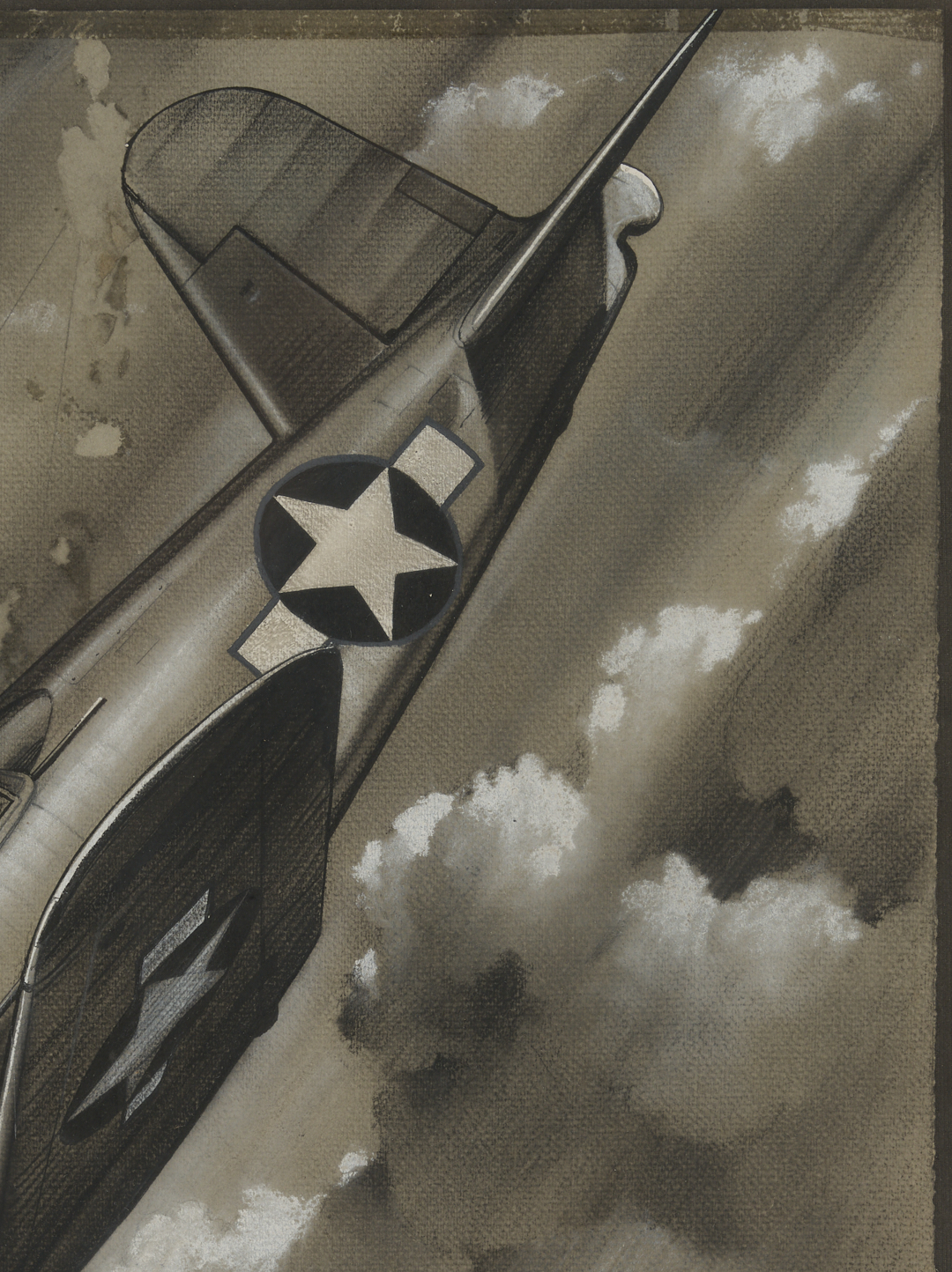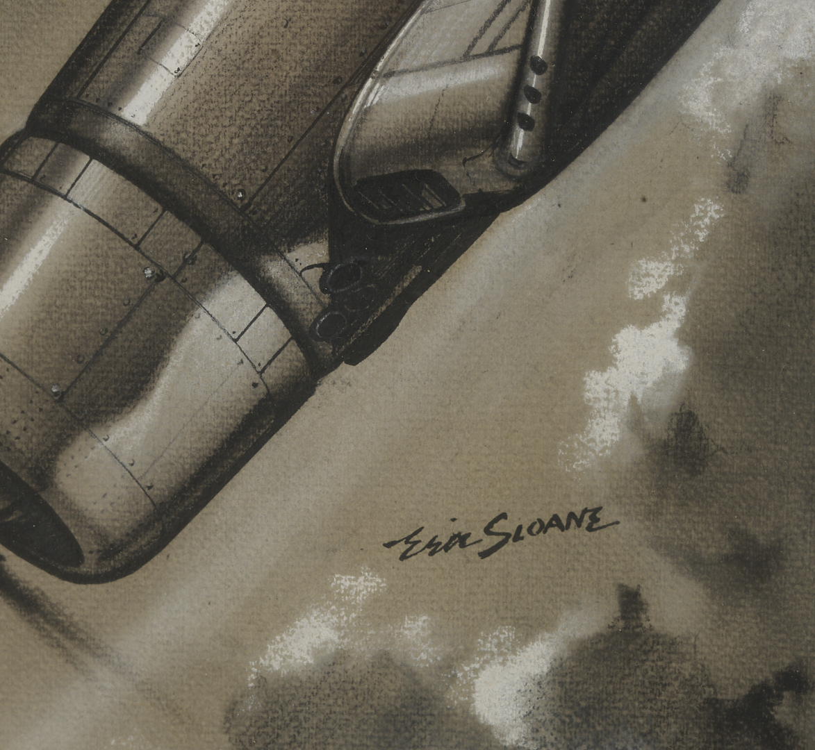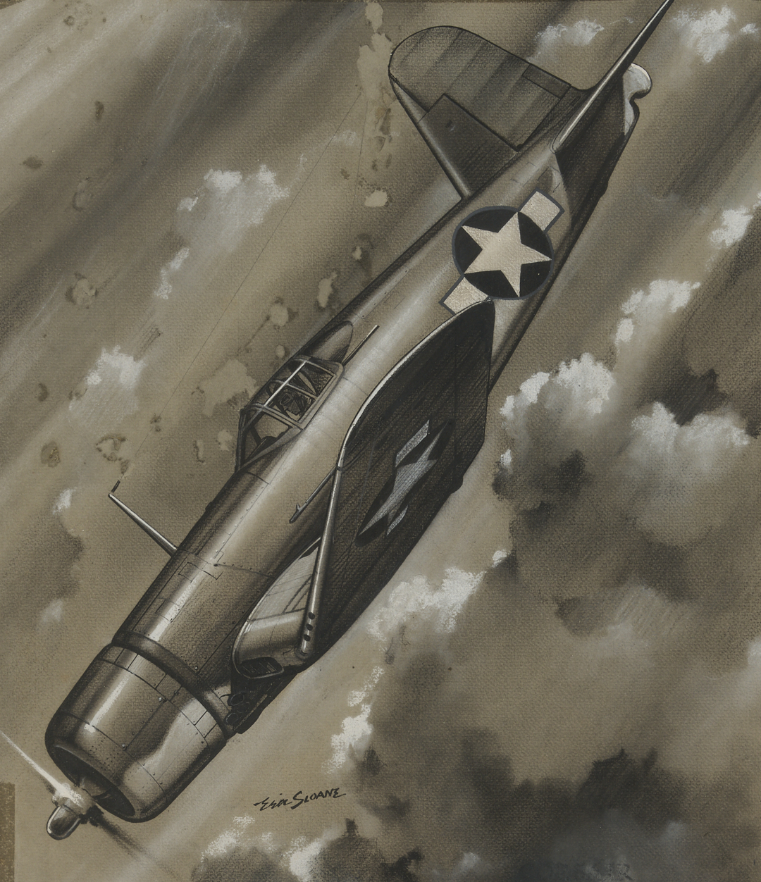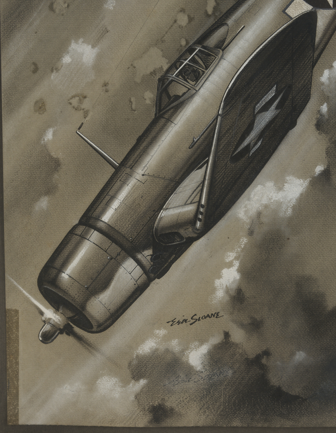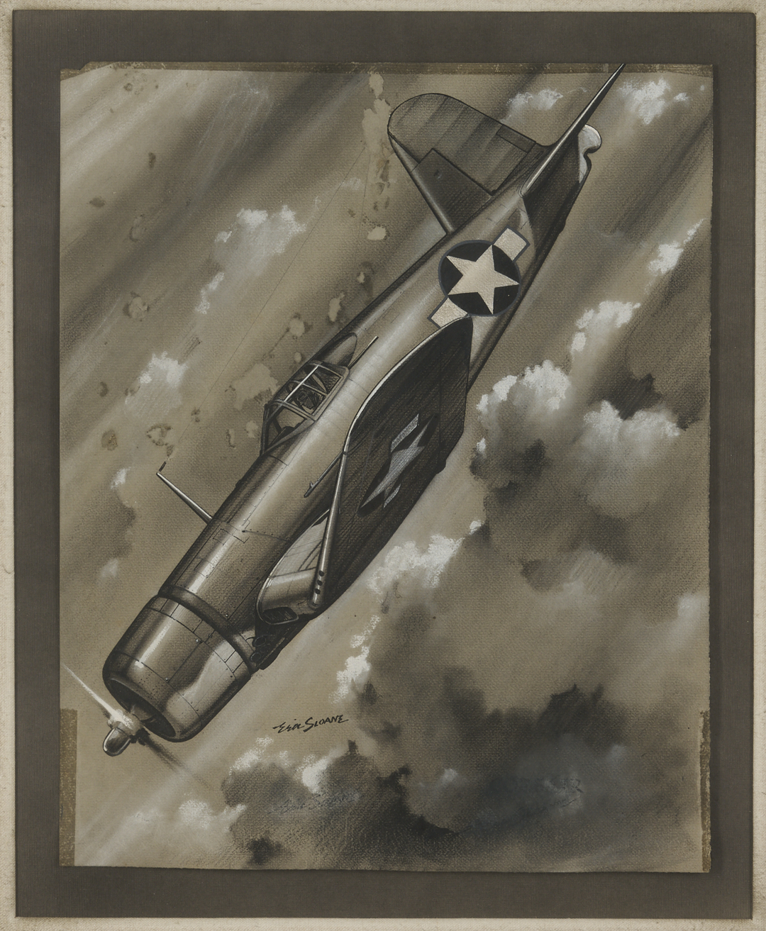 Eric Sloan (New York/Connecticut, 1905-1985) pastel and ink grisaille drawing on wove paper that depicts an F4U Corsair fighter in a dive through cloudy skies. Signed in ink, lower center, with faint (smudged or partially erased) title, “Corsair,” and two additional signatures to lower left and right. With Lyzon Gallery, Nashville, sticker affixed to backing. Floated under acrylic in a silvered wood frame with textile mat and black mount. Sheet: 16 3/4 in. H x 13 1/2 in. W. Framed: 32 13/16 in. H x 27 1/4 in. W.