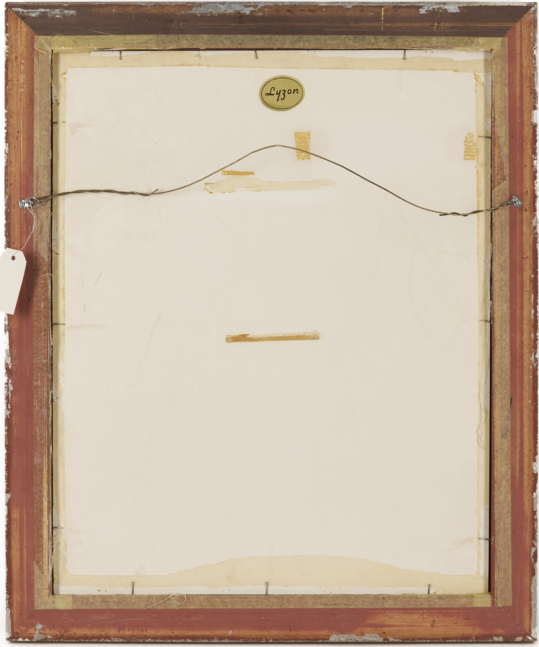 With accretions and areas of related thinning throughout upper and center left, outside of plane. Tape residue along upper edge and to lower left and right edges. Minor loss to upper left corner. Not examined out of frame. With grime or dust to mat.