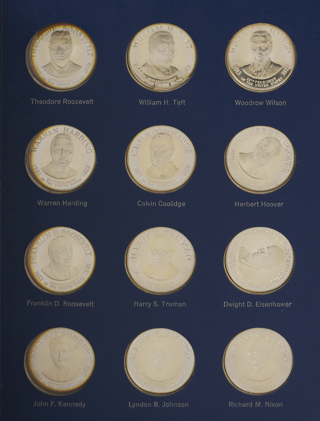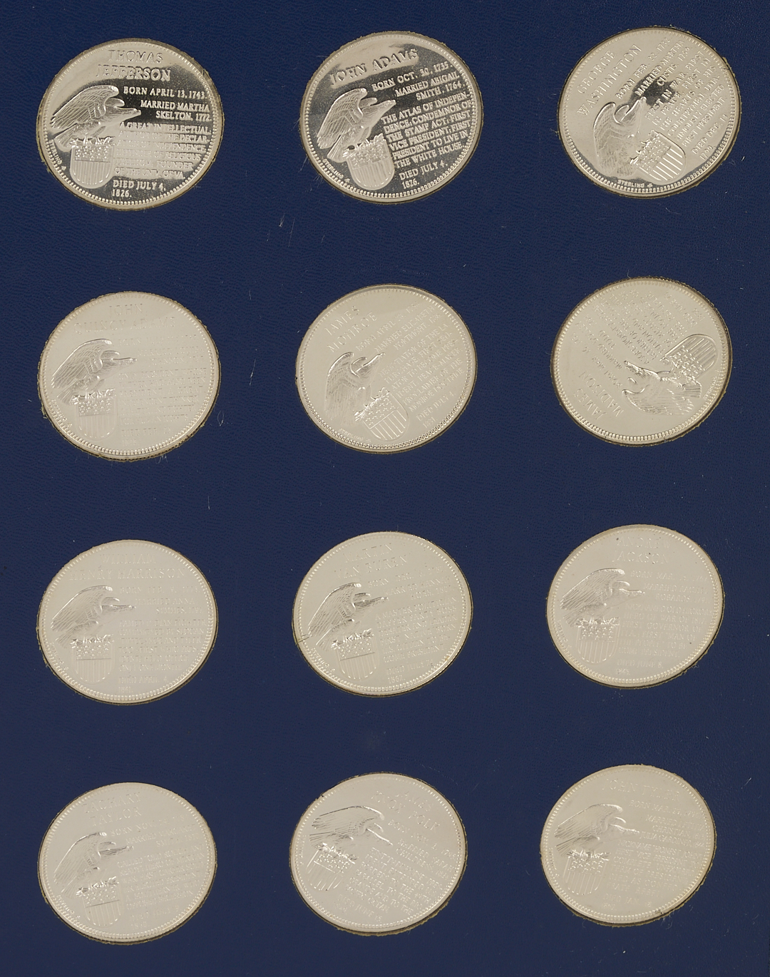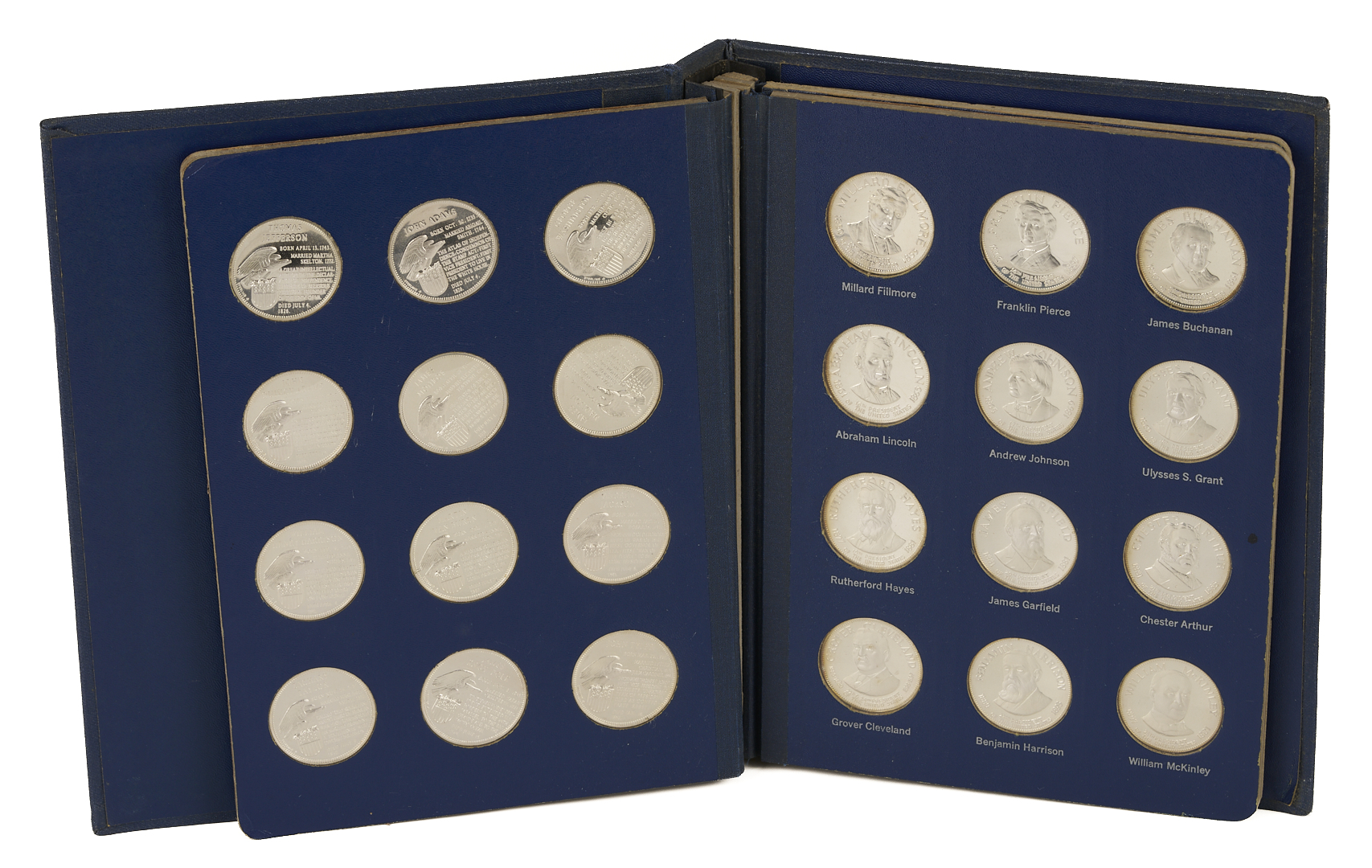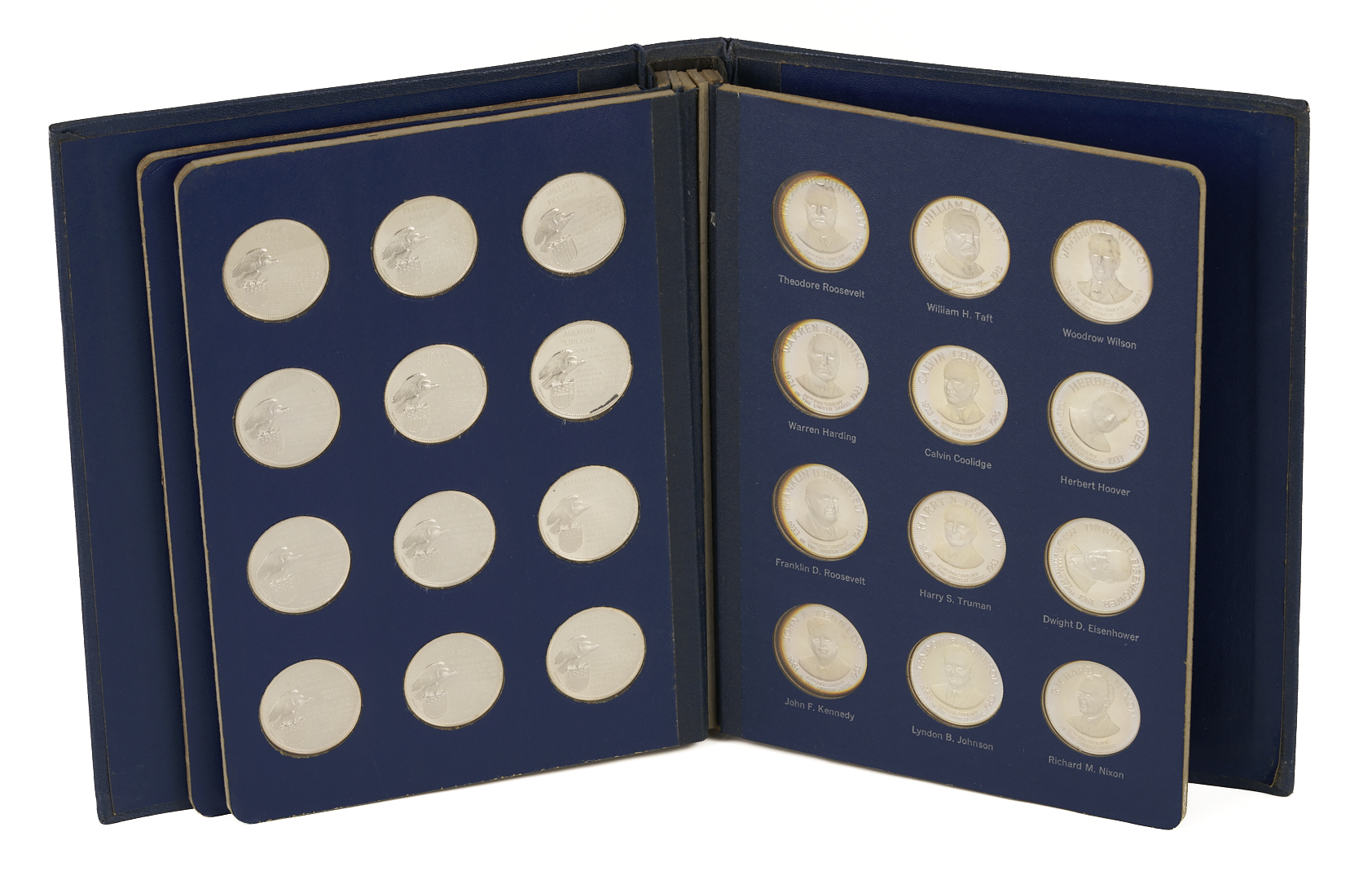 1st item: Thirty-Six (36) sterling silver Franklin Mint Treasury of Presidential Commemorative Medals, American Express Edition. Consisting of medals representing Presidents George Washington, chronologically through Richard Nixon. Housed in the original album and retains the original book. Each medal measures 39mm and weighs approximately 1.0 troy ounces. 36 total troy ounces. Album measures: 10 3/4 in. H x 8 3/4 in. W. 2nd item: Thirty-five (35) sterling silver Franklin Mint Treasury of Presidential Commemorative Medals. Consisting of medals representing Presidents George Washington, chronologically through Lyndon Johnson. Housed in a fitted blue display book. Each medal measures 26mm and weighs .24 troy ounces. 8.4 total troy ounces. Combined: 44.4 total troy ounces.