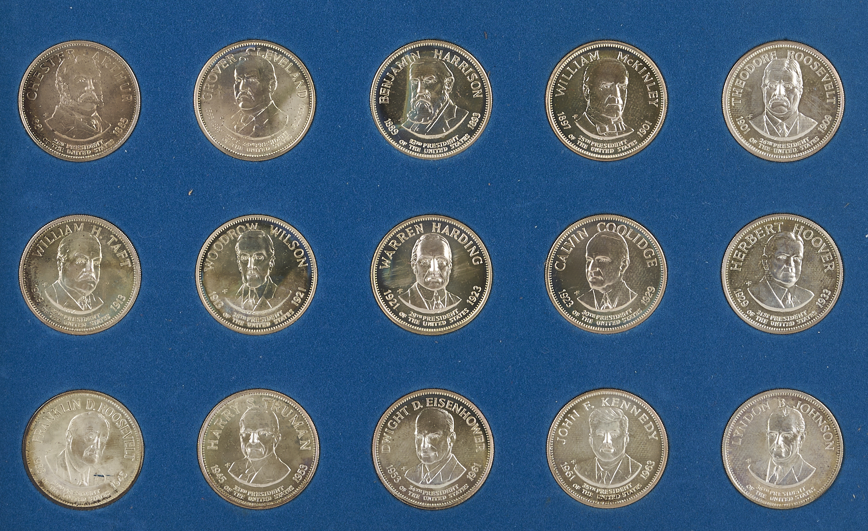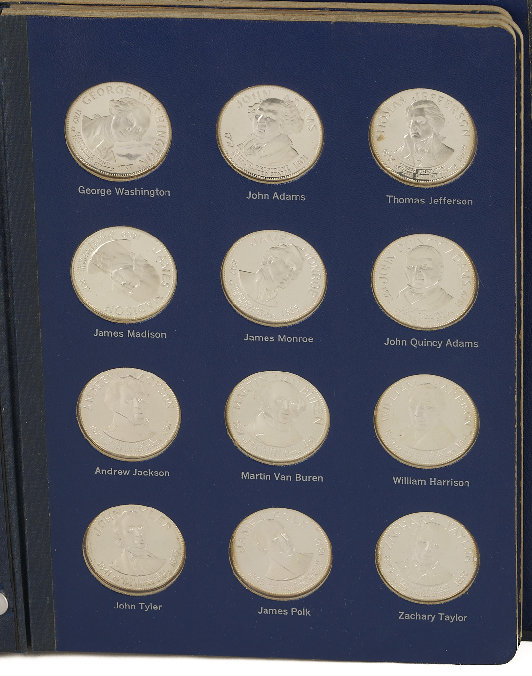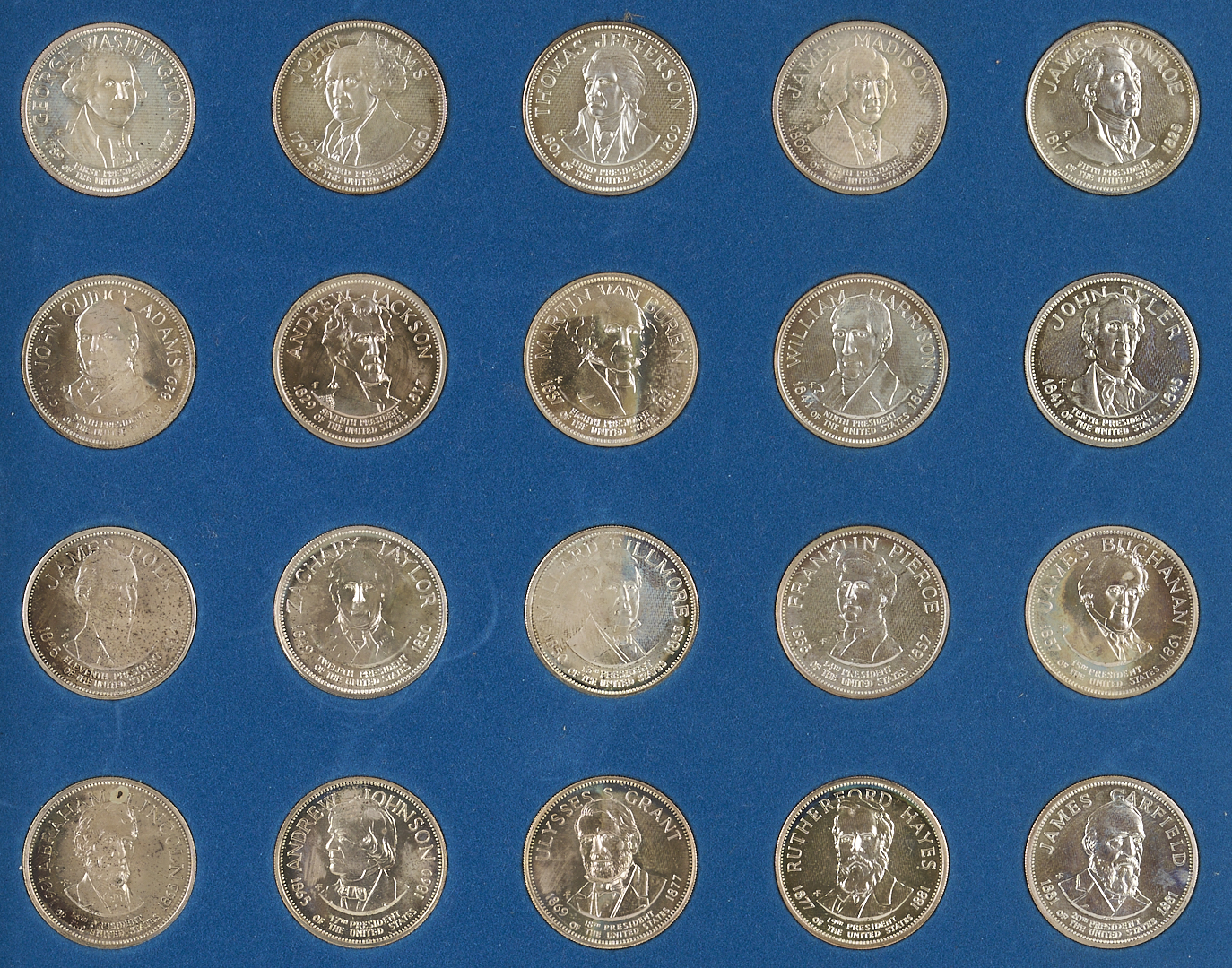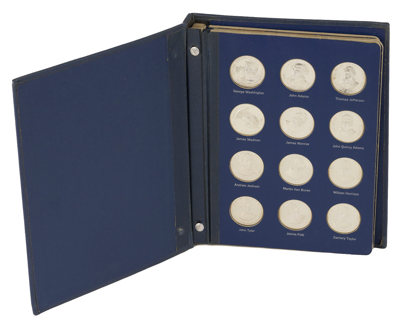 1st item: Thirty-Six (36) sterling silver Franklin Mint Treasury of Presidential Commemorative Medals, American Express Edition. Consisting of medals representing Presidents George Washington, chronologically through Richard Nixon. Housed in the original album and retains the original book. Each medal measures 39mm and weighs approximately 1.0 troy ounces. 36 total troy ounces. Album measures: 10 3/4 in. H x 8 3/4 in. W. 2nd item: Thirty-five (35) sterling silver Franklin Mint Treasury of Presidential Commemorative Medals. Consisting of medals representing Presidents George Washington, chronologically through Lyndon Johnson. Housed in a fitted blue display book. Each medal measures 26mm and weighs .24 troy ounces. 8.4 total troy ounces. Combined: 44.4 total troy ounces.
