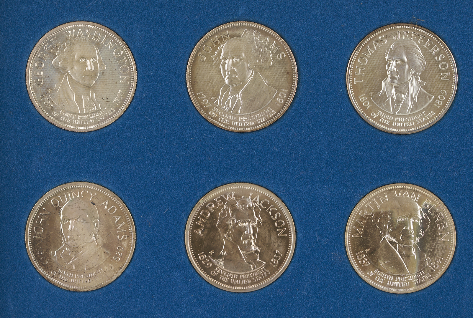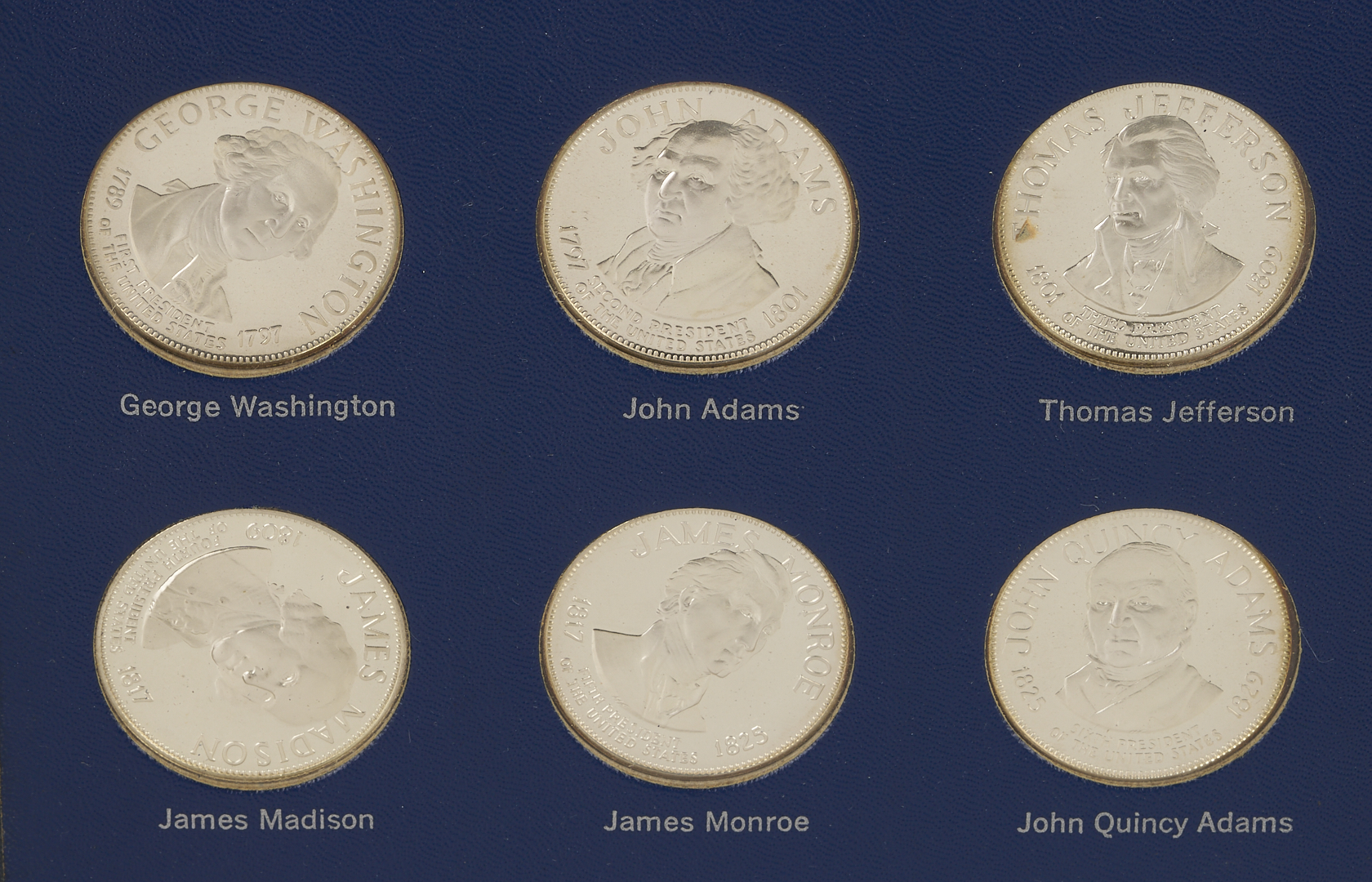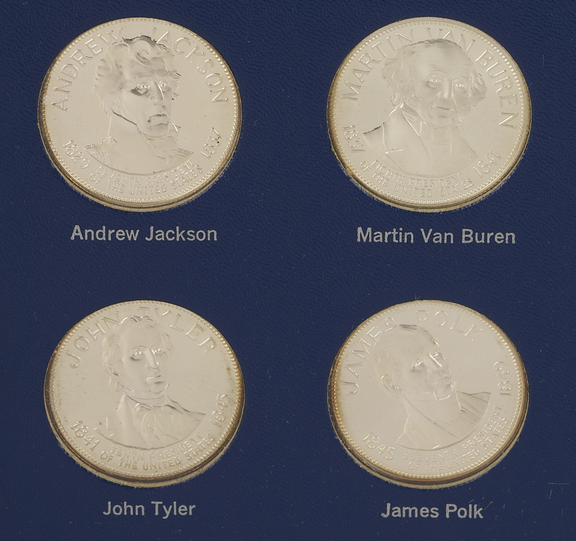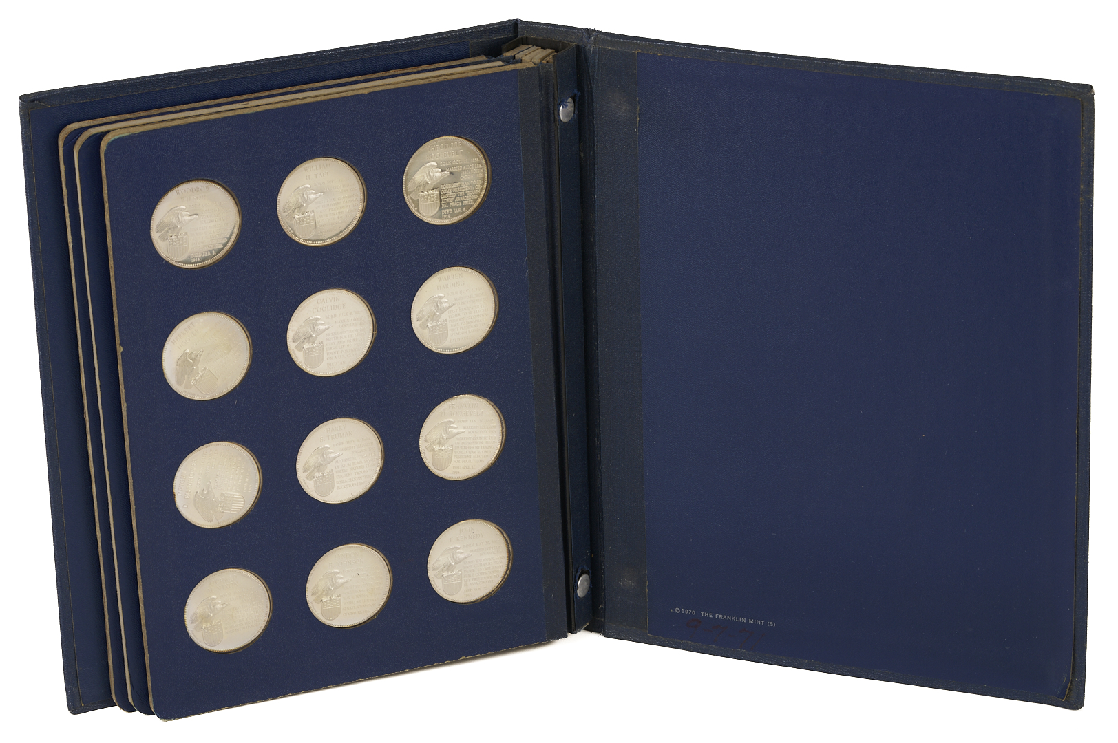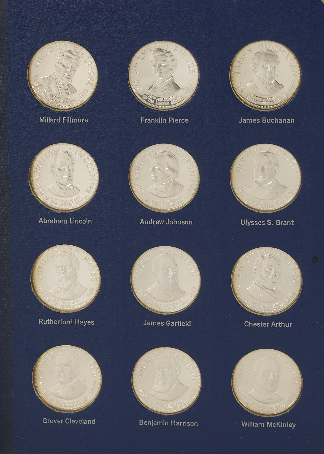 1st item: Thirty-Six (36) sterling silver Franklin Mint Treasury of Presidential Commemorative Medals, American Express Edition. Consisting of medals representing Presidents George Washington, chronologically through Richard Nixon. Housed in the original album and retains the original book. Each medal measures 39mm and weighs approximately 1.0 troy ounces. 36 total troy ounces. Album measures: 10 3/4 in. H x 8 3/4 in. W. 2nd item: Thirty-five (35) sterling silver Franklin Mint Treasury of Presidential Commemorative Medals. Consisting of medals representing Presidents George Washington, chronologically through Lyndon Johnson. Housed in a fitted blue display book. Each medal measures 26mm and weighs .24 troy ounces. 8.4 total troy ounces. Combined: 44.4 total troy ounces.