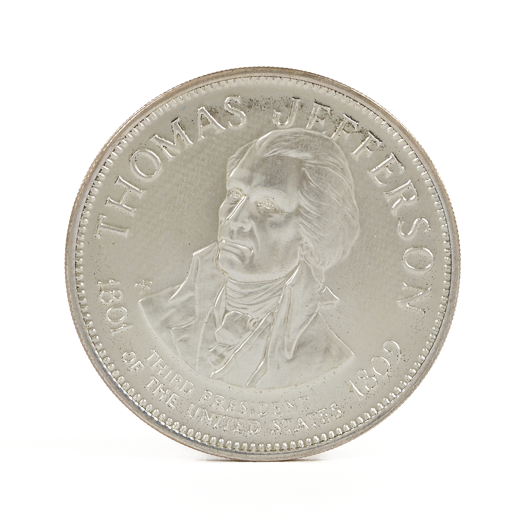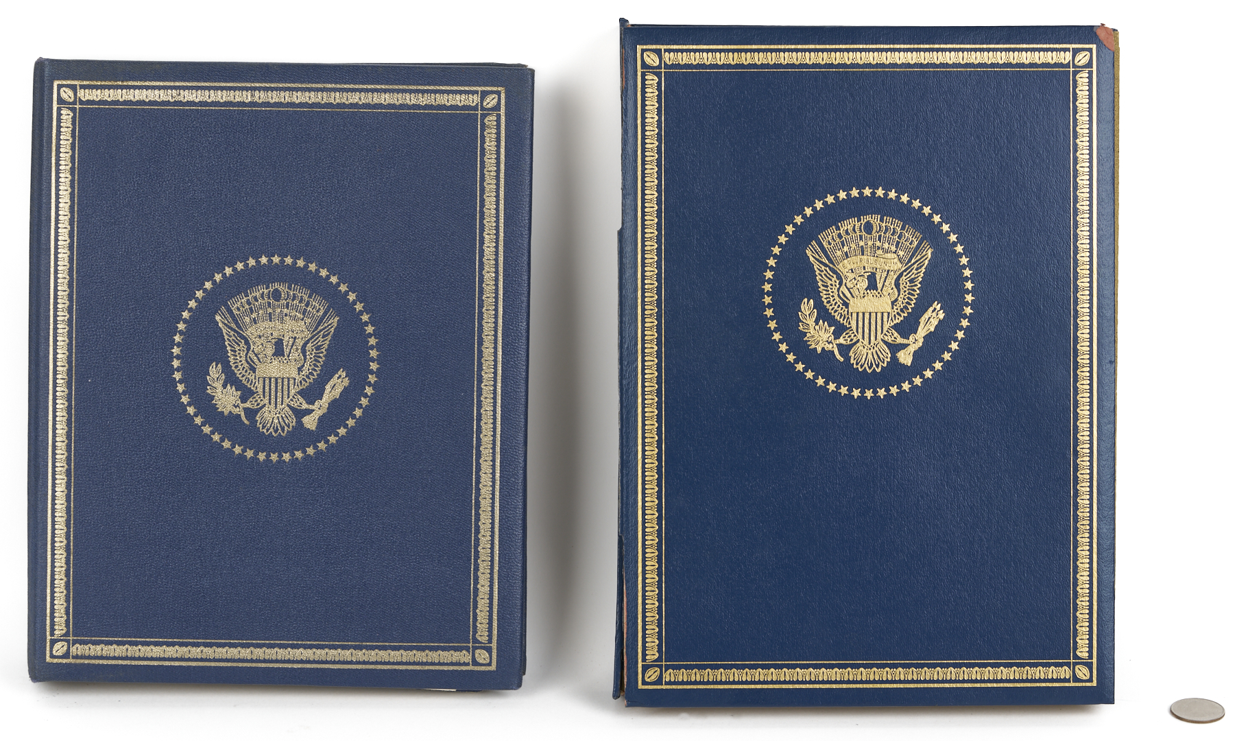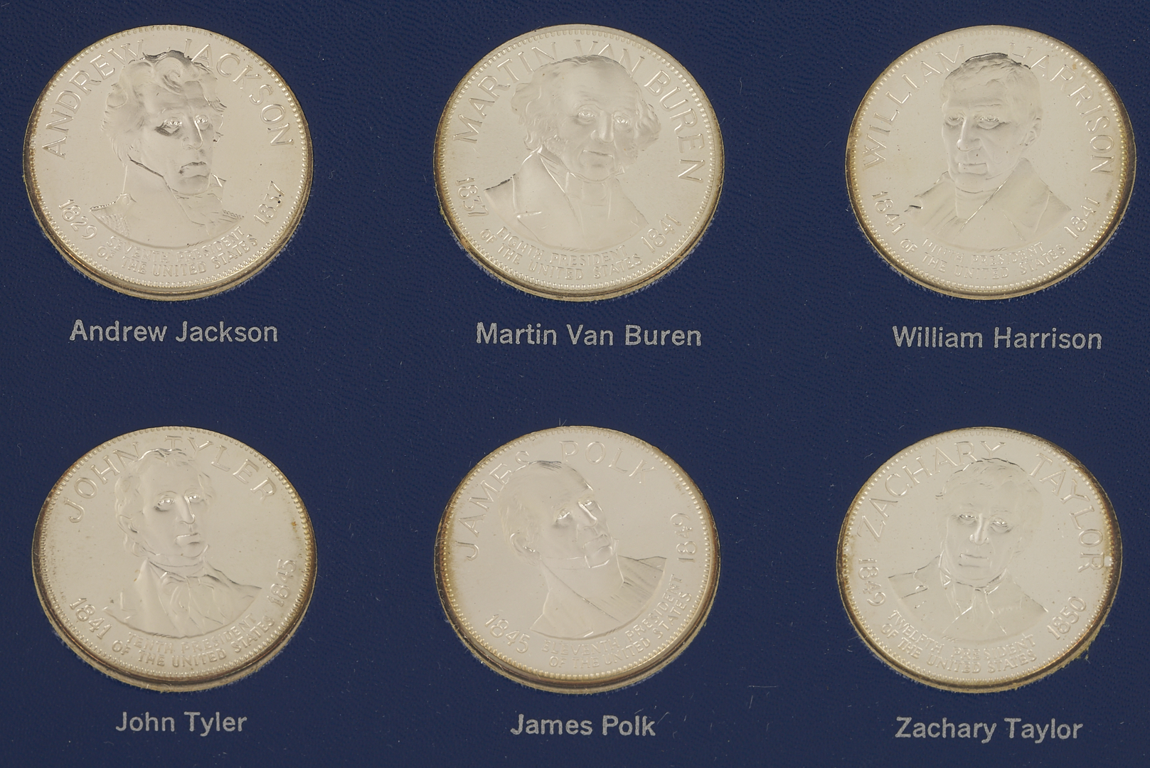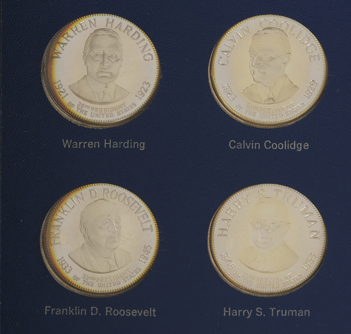 1st item: Thirty-Six (36) sterling silver Franklin Mint Treasury of Presidential Commemorative Medals, American Express Edition. Consisting of medals representing Presidents George Washington, chronologically through Richard Nixon. Housed in the original album and retains the original book. Each medal measures 39mm and weighs approximately 1.0 troy ounces. 36 total troy ounces. Album measures: 10 3/4 in. H x 8 3/4 in. W. 2nd item: Thirty-five (35) sterling silver Franklin Mint Treasury of Presidential Commemorative Medals. Consisting of medals representing Presidents George Washington, chronologically through Lyndon Johnson. Housed in a fitted blue display book. Each medal measures 26mm and weighs .24 troy ounces. 8.4 total troy ounces. Combined: 44.4 total troy ounces.