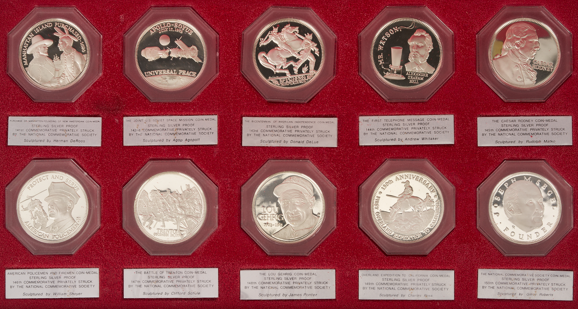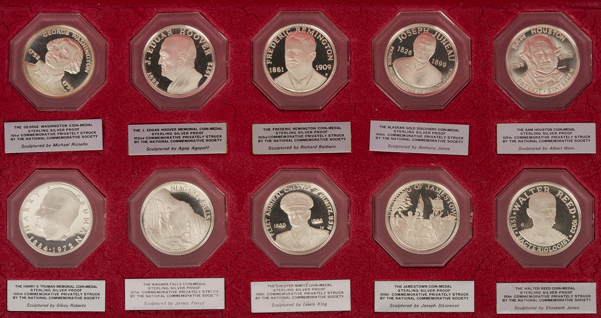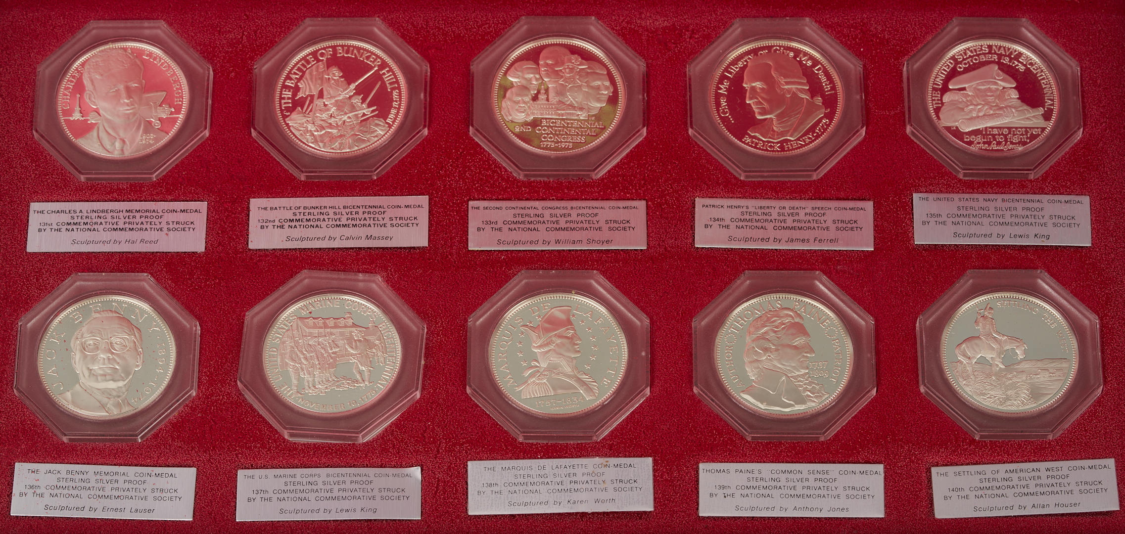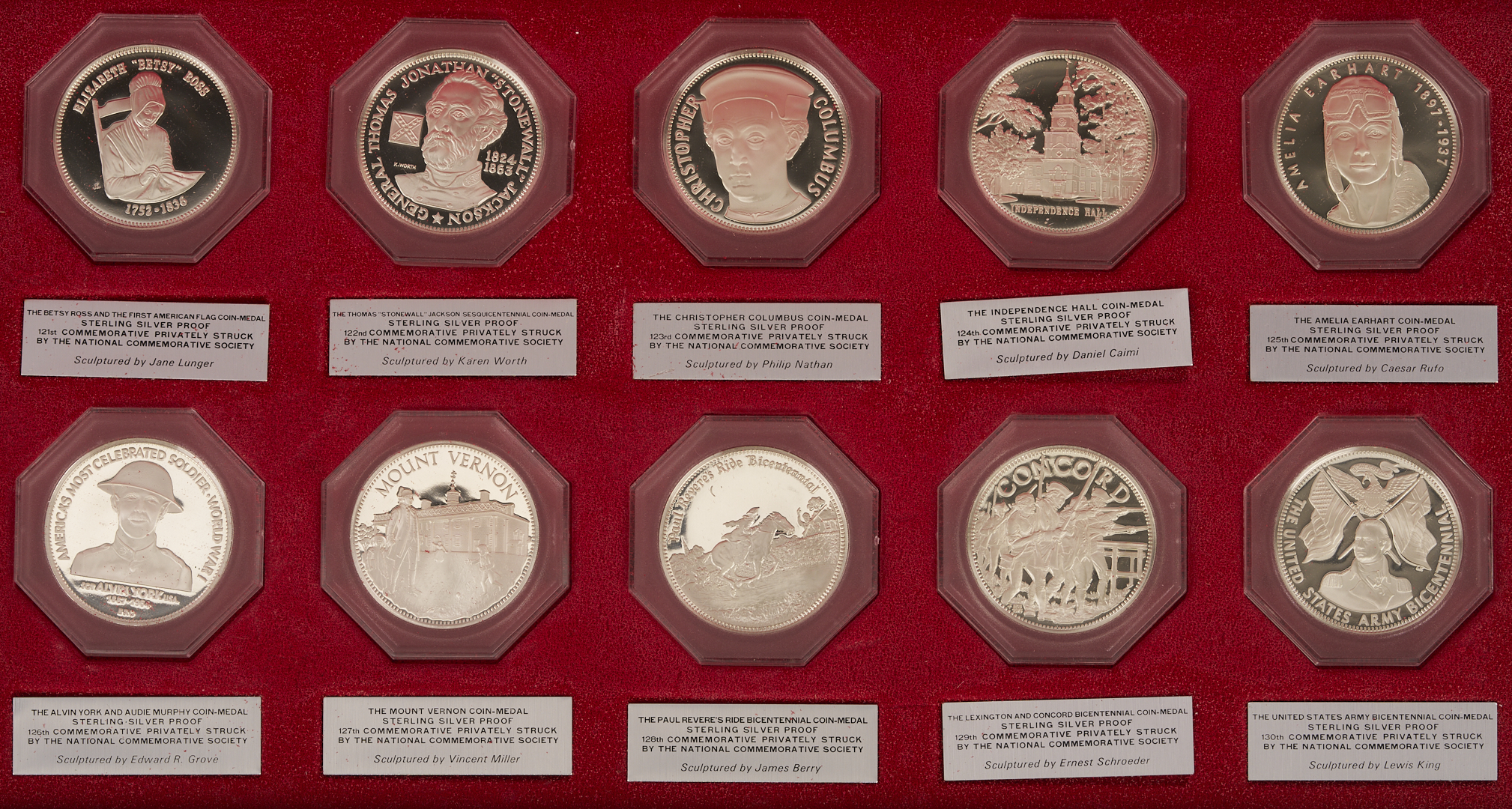 Eighty (80) National Commemorative Society Series III Medals, designed and minted by the Franklin Mint. Each sterling silver proof medal depicts a significant person, location, or event in the history of the United States. Examples include George Washington, Charles Lindbergh, Betsy Ross, Niagara Falls, Jamestown, Paul Revere’s ride, and more. Eight fitted cases total, each containing 10 medals, including 1-30th proofs, 71 – 100th proofs, and two cases without the proof identification. Each medallion measures 39mm and weighs approximately .86 troy ounces. 68.8 total troy ounces. Fitted cases measure 1 1/2 in. H x 14 1/4 in. W x 7 1/2 in. D. Together with a .999 1 troy ounce silver 75th Anniversary ingot from the Coca-Cola Bottling Company of Nashville.