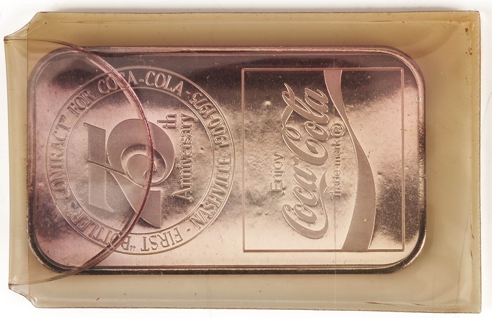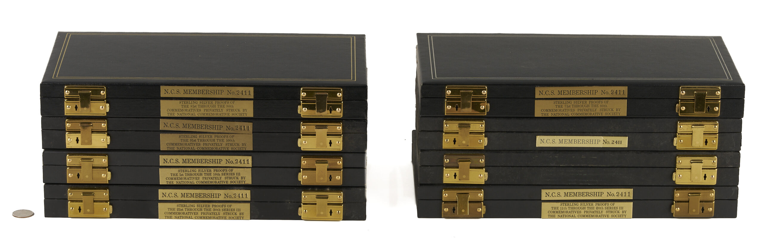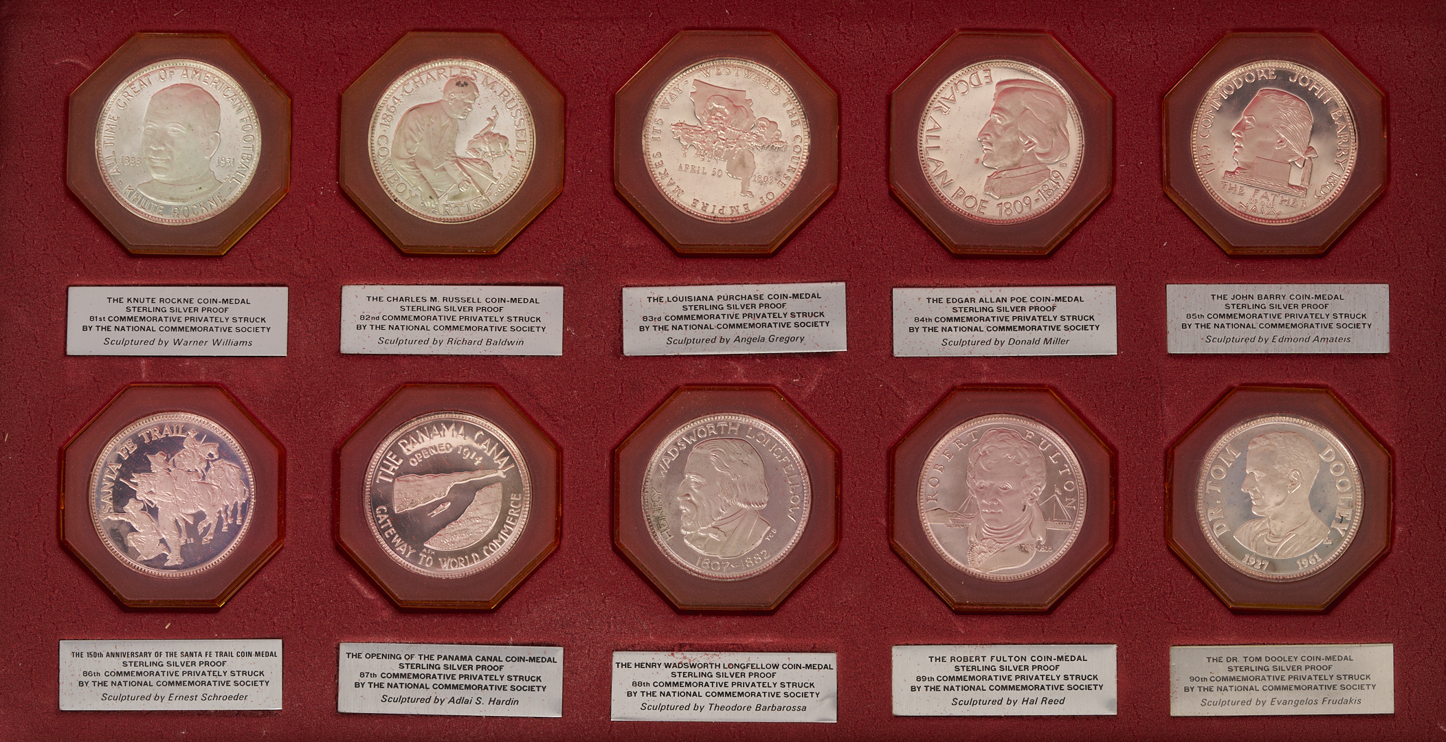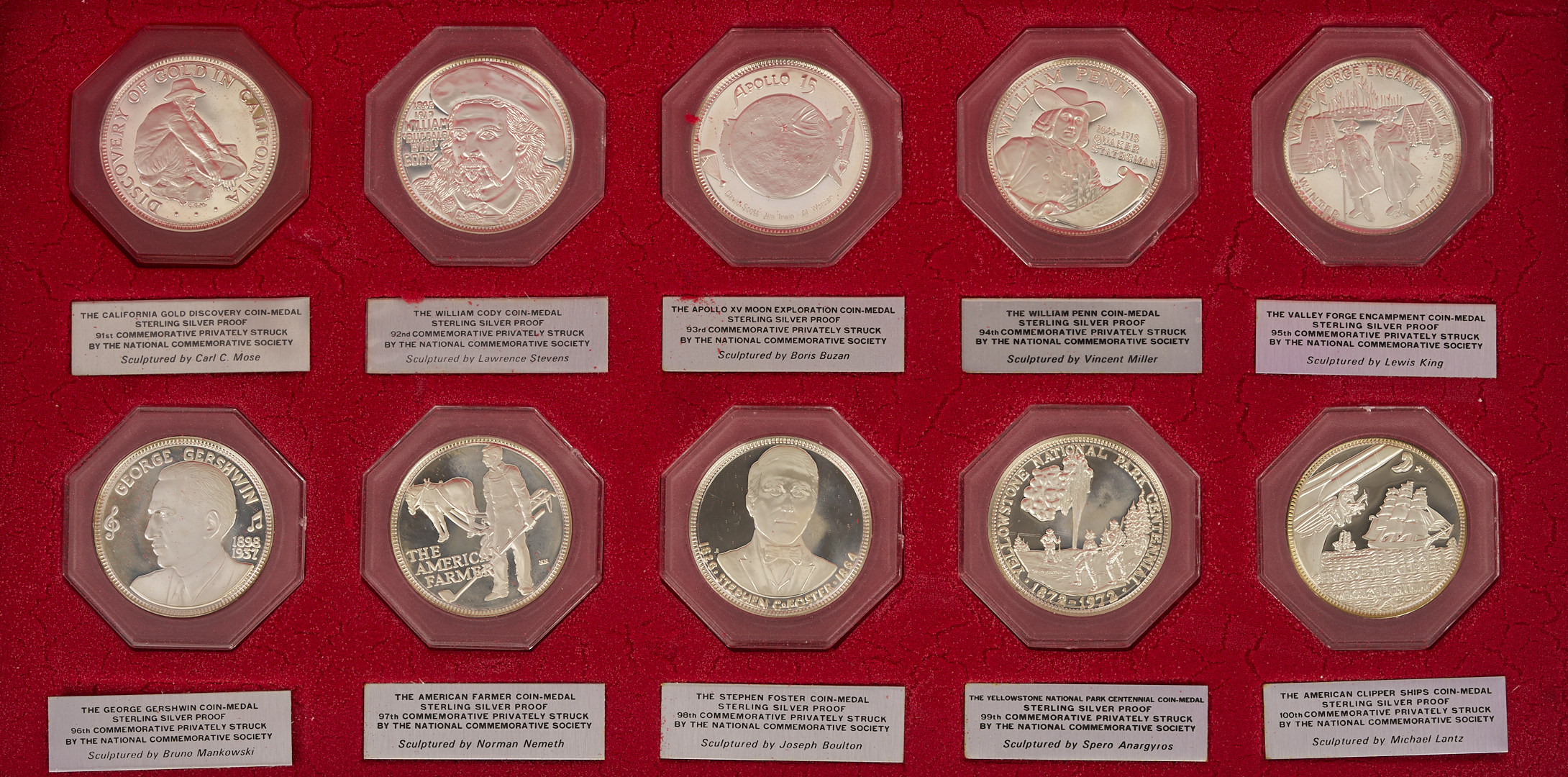 Eighty (80) National Commemorative Society Series III Medals, designed and minted by the Franklin Mint. Each sterling silver proof medal depicts a significant person, location, or event in the history of the United States. Examples include George Washington, Charles Lindbergh, Betsy Ross, Niagara Falls, Jamestown, Paul Revere’s ride, and more. Eight fitted cases total, each containing 10 medals, including 1-30th proofs, 71 – 100th proofs, and two cases without the proof identification. Each medallion measures 39mm and weighs approximately .86 troy ounces. 68.8 total troy ounces. Fitted cases measure 1 1/2 in. H x 14 1/4 in. W x 7 1/2 in. D. Together with a .999 1 troy ounce silver 75th Anniversary ingot from the Coca-Cola Bottling Company of Nashville.
