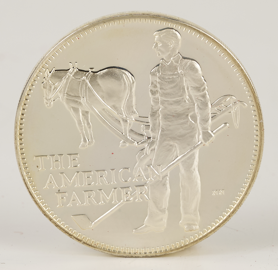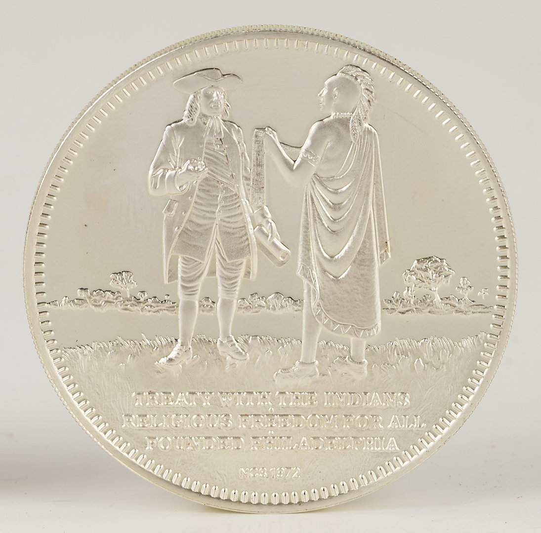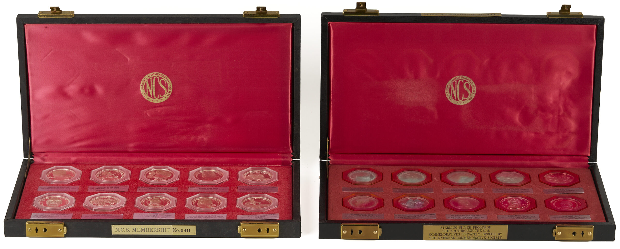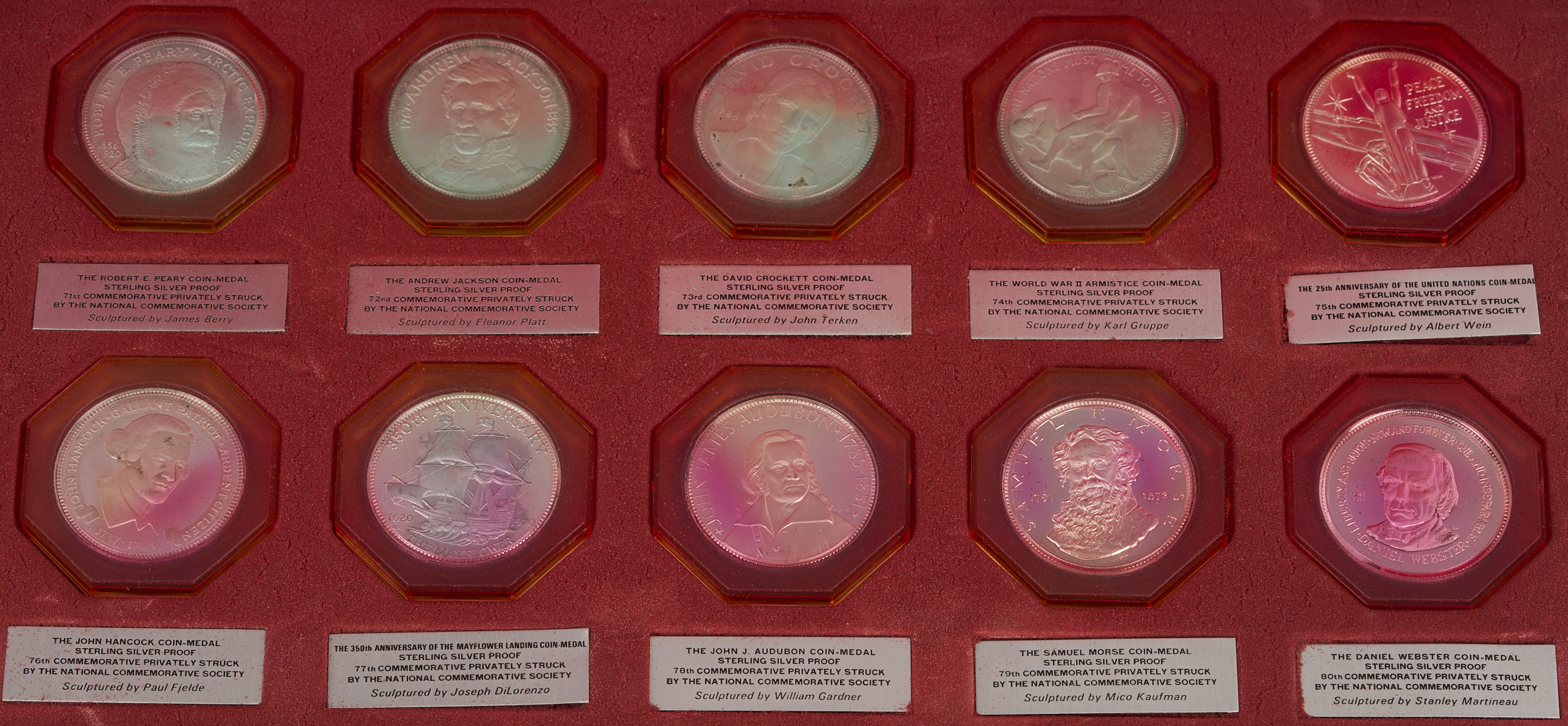 Eighty (80) National Commemorative Society Series III Medals, designed and minted by the Franklin Mint. Each sterling silver proof medal depicts a significant person, location, or event in the history of the United States. Examples include George Washington, Charles Lindbergh, Betsy Ross, Niagara Falls, Jamestown, Paul Revere’s ride, and more. Eight fitted cases total, each containing 10 medals, including 1-30th proofs, 71 – 100th proofs, and two cases without the proof identification. Each medallion measures 39mm and weighs approximately .86 troy ounces. 68.8 total troy ounces. Fitted cases measure 1 1/2 in. H x 14 1/4 in. W x 7 1/2 in. D. Together with a .999 1 troy ounce silver 75th Anniversary ingot from the Coca-Cola Bottling Company of Nashville.