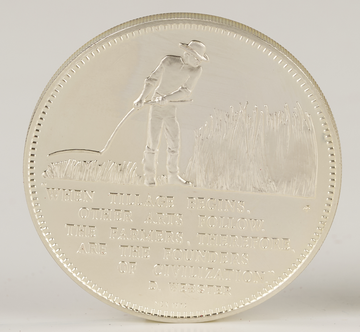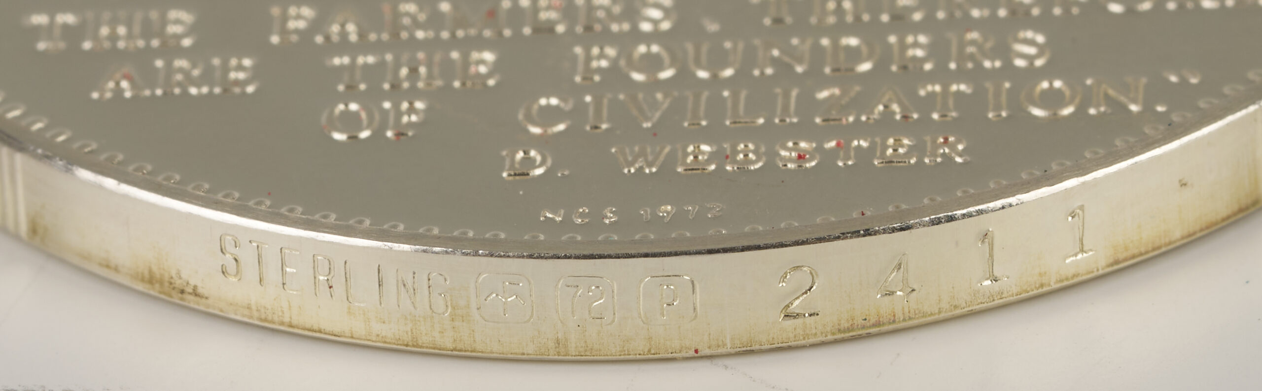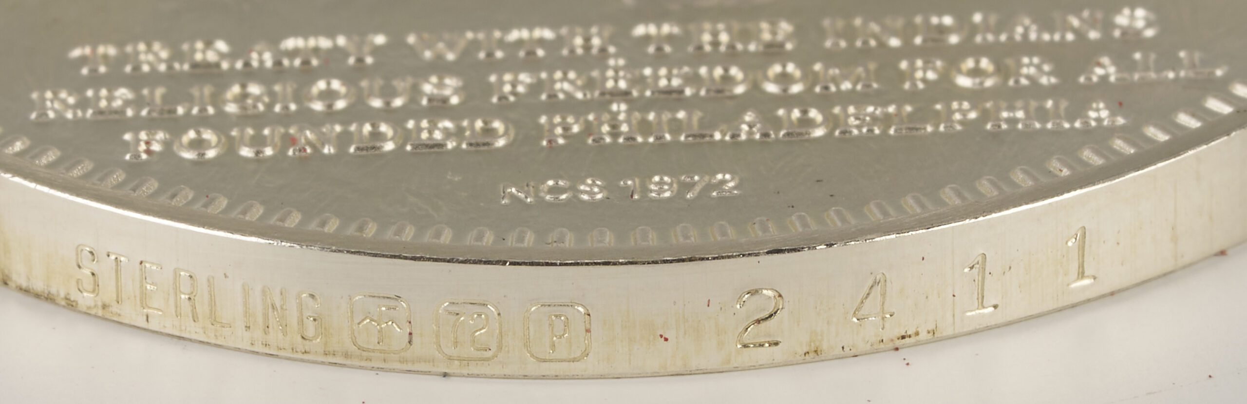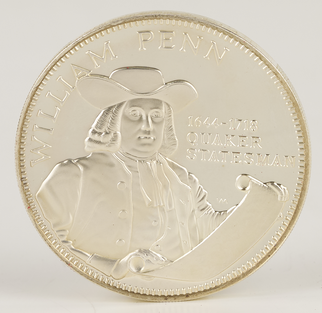 Eighty (80) National Commemorative Society Series III Medals, designed and minted by the Franklin Mint. Each sterling silver proof medal depicts a significant person, location, or event in the history of the United States. Examples include George Washington, Charles Lindbergh, Betsy Ross, Niagara Falls, Jamestown, Paul Revere’s ride, and more. Eight fitted cases total, each containing 10 medals, including 1-30th proofs, 71 – 100th proofs, and two cases without the proof identification. Each medallion measures 39mm and weighs approximately .86 troy ounces. 68.8 total troy ounces. Fitted cases measure 1 1/2 in. H x 14 1/4 in. W x 7 1/2 in. D. Together with a .999 1 troy ounce silver 75th Anniversary ingot from the Coca-Cola Bottling Company of Nashville.