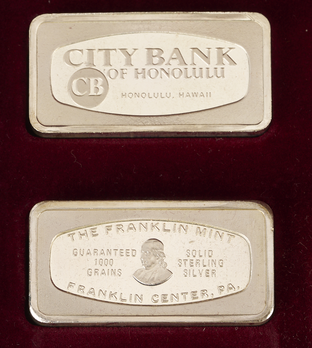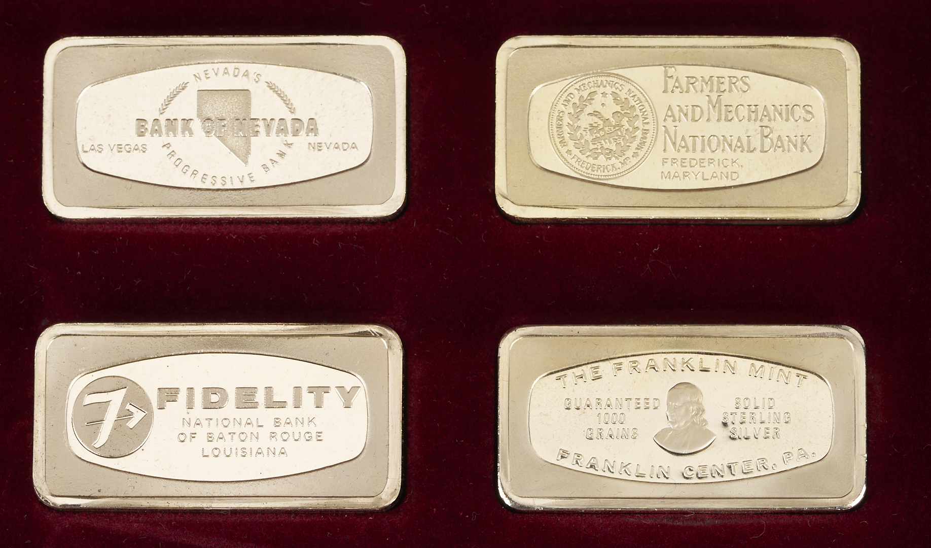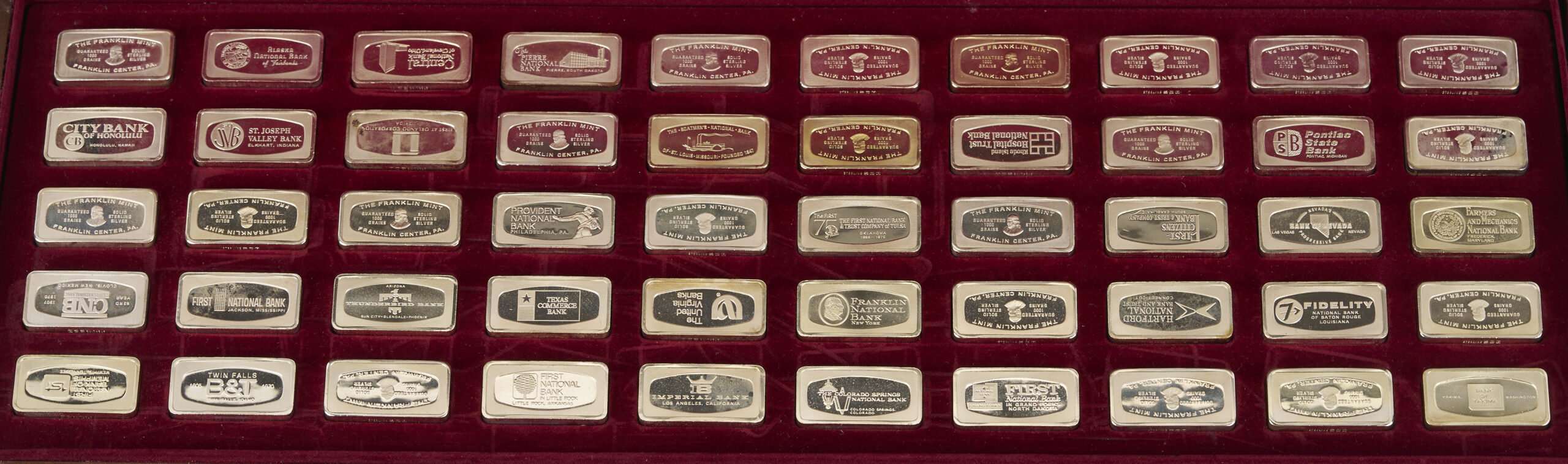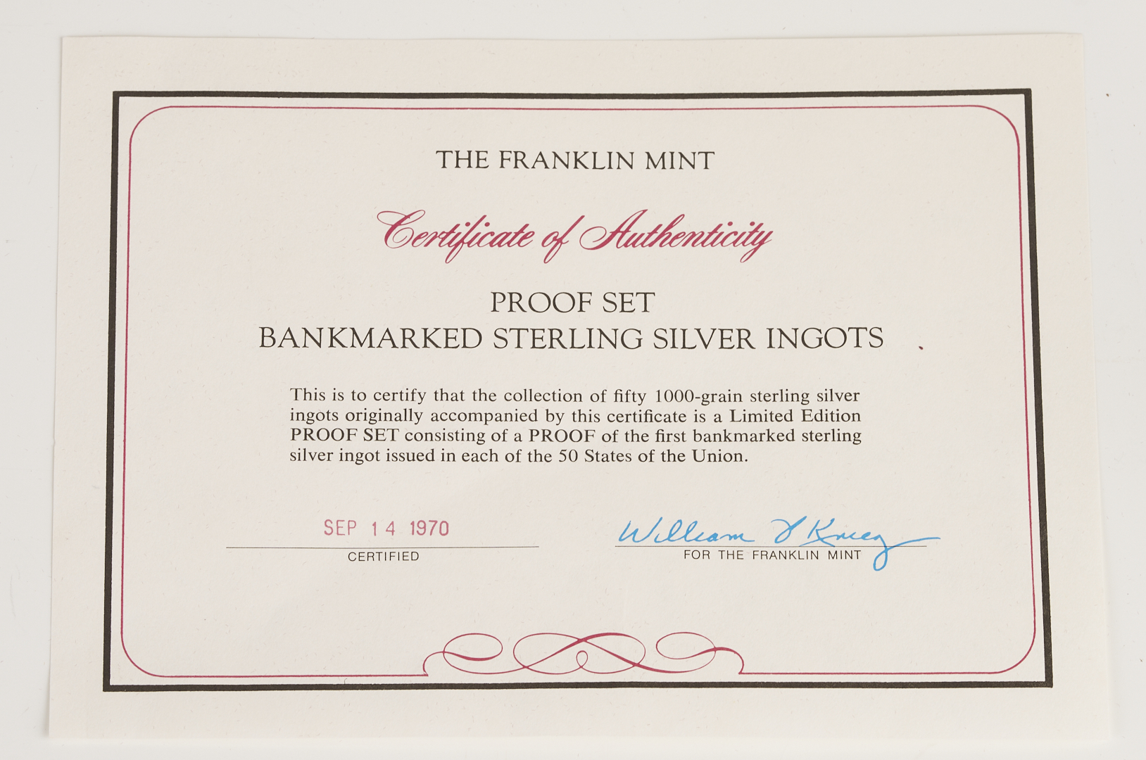 Limited Edition Franklin Mint sterling silver ingot set, consisting of 1000-grain (64.8 gram) ingots representing proofs of the first bankmarked sterling silver ingots issued in each of the 50 states of the Union. In the original presentation box with the Certificate of Authenticity, dated September 14, 1970. Ingots measure 7/8 in. x 1 3/4 in. and weigh 2.12 troy ounces. Box measures: 3 in. H x 24 1/4 in. W x 9 1/4 in. D. 106 total troy ounces.