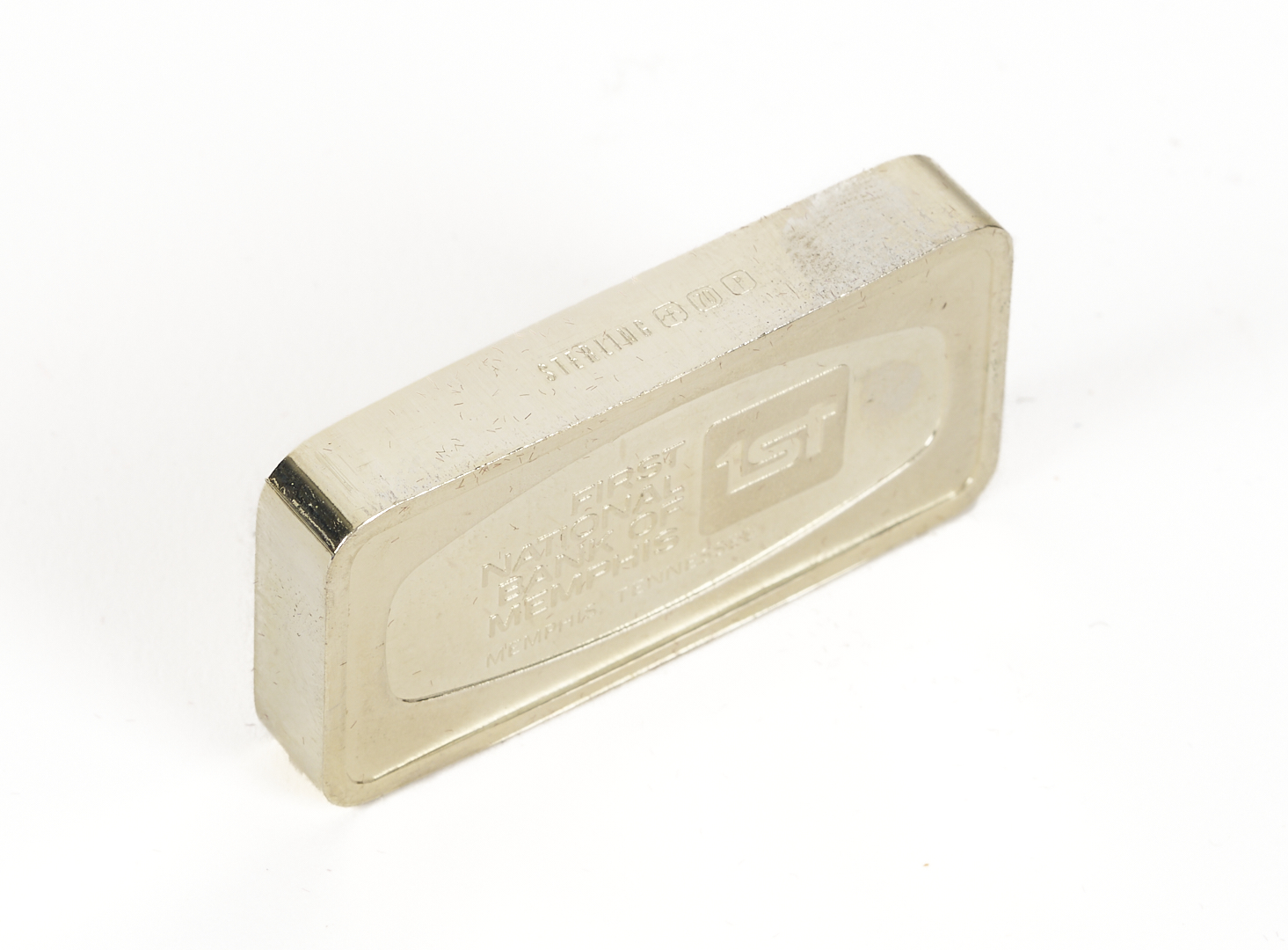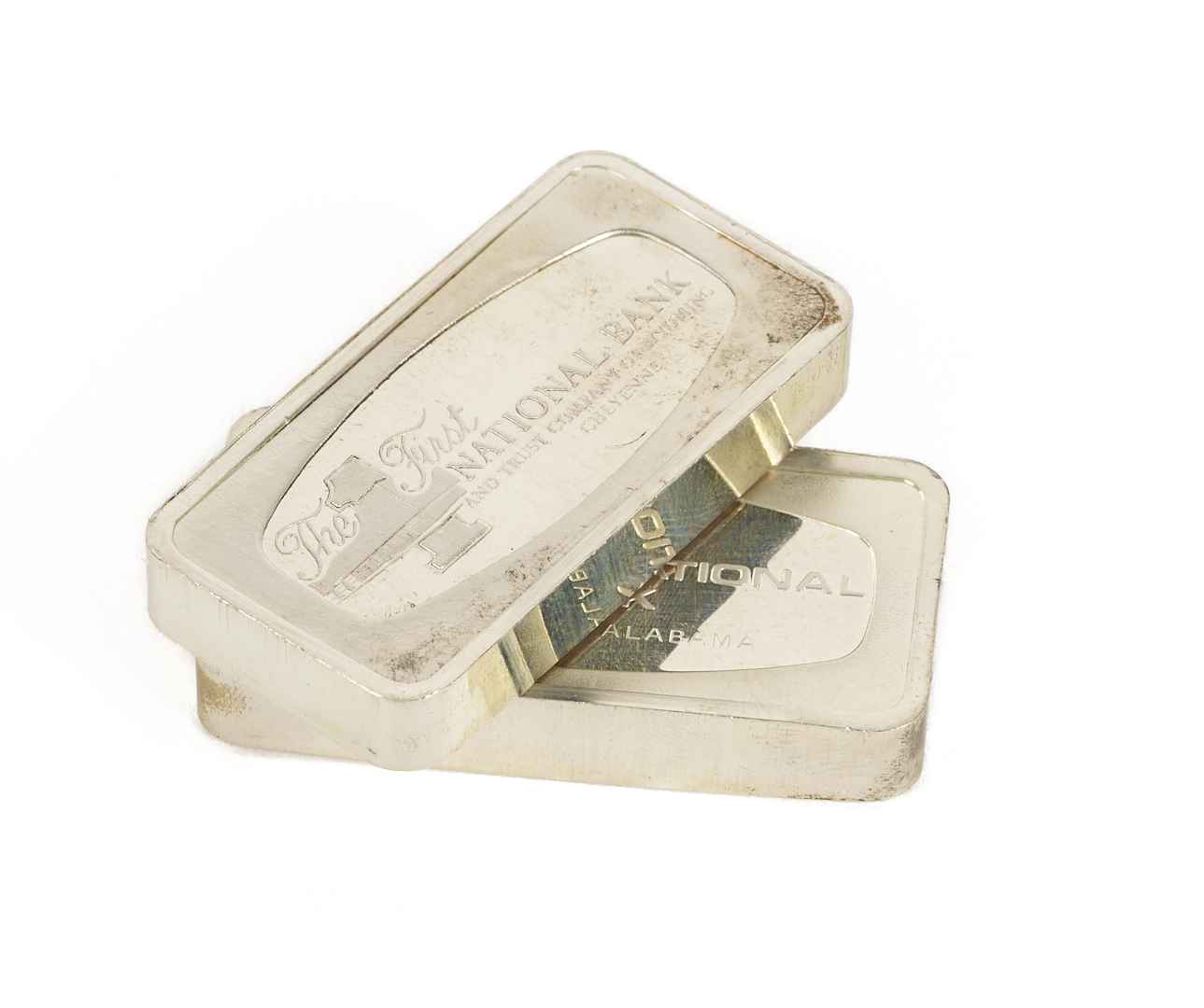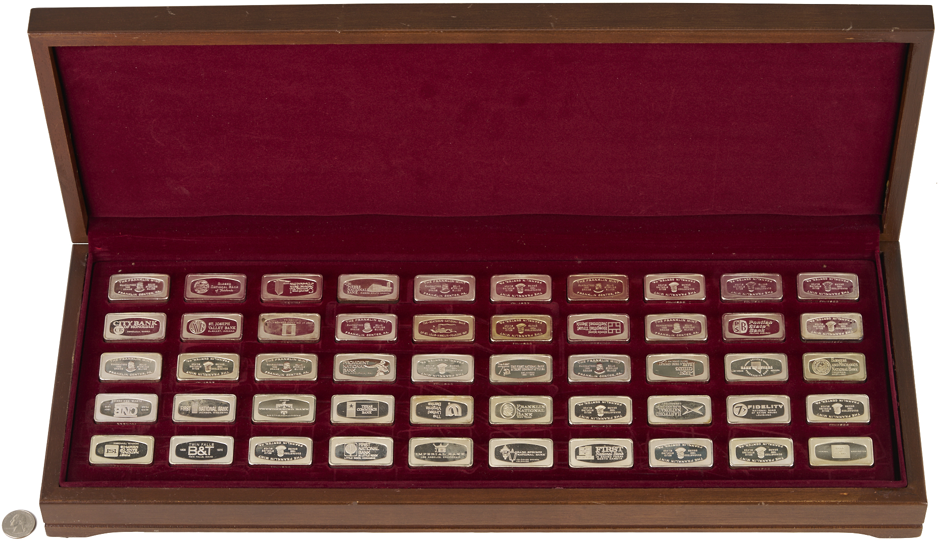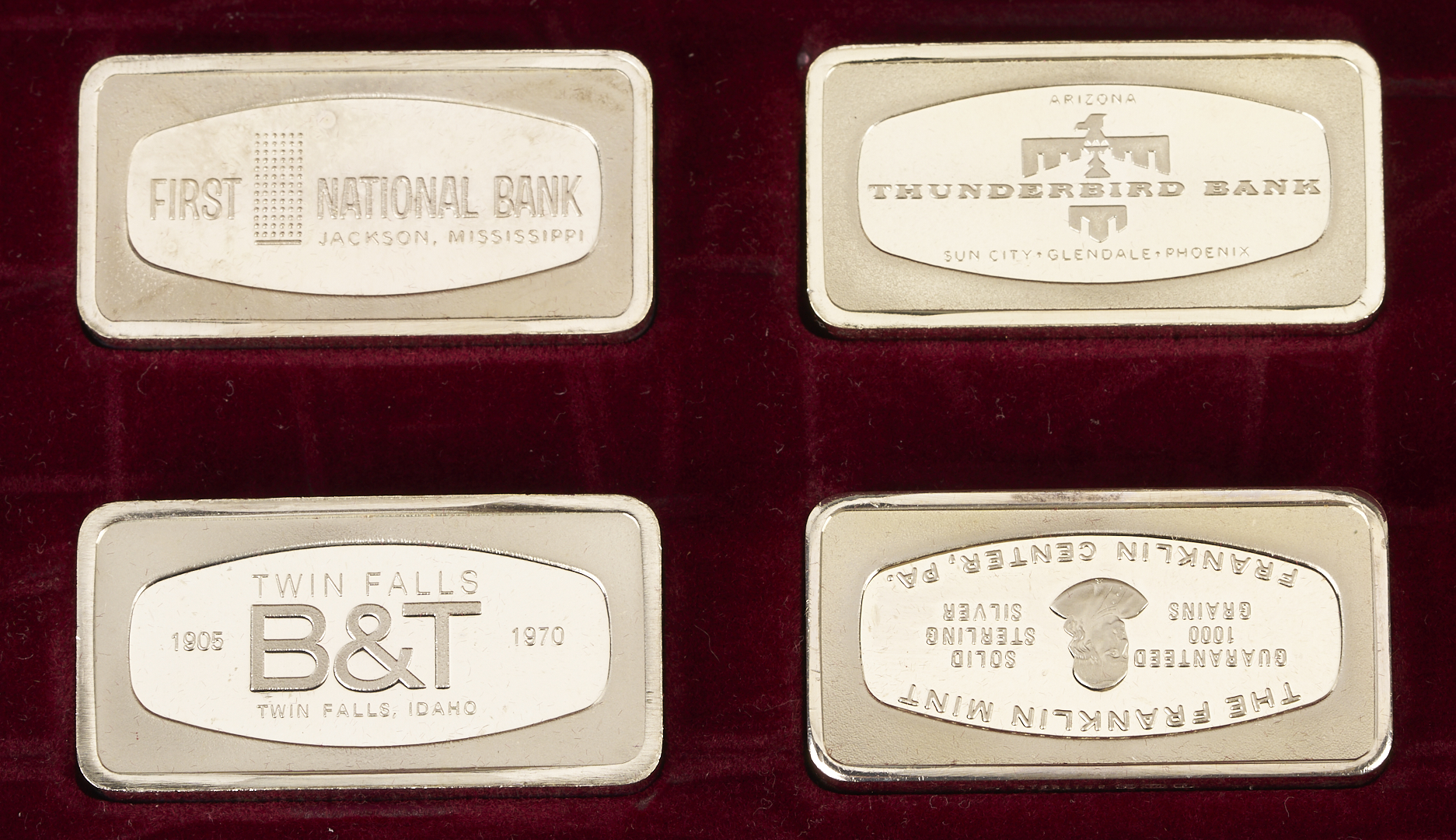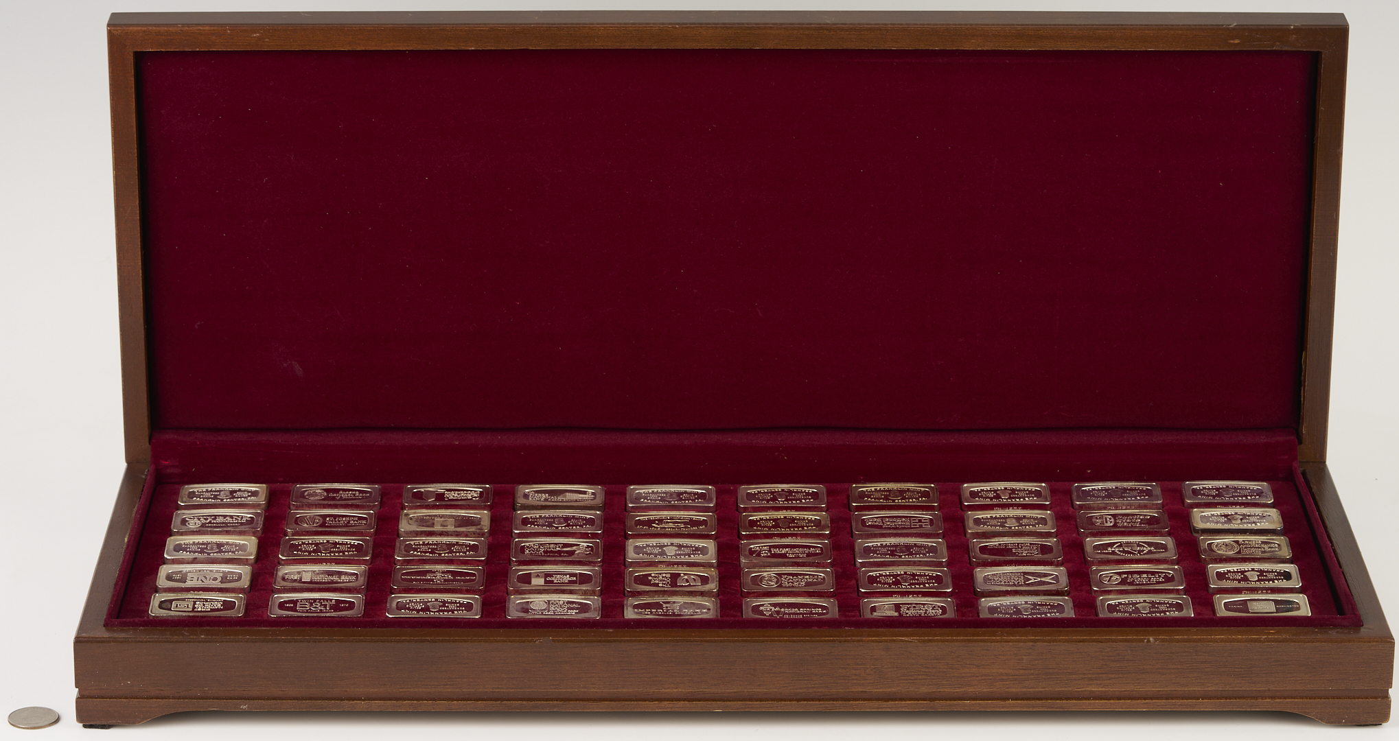 Limited Edition Franklin Mint sterling silver ingot set, consisting of 1000-grain (64.8 gram) ingots representing proofs of the first bankmarked sterling silver ingots issued in each of the 50 states of the Union. In the original presentation box with the Certificate of Authenticity, dated September 14, 1970. Ingots measure 7/8 in. x 1 3/4 in. and weigh 2.12 troy ounces. Box measures: 3 in. H x 24 1/4 in. W x 9 1/4 in. D. 106 total troy ounces.