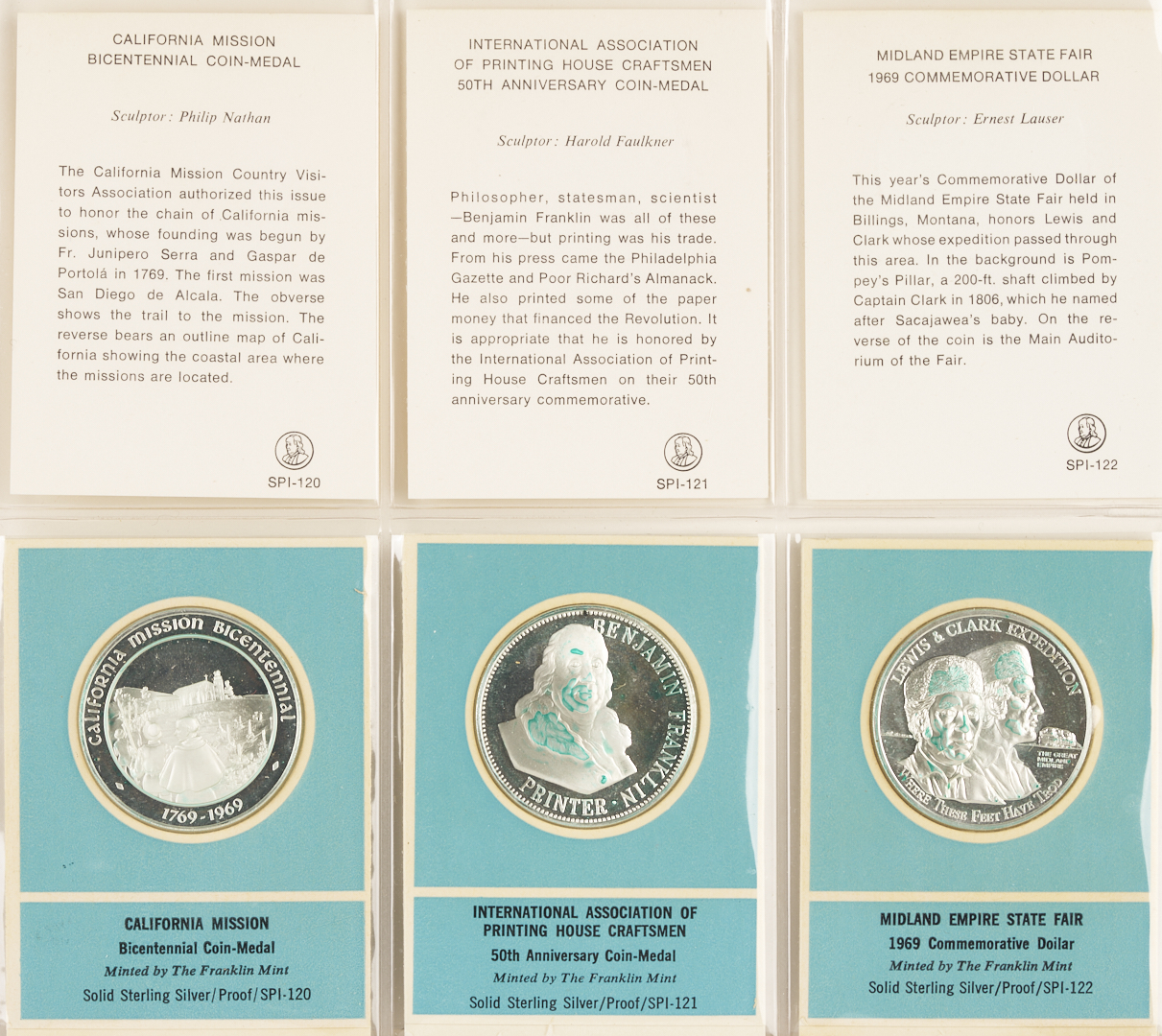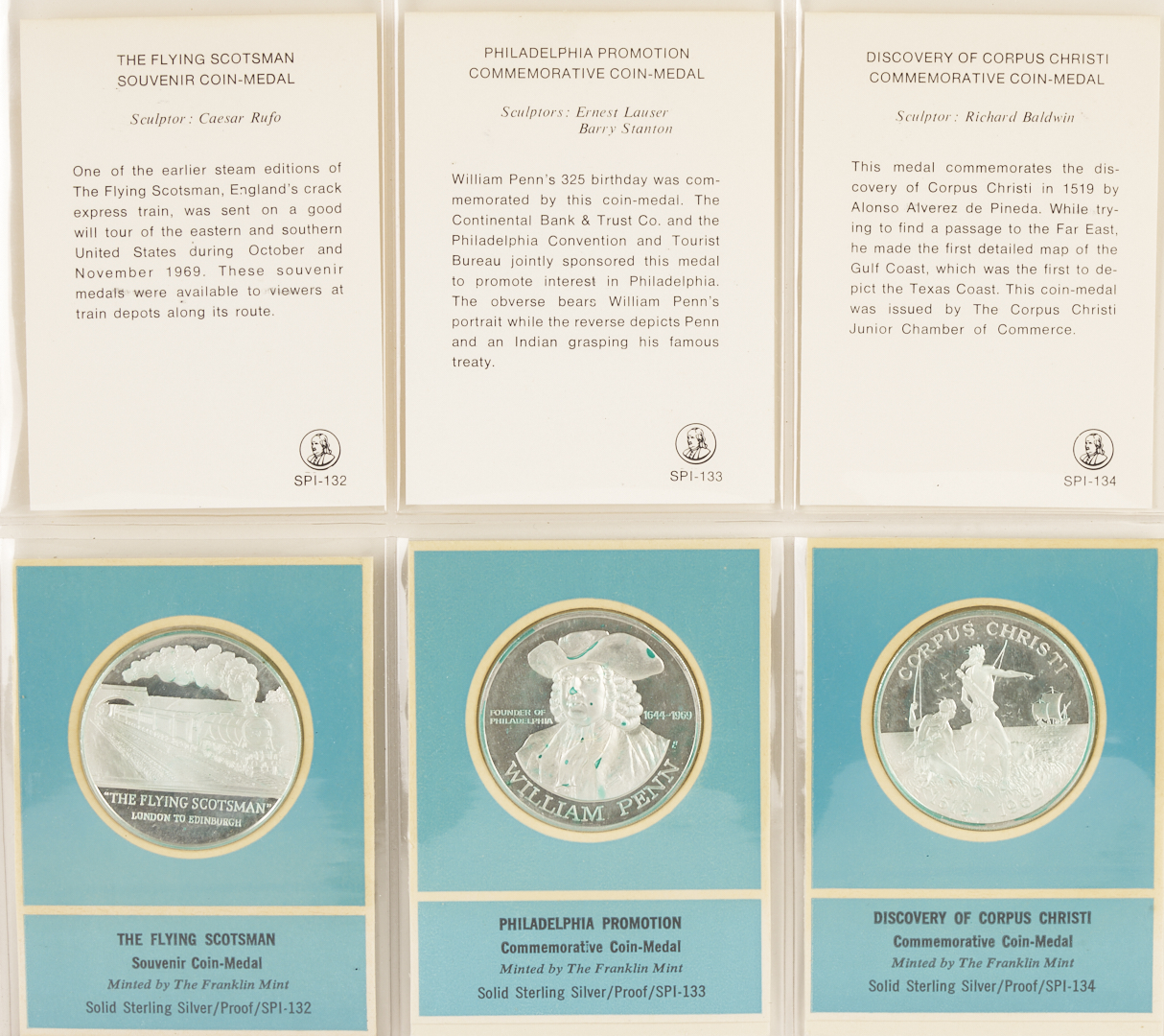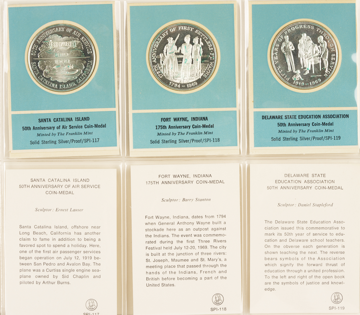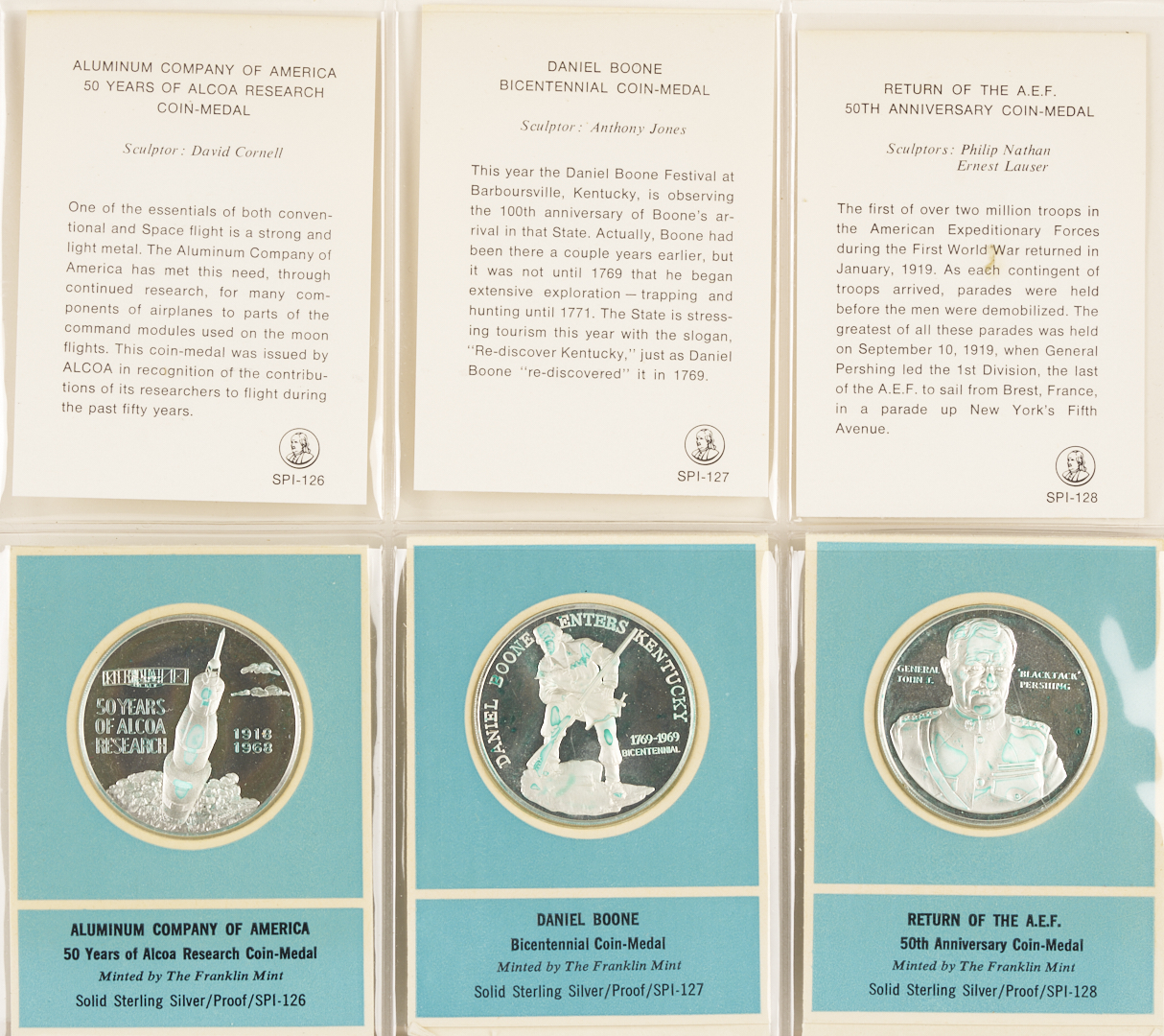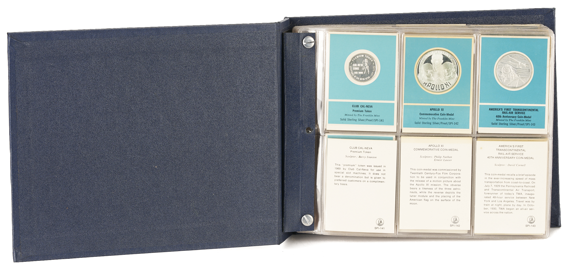 Fifty-one (51) Franklin Mint National Commemorative Society Special Private Issue First Edition Proof sterling silver rounds, housed in a navy blue album. Each round is accompanied by a brief write-up and depicts various artists, places, events, etc. in American history. Each round weighs approximately 0.6 troy ounces and measures approximately 1 in.– 1 1/2 in. (40 mm) in dia. Total weight: approx 30.6 troy ounces. Album measures: 10 in. L x 8 in. W x 2 in. D.